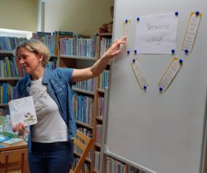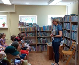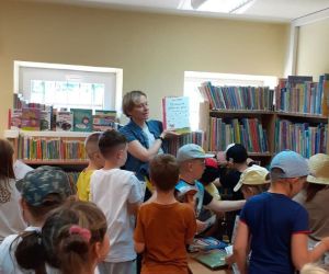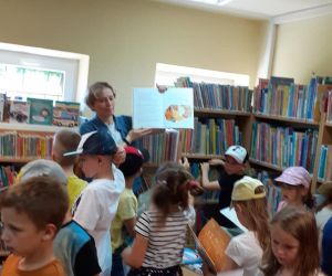Prowadząca opowiedziała także uczestnikom o ciekawych lekturach na wakacje i zachęciła je do samodzielnego czytania. Następnie pokazała małym czytelnikom ciekawe książeczki i książki o różnej wielkości, tematyce i kształtach, aby każdy mógł znaleźć coś dla siebie.