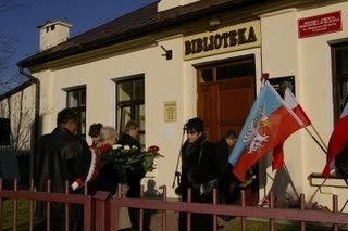 Tablica pamiątkowa poświęcona patronowi biblioteki.