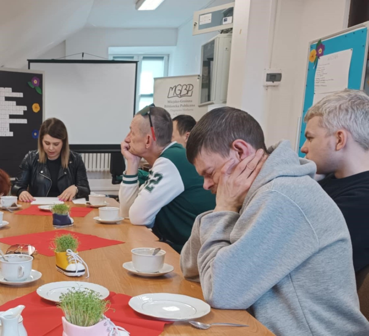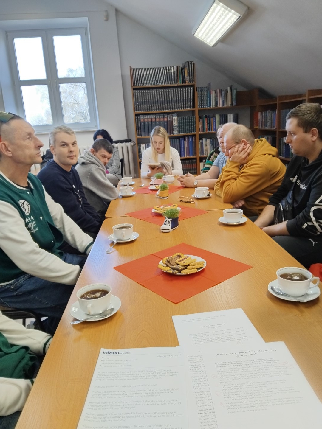26 marca 2025 r. w Bibliotece Głównej odbyło się spotkanie biblioterapeutyczne z Uczestnikami Środowiskowego Domu Samopomocy w Łęcznej, które miało na celu refleksję nad wiosną jako czasem odrodzenia, troski o naturę oraz o samego siebie. W trakcie zajęć uczestnicy zapoznali się z fragmentem książki „Ania z Zielonego Wzgórza”, który opisywał wiosnę, jako porę roku pełną nadziei, odnowy i piękna natury. Po przeczytaniu fragmentu odbyła się dyskusja, w której poruszyliśmy temat tego, jak wiosna może być inspiracją do zmiany na lepsze, zarówno w odniesieniu do otaczającej nas przyrody, jak i naszego samopoczucia.