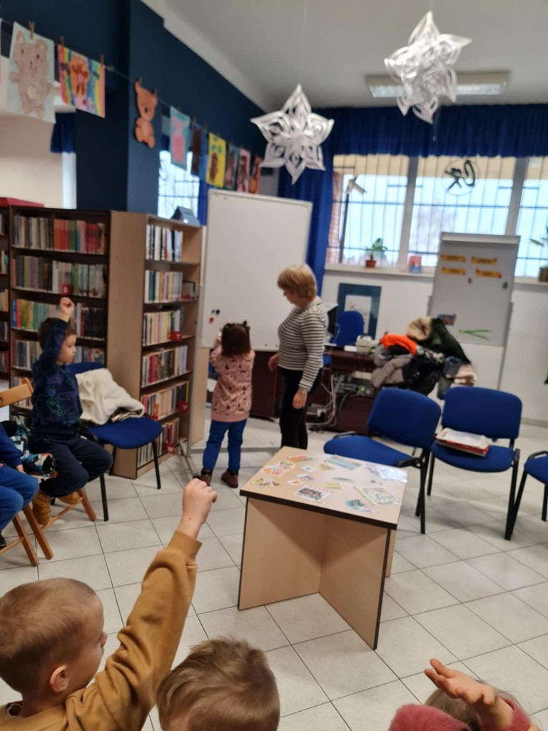9 grudnia Filię nr 2 odwiedziły dzieci z Przedszkola Publicznego nr 4 z grupy „Wiewiórki”. Bibliotekarka rozmawiała z przedszkolaki z o tym , z czym kojarzy się zima, w co się można bawić o tej porze roku i dlaczego zimą nie jeździmy na rolkach. Jak należy zachowywać się zimą w górach i dlaczego śnieg jest brudny, pomimo, że biały. W dalszej części spotkania dzieci wybierały z rozsypanki obrazki związane z zimą i przyczepiały je do planszy.