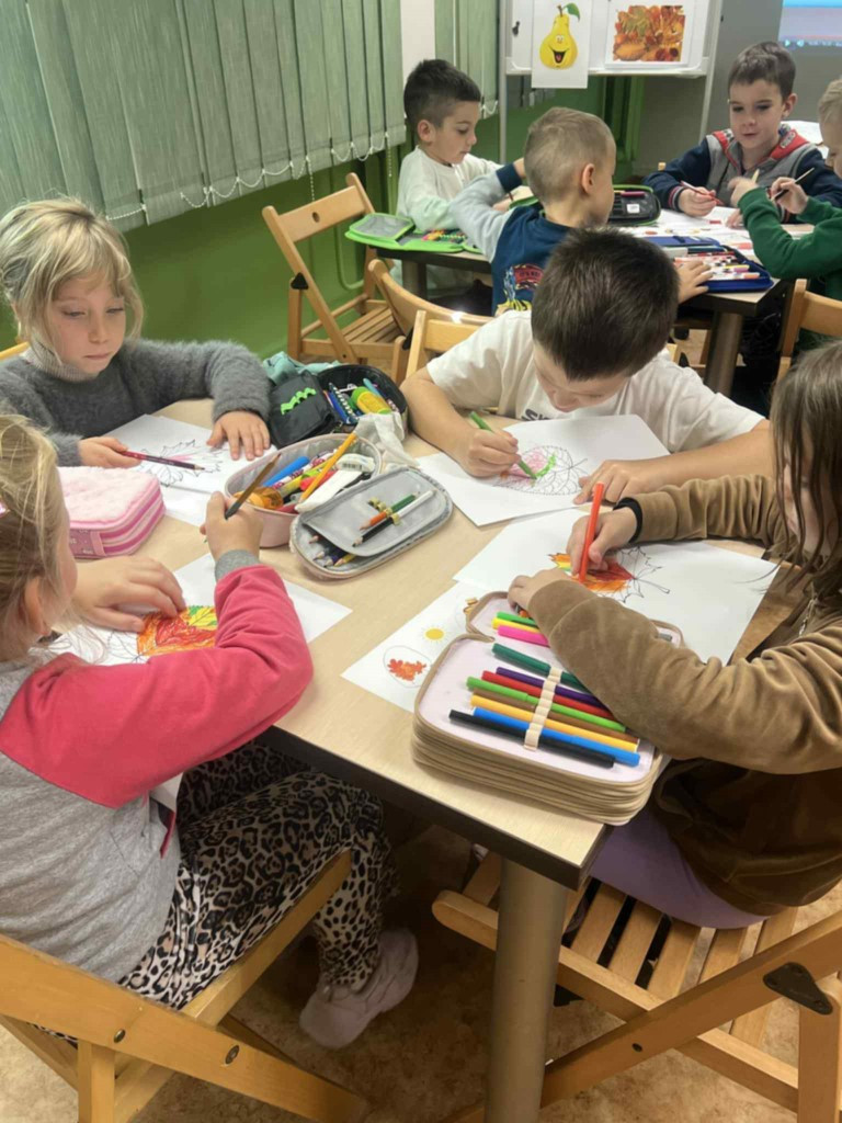 „ Jesienią, jesienią sady się rumienią, czerwone jabłuszka pomiędzy zielenią.” – Maria Konopnicka Gdy za oknem drzewa barwią się żółcią i czerwienią Filię nr 3 odwiedziła grupa 0D ze Szkoły Podstawowej nr 4 by wysłuchać fragmentu książki Anny Paszkiewicz pt. „ Jesienny las”, który stał się inspiracją do rozmowy o skarbach jesieni, zwierzętach mieszkających w lesie oraz o pysznych przetworach z jabłek czy śliwek. Były także różne zagadki oraz kolorowanie jesiennych liści które ozdobią naszą bibliotekę.