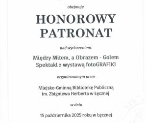 15 października 2025 r. w Dużej Synagodze w Łęcznej odbyło się wyjątkowe wydarzenie kulturalne zorganizowane wspólnie przez Miejsko-Gminną Bibliotekę Publiczną im. Zbigniewa Herberta w Łęcznej oraz Centrum Kultury w Łęcznej. Wieczór, zatytułowany „Między mitem a obrazem – Golem”, połączył w sobie teatr, sztukę wizualną i refleksję nad dziedzictwem kulturowym.