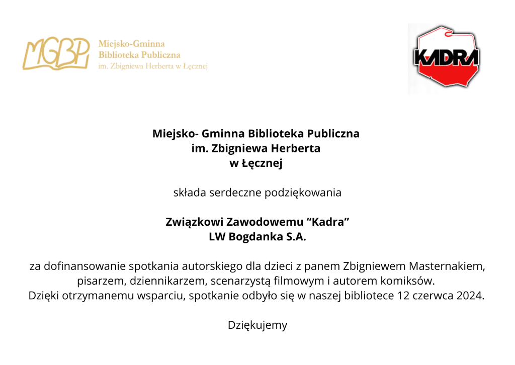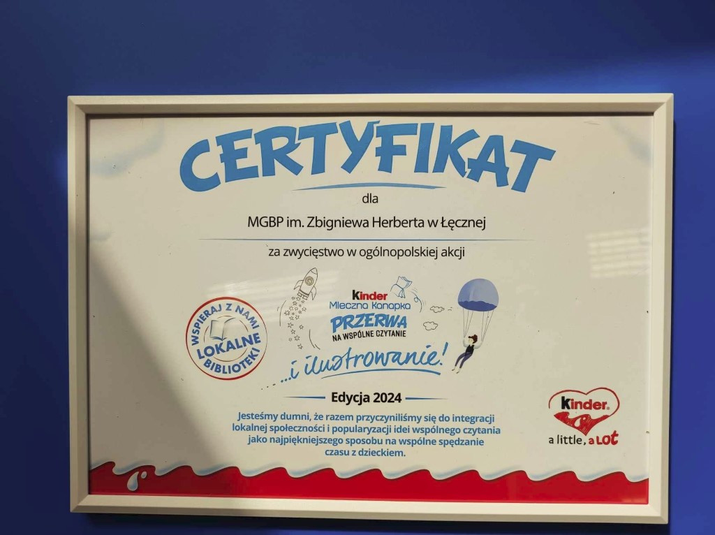 Miejsko-Gminna Biblioteka Publiczna im. Zbigniewa Herberta w Łęcznej - już po raz kolejny włączyła się w ogólnopolską akcję „Kinder Mleczna Kanapka - Przerwa na wspólne czytanie” zorganizowaną przez Kinder i wygrała nagrody. W tegorocznej edycji akcji - Biblioteka przy ul. Bożnicznej 21-wygrała stolik z krzesełkami oraz zestaw książek.