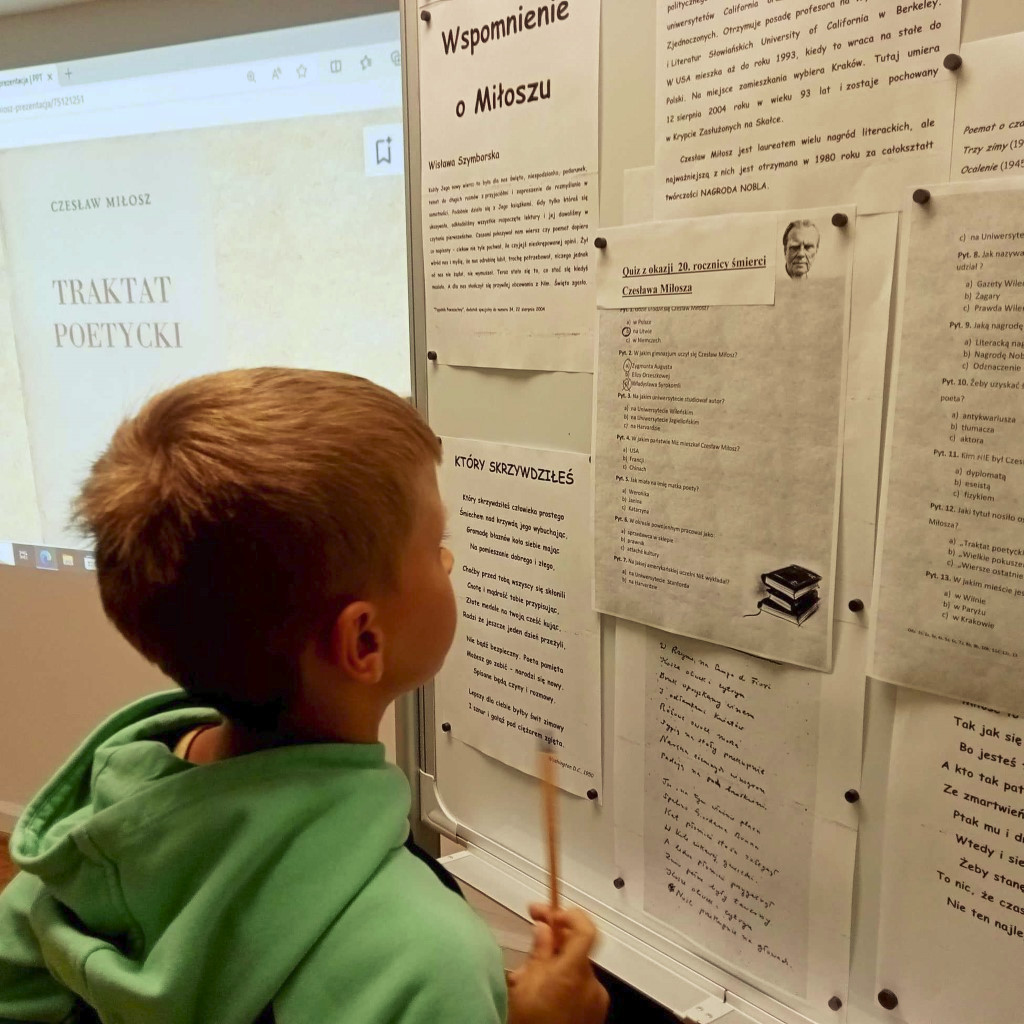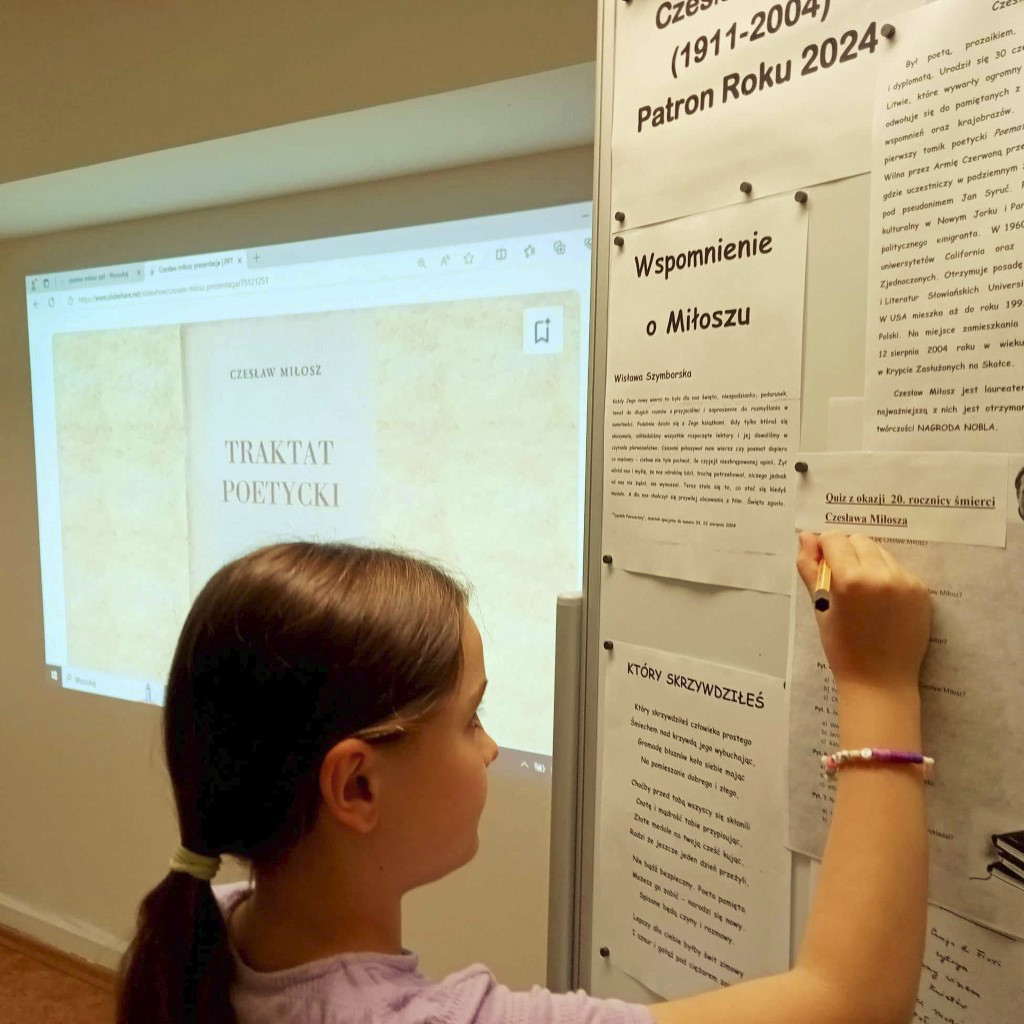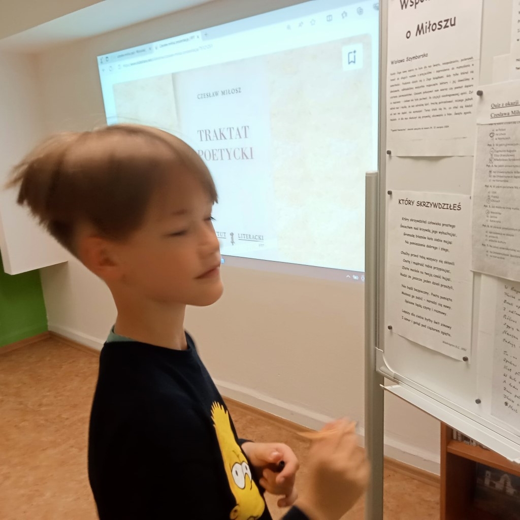 30 czerwca 2024 r. przypada 20. rocznica śmierci Czesława Miłosza. Ten znany i ceniony poeta jest również patronem roku 2024. Z tej okazji uczniowie klasy III b ze Szkoły Podstawowej nr 4 w Łęcznej wzięli udział w lekcji bibliotecznej w Filii nr 3. Nasi goście poznali najważniejsze wydarzenia z życia i twórczości autora oraz ciekawe wiersze i powieści poety. Pani Ewa opowiedziała dzieciom o wszechstronności polskiego noblisty i przeczytała uczestnikom wiersze pt.: „Przypowieść o maku”, „Sens”, „Przy piwoniach” oraz „ Który skrzywdziłeś”. Prowadząca przeplatała czytanie wierszy - prezentacją o Czesławie Miłoszu i opowiadaniem ciekawostek z życia autora. Prowadząca wspomniała też uczestnikom o znaczeniu powieści „Zniewolony umysł” i „Dolina Issy”. Na zakończenie uczniowie wzięli udział w quizie poświęconym życiu i twórczości poety.