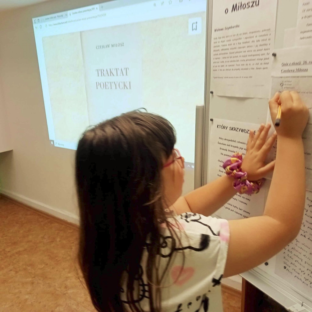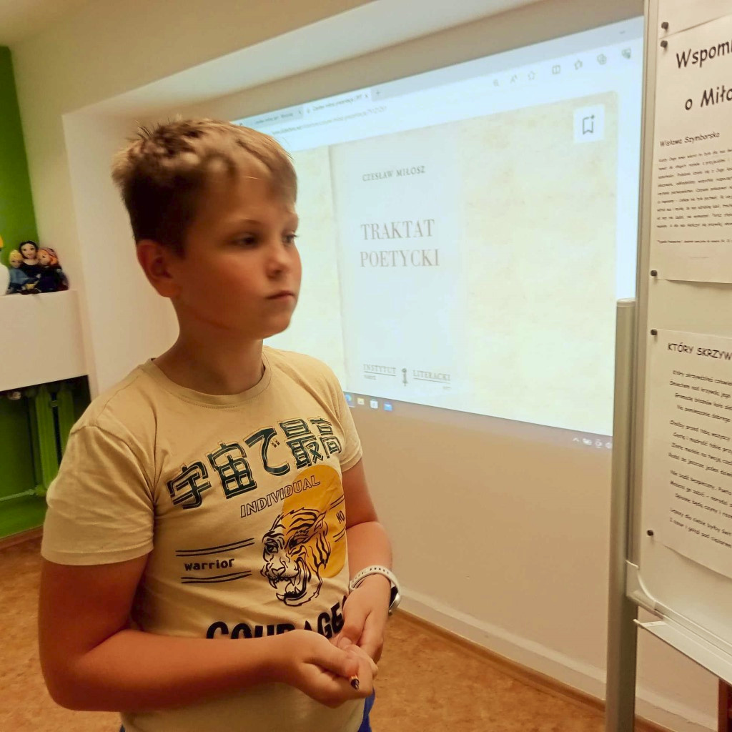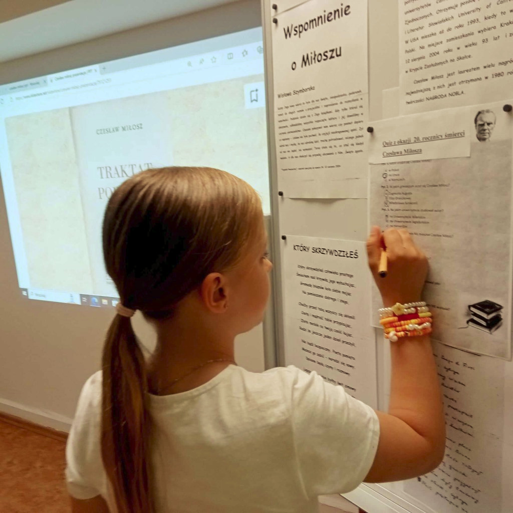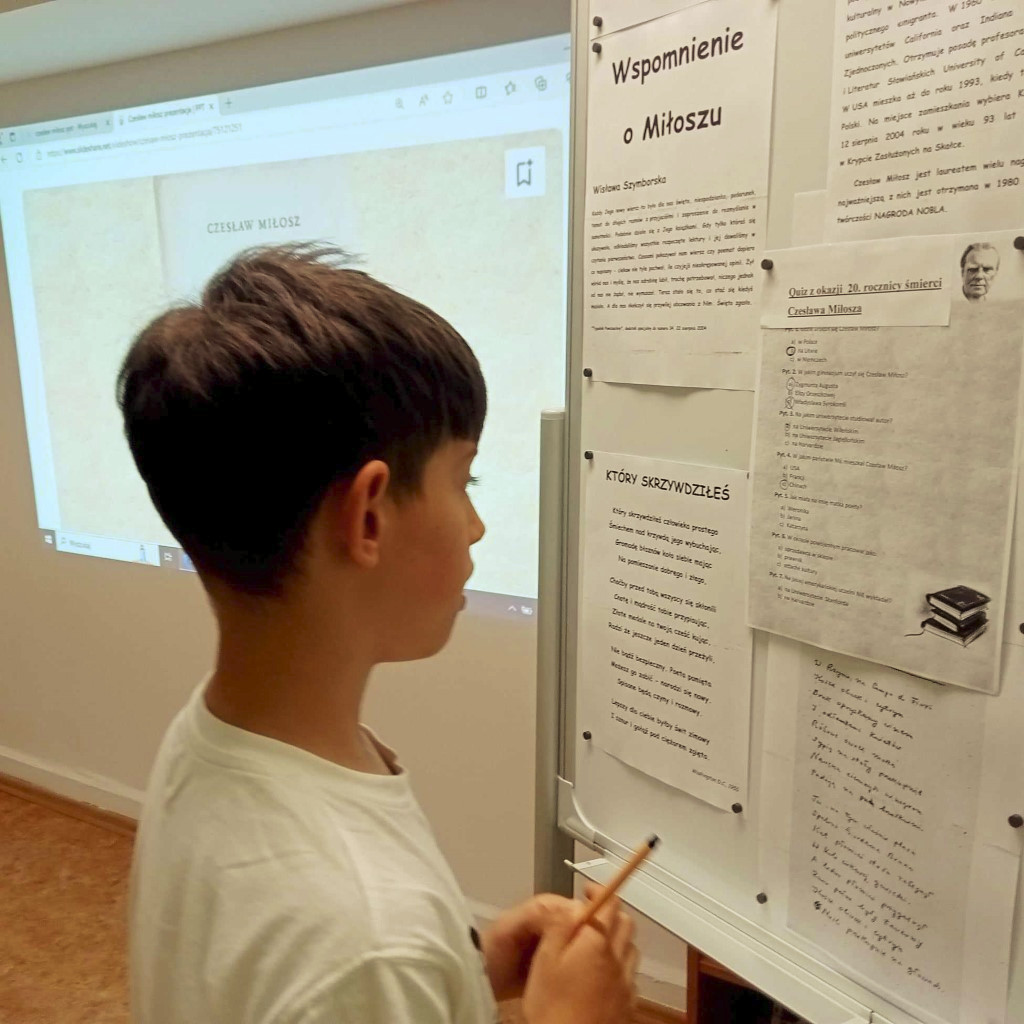 30 czerwca 2024 r. przypada 20. rocznica śmierci Czesława Miłosza. Ten znany i ceniony poeta jest również patronem roku 2024. Z tej okazji uczniowie klasy III b ze Szkoły Podstawowej nr 4 w Łęcznej wzięli udział w lekcji bibliotecznej w Filii nr 3. Nasi goście poznali najważniejsze wydarzenia z życia i twórczości autora oraz ciekawe wiersze i powieści poety. Pani Ewa opowiedziała dzieciom o wszechstronności polskiego noblisty i przeczytała uczestnikom wiersze pt.: „Przypowieść o maku”, „Sens”, „Przy piwoniach” oraz „ Który skrzywdziłeś”. Prowadząca przeplatała czytanie wierszy - prezentacją o Czesławie Miłoszu i opowiadaniem ciekawostek z życia autora. Prowadząca wspomniała też uczestnikom o znaczeniu powieści „Zniewolony umysł” i „Dolina Issy”. Na zakończenie uczniowie wzięli udział w quizie poświęconym życiu i twórczości poety.