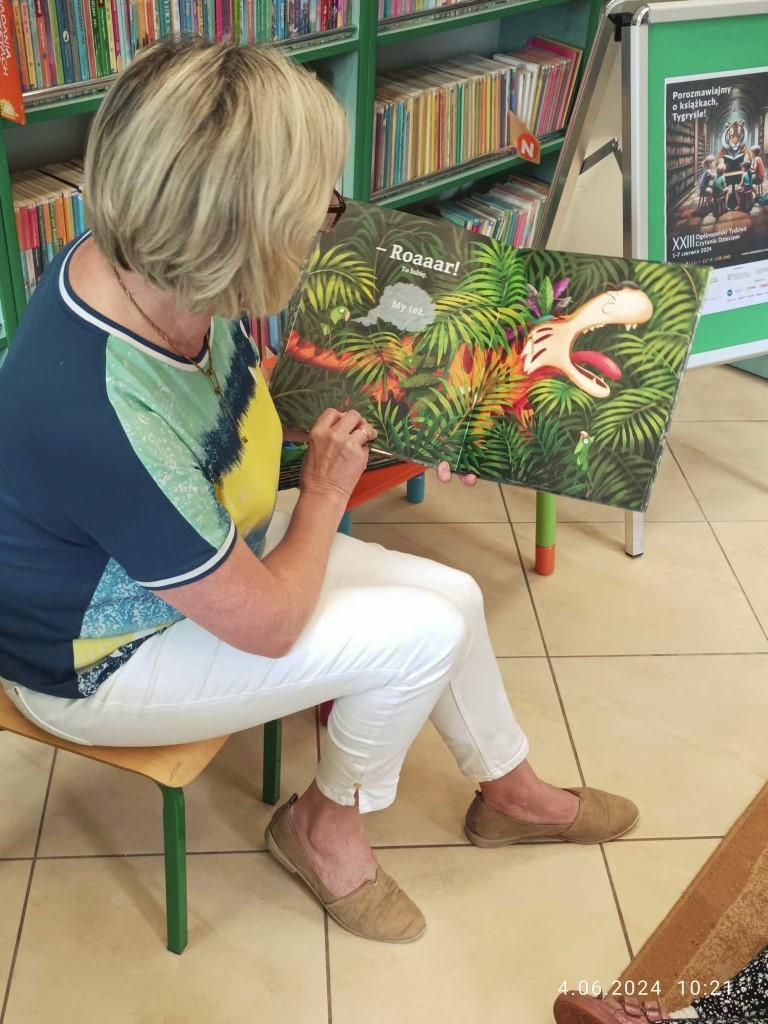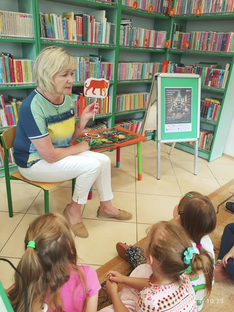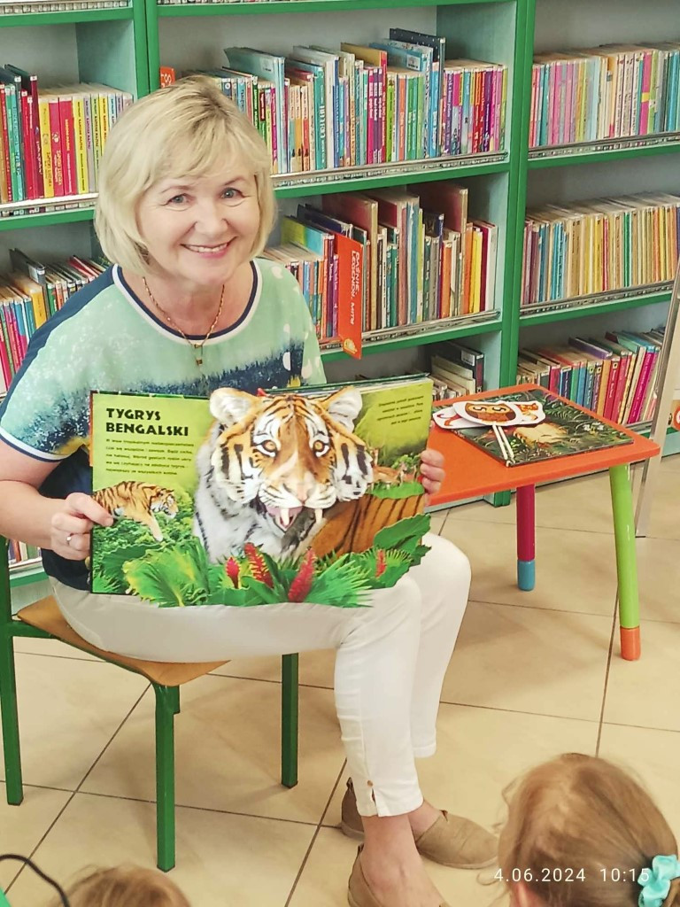 Następnie dzieci miały okazję posłuchać odgłosów tygrysa z książki "Dzikie zwierzęta" oraz wiersza „Tygrys w bibliotece”, z którego dowiedziały się, że „mądrość wzrasta od czytania”.