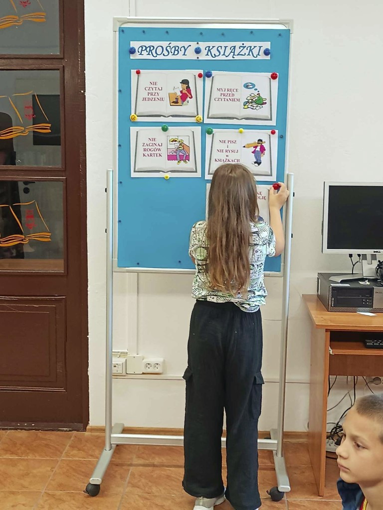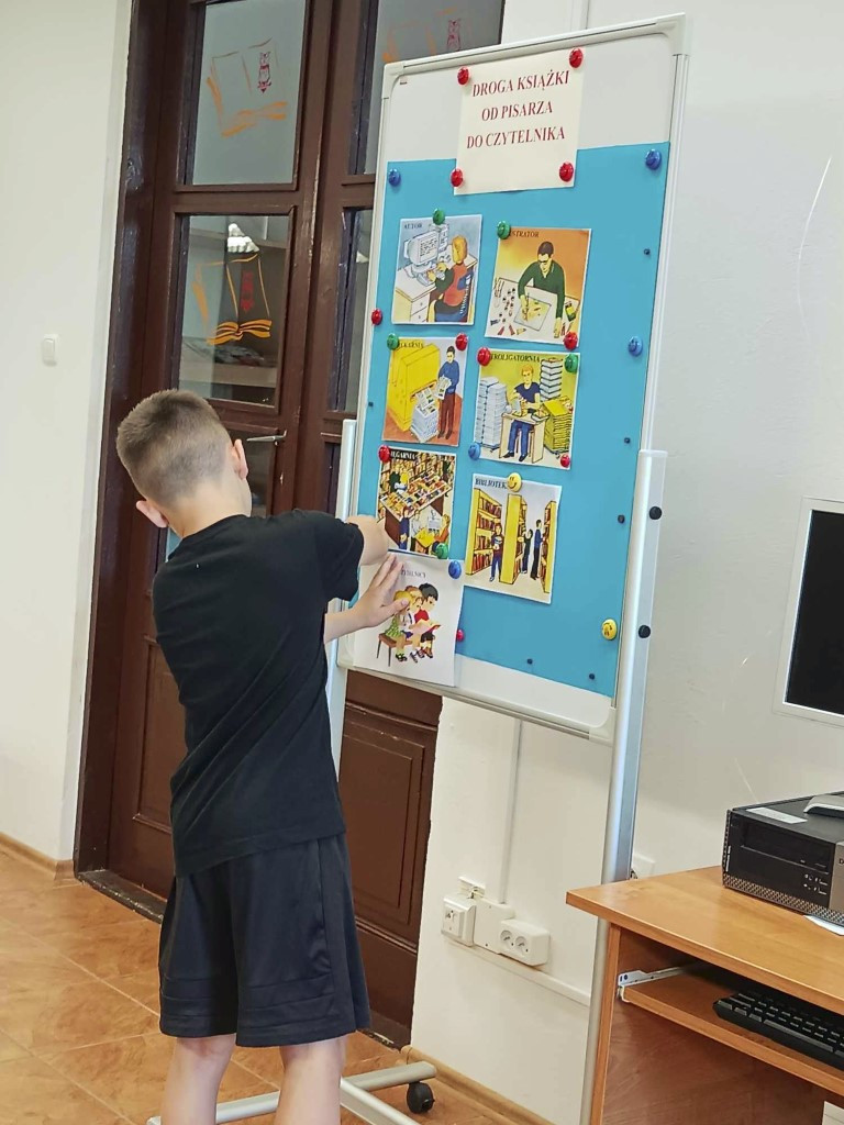 Podczas spotkania był czas na zagadki, zabawę w skojarzenia oraz recytację wiersza z rekwizytami. Uczniowie poznali drogę książki od pisarza do czytelnika, prośby książki oraz ciekawostki biblioteczne np: najstarszą , najmniejszą , największą czy najgrubszą książkę znajdującą się w naszej Bibliotece. Ważnym momentem było obejrzenie filmu pt. „Warto czytać”, który pozwolił zrozumieć, że czytanie książek to nie tylko rozrywka, to przede wszystkim odkrywanie i poznawanie czegoś nowego.