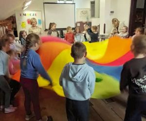 Podczas spotkania był czas na oglądanie bajki teatrzyku Kamishibai pt. Złotowłosa i trzy misie", zabawę z chustą Klanzy oraz tworzenie pajęczyny przyjaźni.