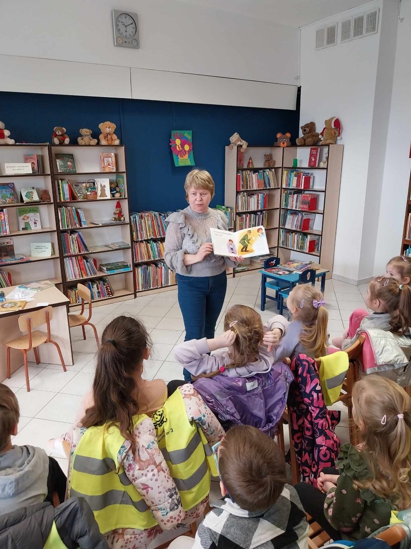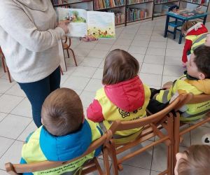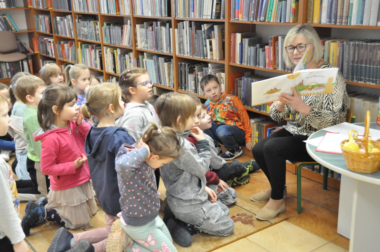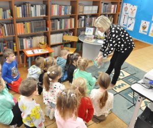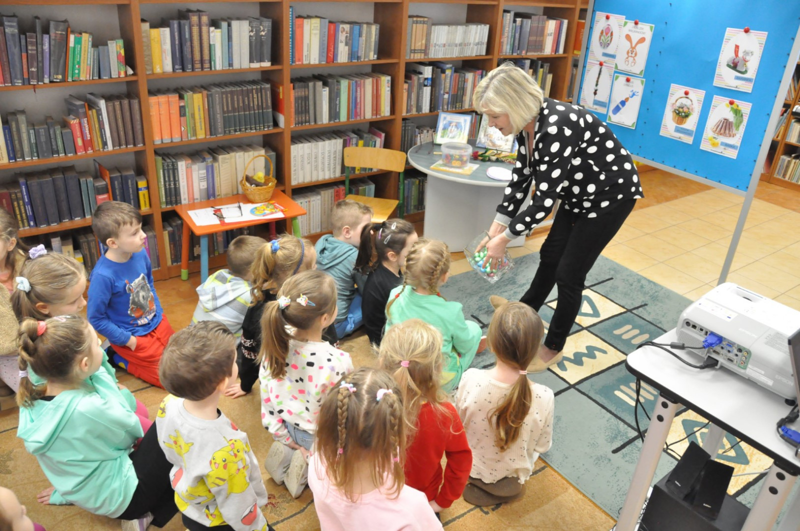 Na początku zajęć Bibliotekarka rozmawiała z przedszkolakami o wiośnie. Przeczytała im wiersz o tej porze roku. Następnie dzieci wspólnie z Bibliotekarką „czytały” wiersz „Rzepka” Juliana Tuwima. Na zakończenie spotkania przedszkolaki losowały pytania związane ze Świętami Wielkanocnymi, a potem wypożyczyły książeczki do domu.
