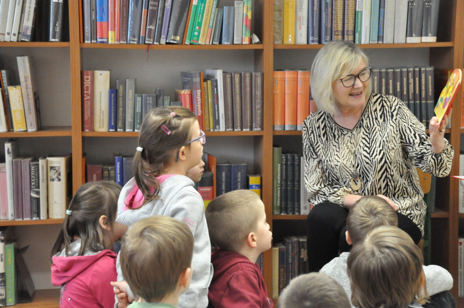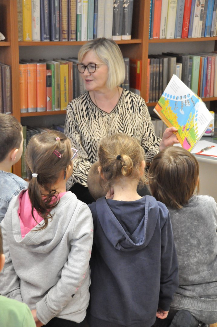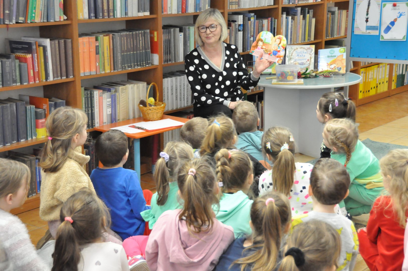 Na początku zajęć Bibliotekarka rozmawiała z przedszkolakami o wiośnie. Przeczytała im wiersz o tej porze roku. Następnie dzieci wspólnie z Bibliotekarką „czytały” wiersz „Rzepka” Juliana Tuwima. Na zakończenie spotkania przedszkolaki losowały pytania związane ze Świętami Wielkanocnymi, a potem wypożyczyły książeczki do domu.