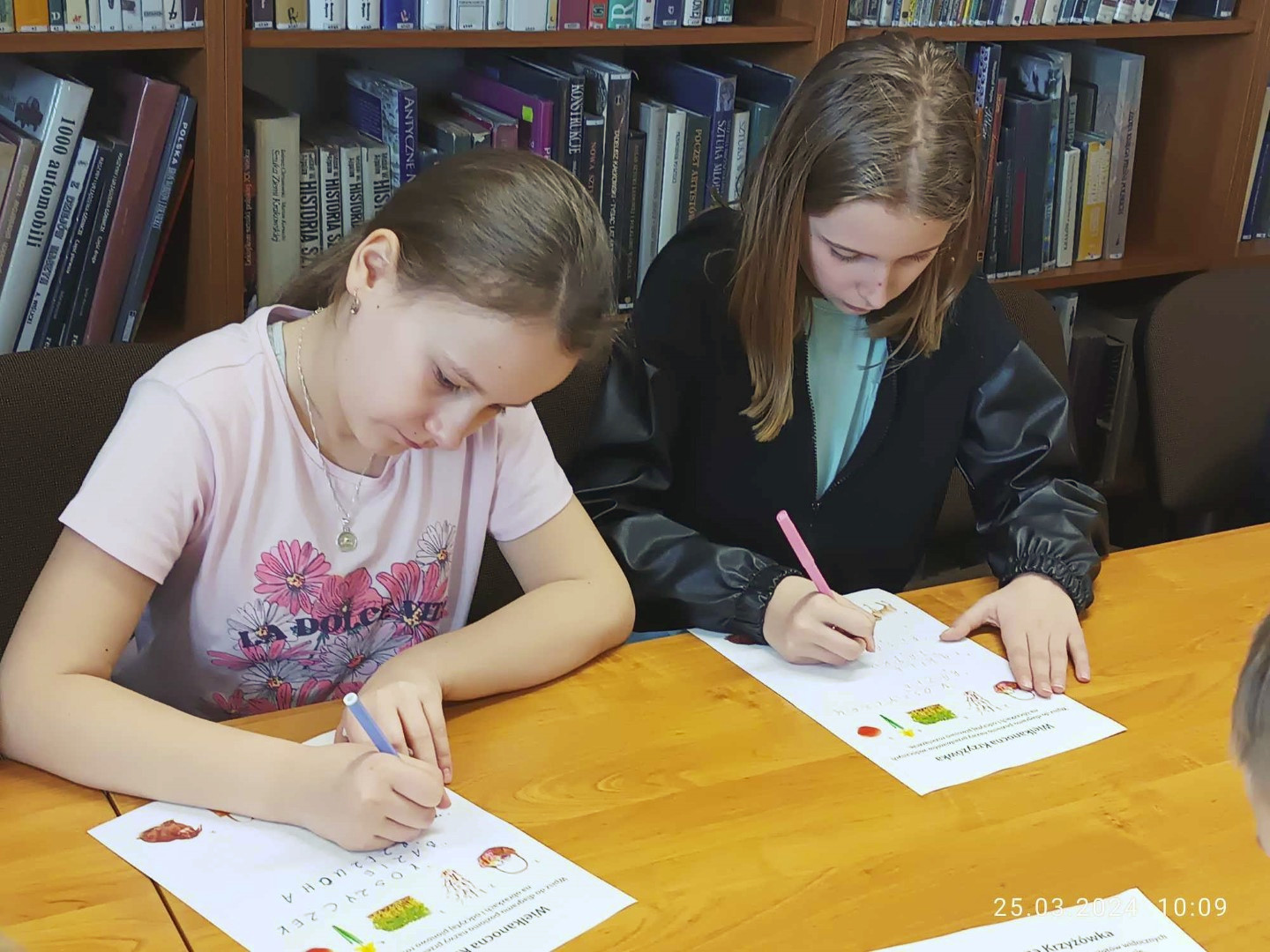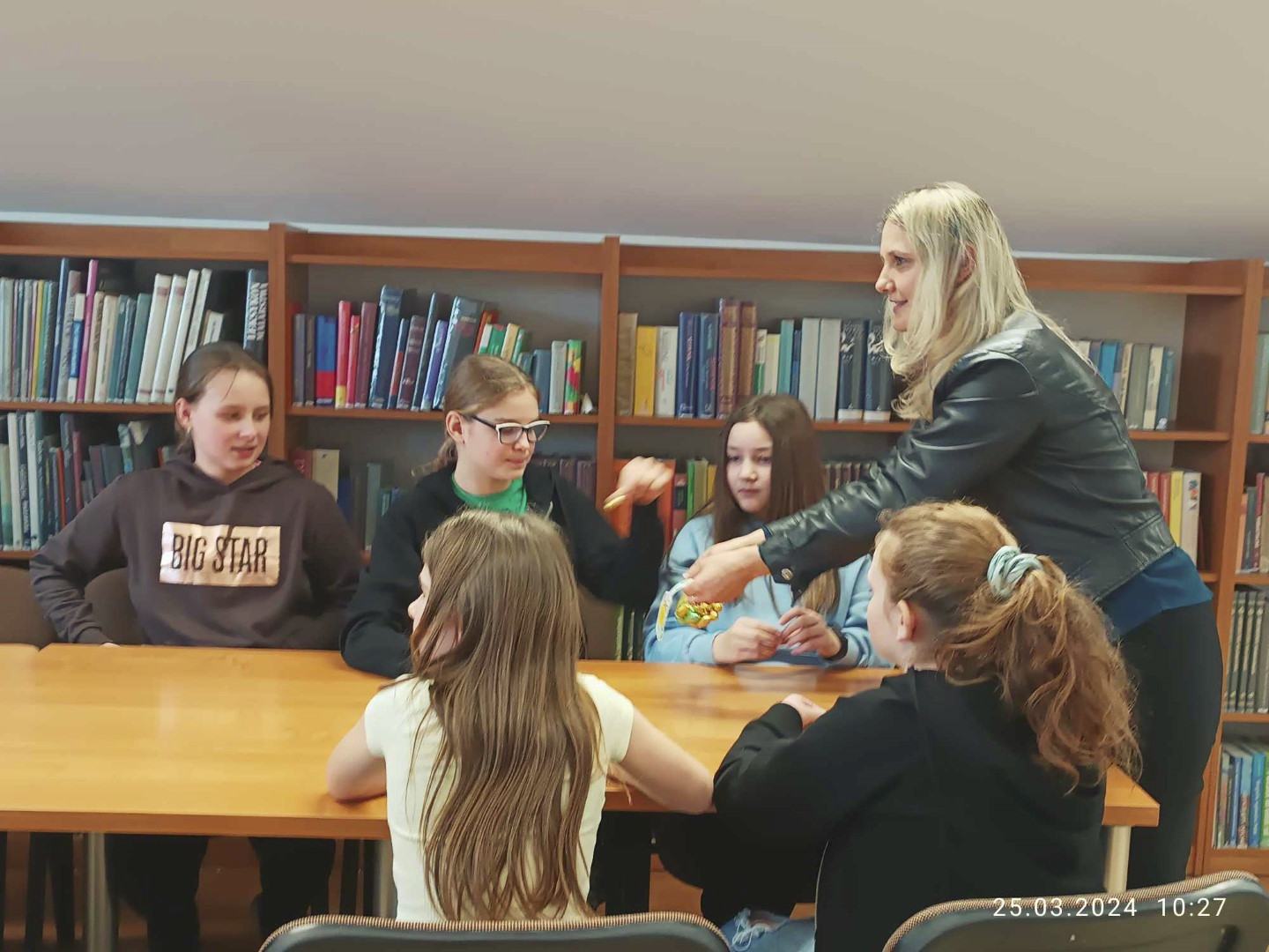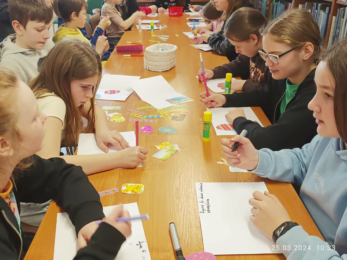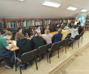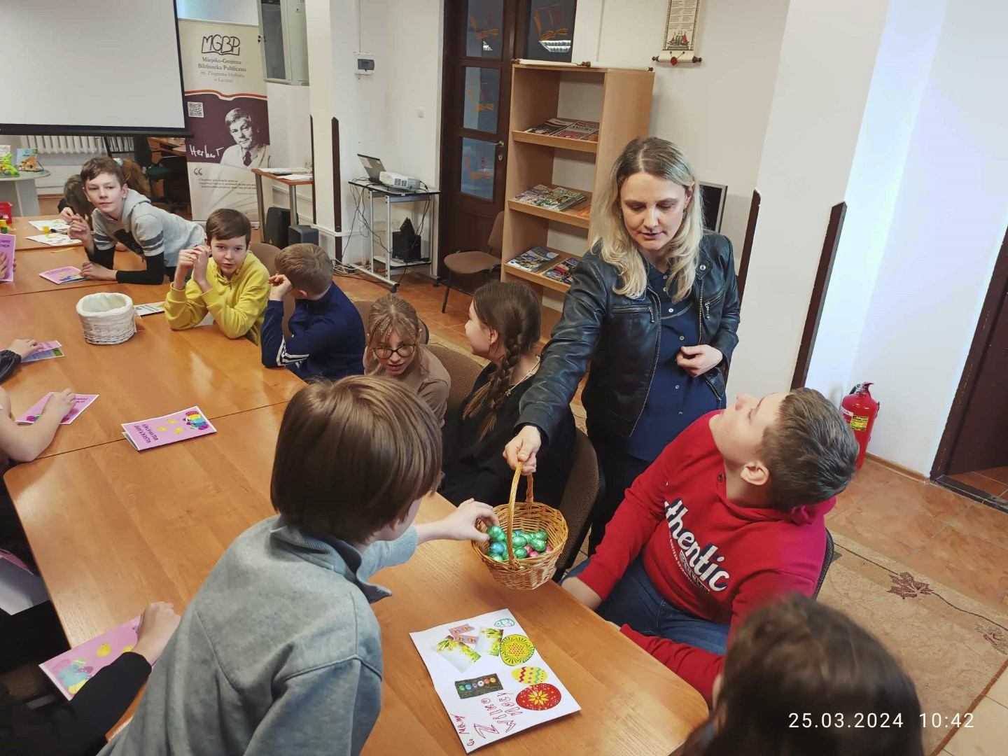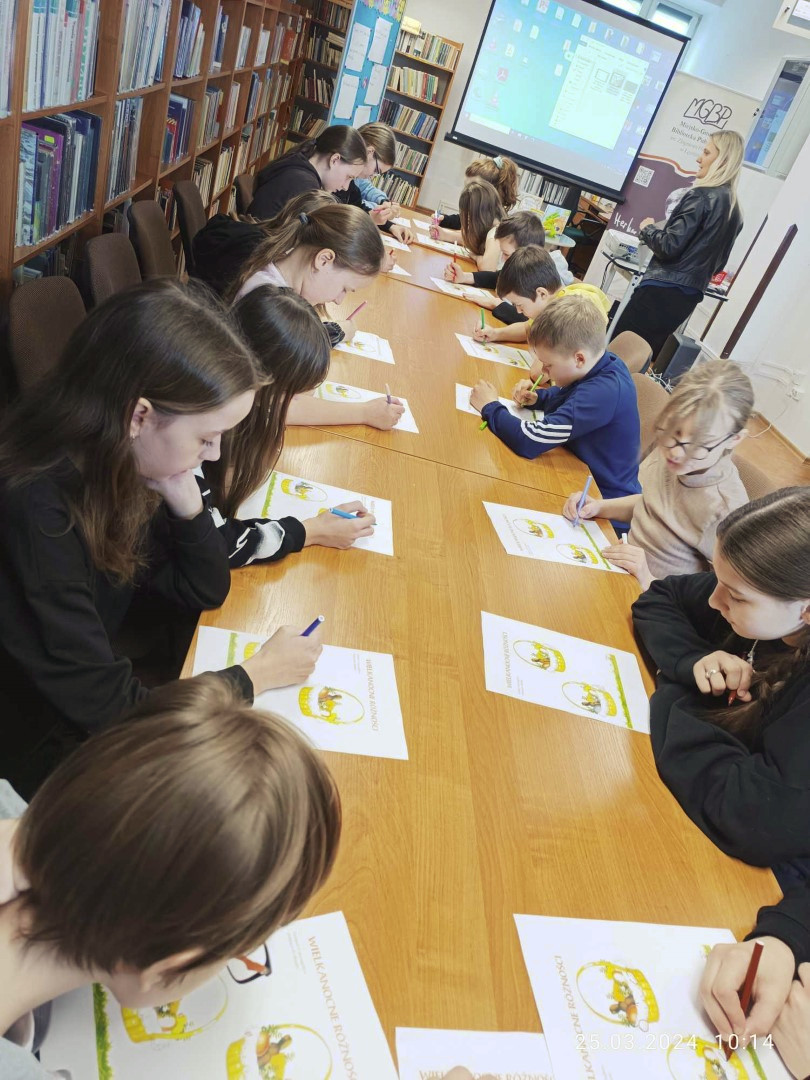 W dniu 25.03.2023 r. Bibliotekę Główną odwiedziła klasa 5 F ze Szkoła Podstawowa nr 2 w Łęcznej wraz z wychowawcą . Uczniowie wzięli udział w zajęciach dotyczących Świąt Wielkanocnych. Dzieci opowiadały z czym kojarzą im się święta Wielkiej Nocy, obejrzały film dotyczący tradycji wielkanocnych oraz wspólnie czytały książkę pt. „Wielkanoc”. Następnie uczniowie rozwiązywali krzyżówki z hasłami dotyczącymi nadchodzących Świąt i odnajdywali różnice na obrazkach wielkanocnych. Osoby, które najszybciej wykonały zadania otrzymały figurki z czekolady. Był też czas na zawody ruchowe polegające na noszeniu pisanek z czekolady na łyżkach. Na koniec zajęć uczniowie wykonywali kartki wielkanocne, które zabrali ze sobą do domu.