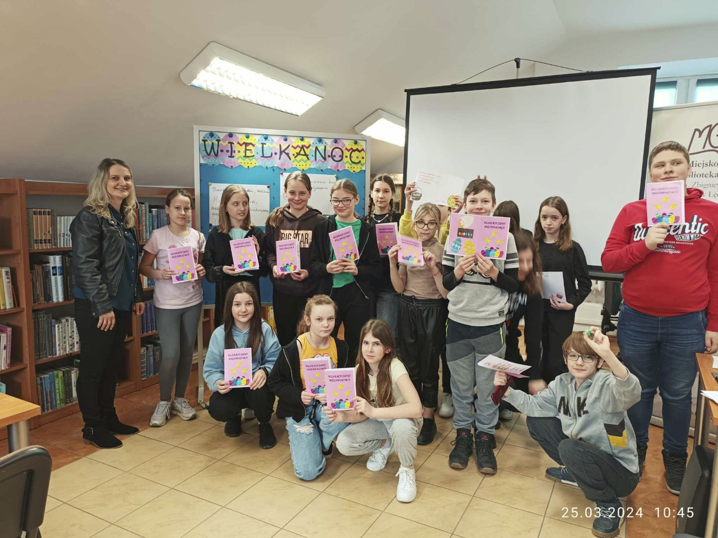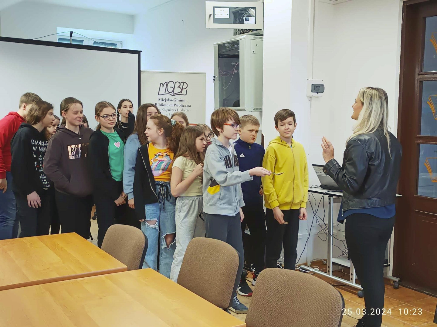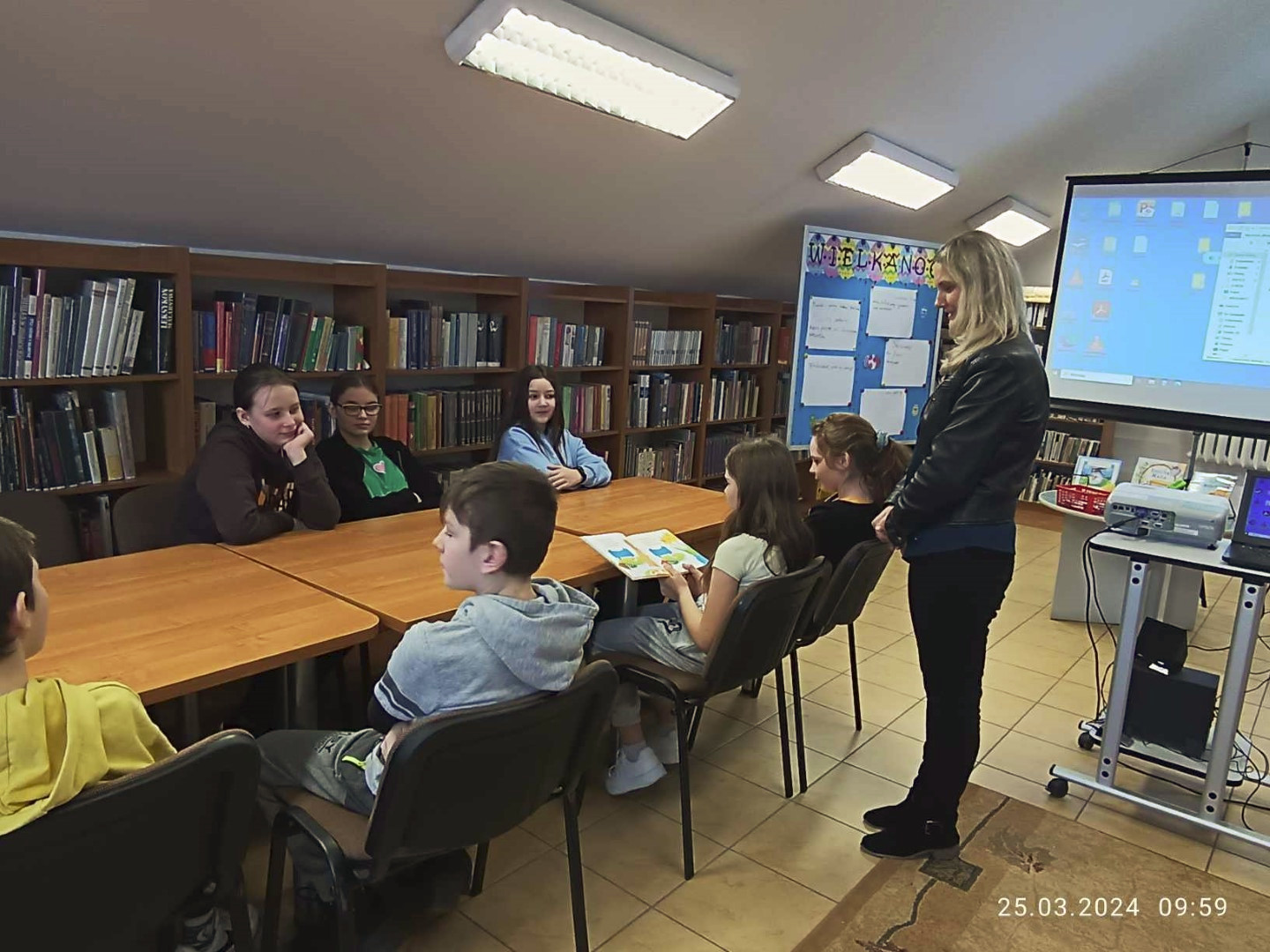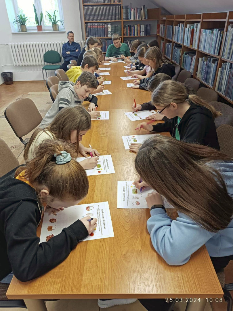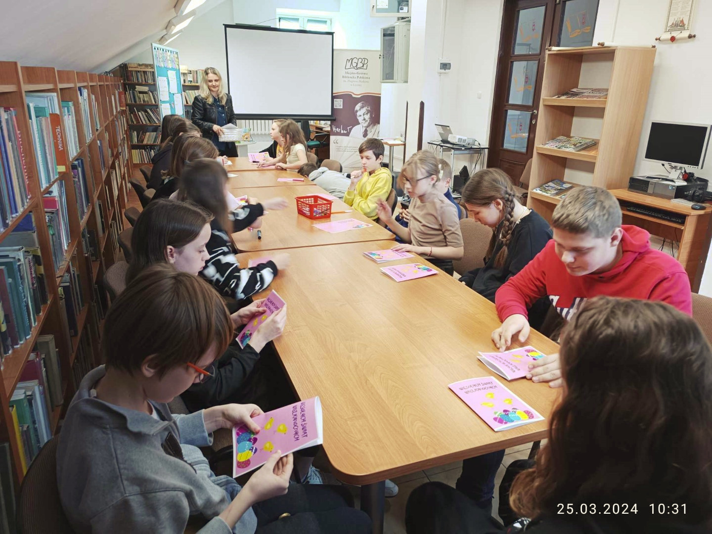W dniu 25.03.2023 r. Bibliotekę Główną odwiedziła klasa 5 F ze Szkoła Podstawowa nr 2 w Łęcznej wraz z wychowawcą . Uczniowie wzięli udział w zajęciach dotyczących Świąt Wielkanocnych. Dzieci opowiadały z czym kojarzą im się święta Wielkiej Nocy, obejrzały film dotyczący tradycji wielkanocnych oraz wspólnie czytały książkę pt. „Wielkanoc”. Następnie uczniowie rozwiązywali krzyżówki z hasłami dotyczącymi nadchodzących Świąt i odnajdywali różnice na obrazkach wielkanocnych. Osoby, które najszybciej wykonały zadania otrzymały figurki z czekolady. Był też czas na zawody ruchowe polegające na noszeniu pisanek z czekolady na łyżkach. Na koniec zajęć uczniowie wykonywali kartki wielkanocne, które zabrali ze sobą do domu.