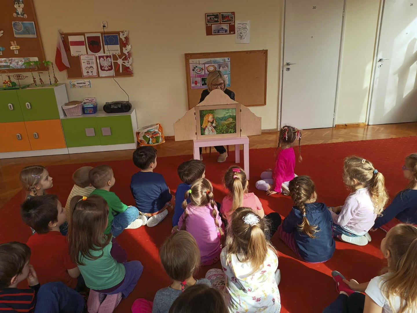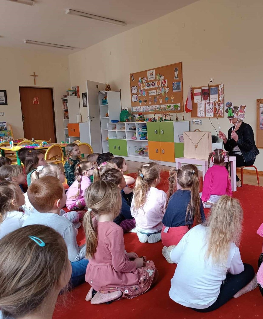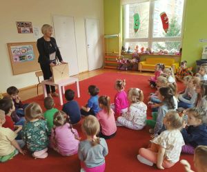 W trakcie spotkania dzieci wysłuchały bajeczek teatrzyku Kamishibai pt. „Kotka Psotka” oraz "Złotowłosa i trzy misie". Przedszkolaki z ogromnym zainteresowaniem śledziły przygody bohaterów ukrytych w magicznej skrzynce.