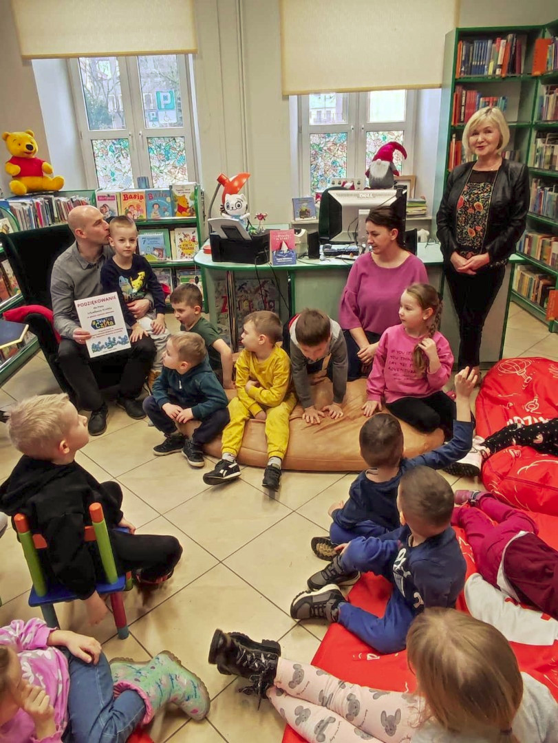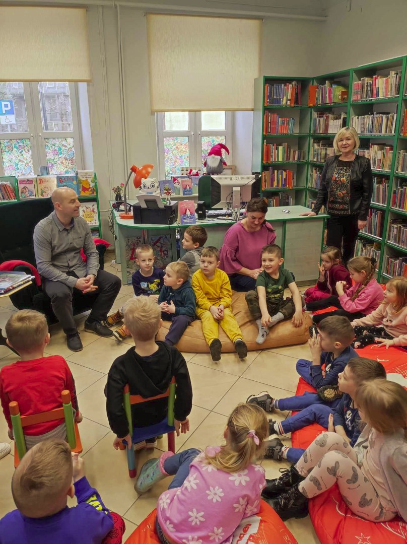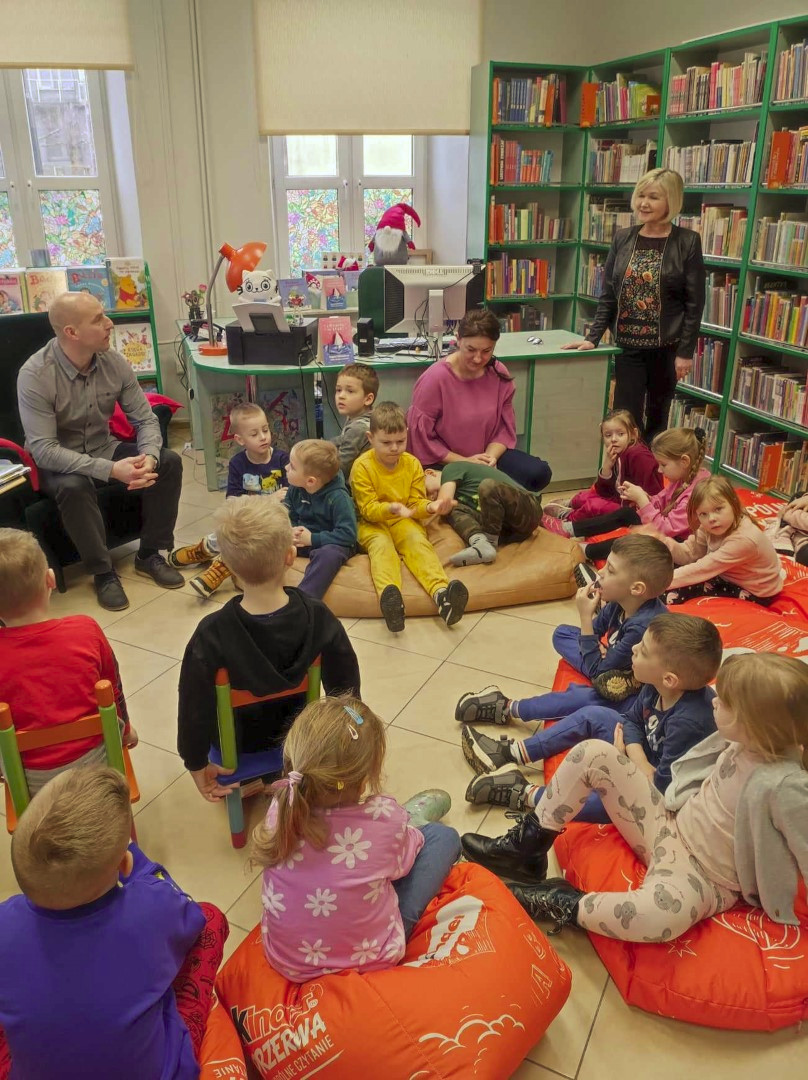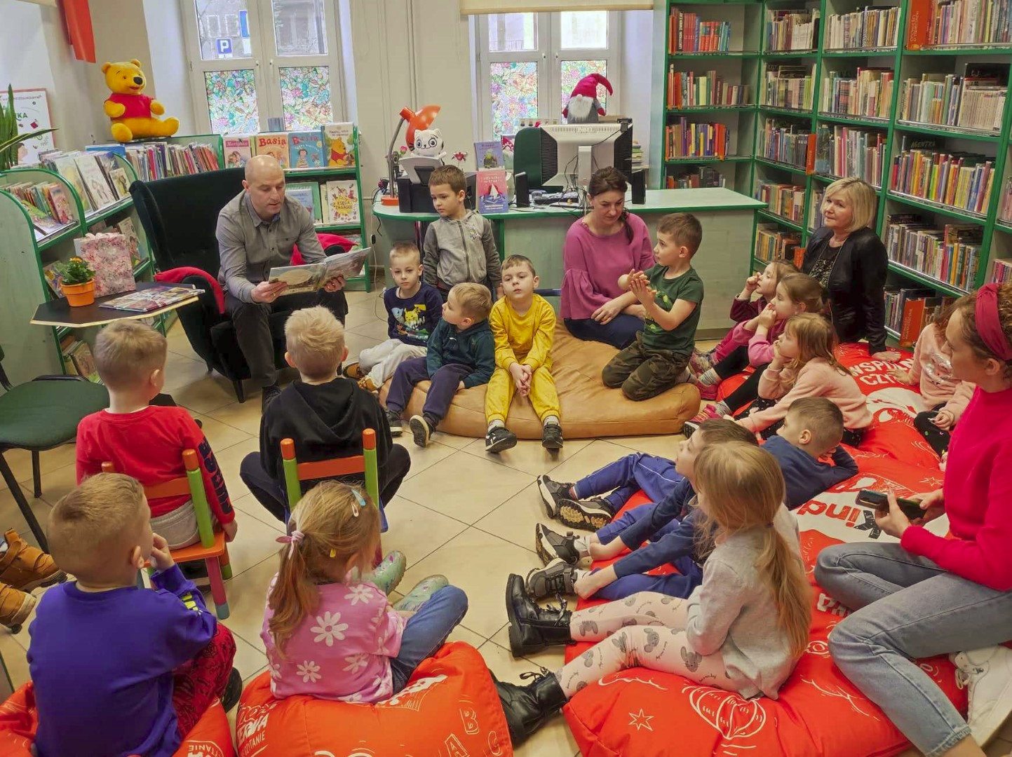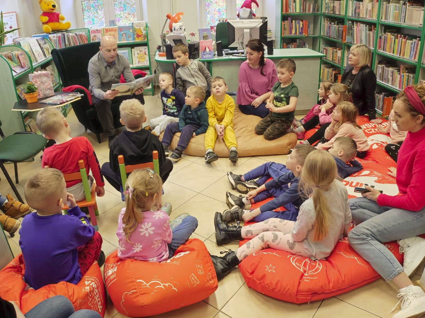 W dniu 5 marca 2024 r. spotkaliśmy się w Bibliotece przy ul. Bożnicznej 21, z dziećmi z grupy "Krasnoludki" z Przedszkole Publiczne Nr 1 w Łęcznej na głośnym czytaniu. Do czytania dzieciom zaprosiliśmy Pana Arkadiusza Wróbla, tatę Tymona. Pan Arkadiusz, który bardzo często przychodzi ze swoimi synami do biblioteki, z wielką przyjemnością przeczytał dzieciom książkę pt. „Tata Oli i piłkarska gorączka". Przedszkolaki z ogromnym zainteresowaniem słuchały przezabawnej opowieści o wyjątkowo śmiesznym tacie, który za bardzo angażował się w grę swojej córki i z tego powodu wynikały przezabawne sytuacje. Podczas spotkania był czas na słuchanie piosenek o książkach oraz wspólne rozmowy.