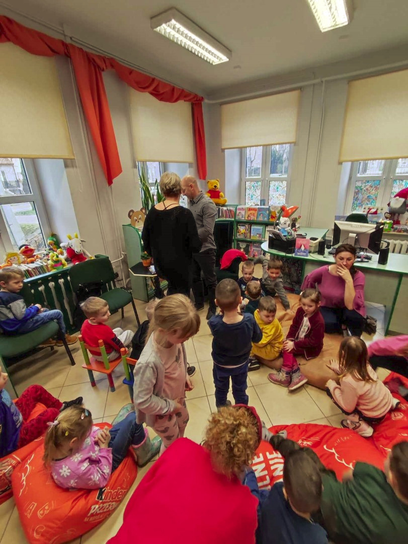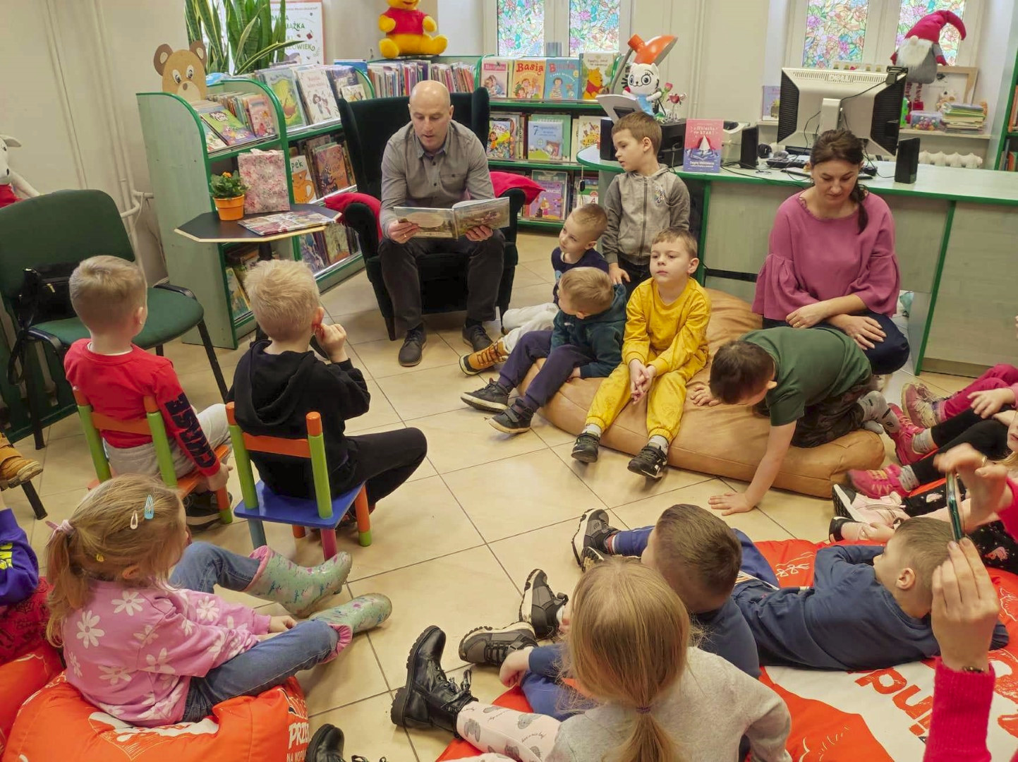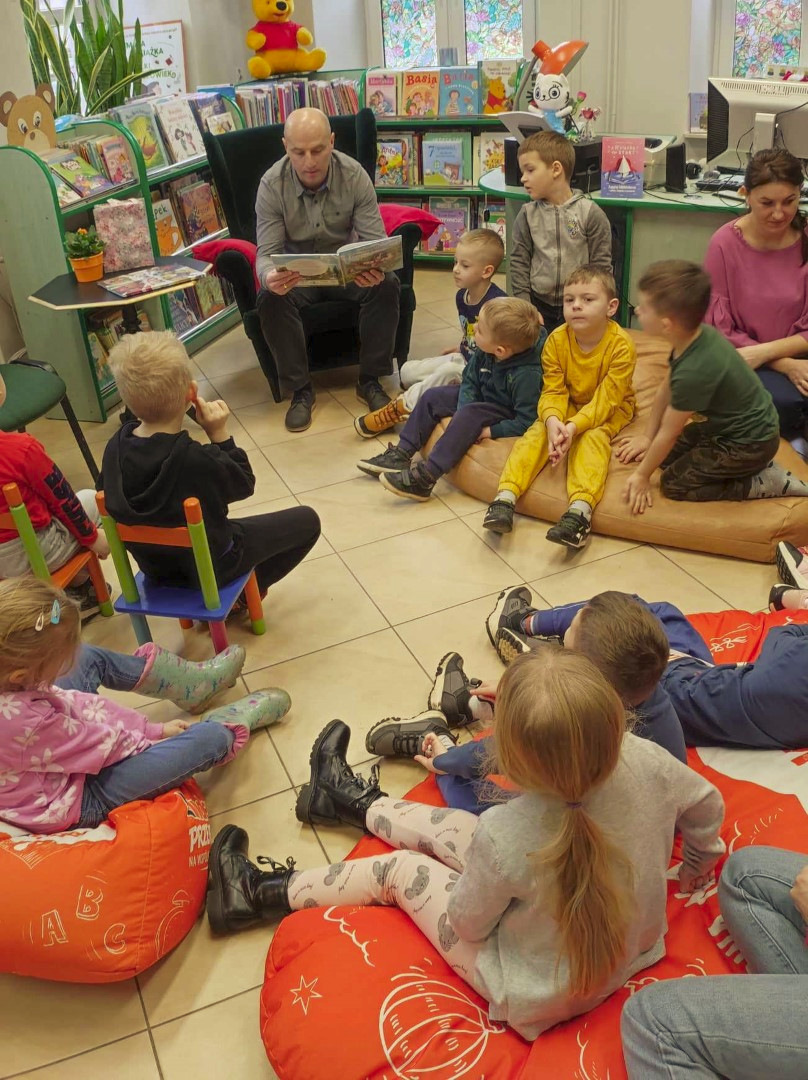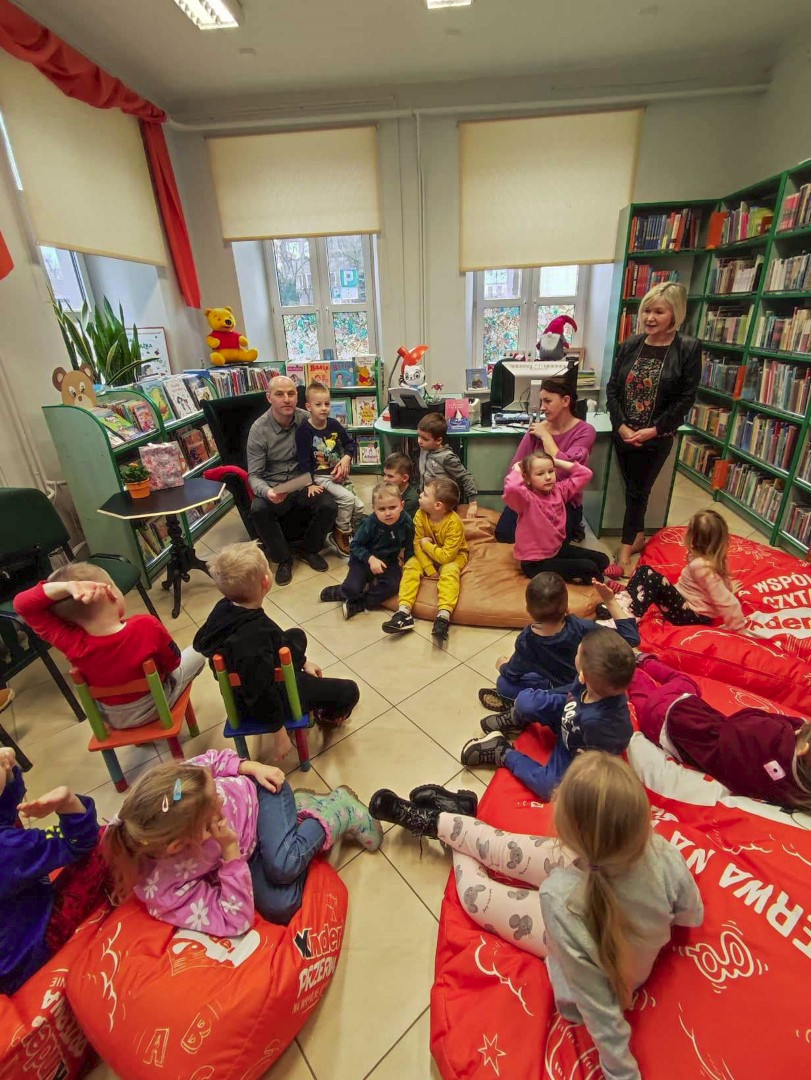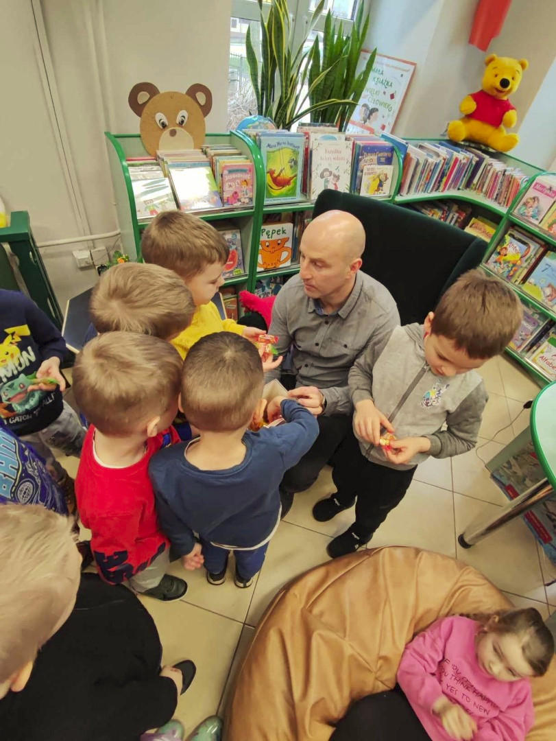 W dniu 5 marca 2024 r. spotkaliśmy się w Bibliotece przy ul. Bożnicznej 21, z dziećmi z grupy "Krasnoludki" z Przedszkole Publiczne Nr 1 w Łęcznej na głośnym czytaniu. Do czytania dzieciom zaprosiliśmy Pana Arkadiusza Wróbla, tatę Tymona. Pan Arkadiusz, który bardzo często przychodzi ze swoimi synami do biblioteki, z wielką przyjemnością przeczytał dzieciom książkę pt. „Tata Oli i piłkarska gorączka". Przedszkolaki z ogromnym zainteresowaniem słuchały przezabawnej opowieści o wyjątkowo śmiesznym tacie, który za bardzo angażował się w grę swojej córki i z tego powodu wynikały przezabawne sytuacje. Podczas spotkania był czas na słuchanie piosenek o książkach oraz wspólne rozmowy.