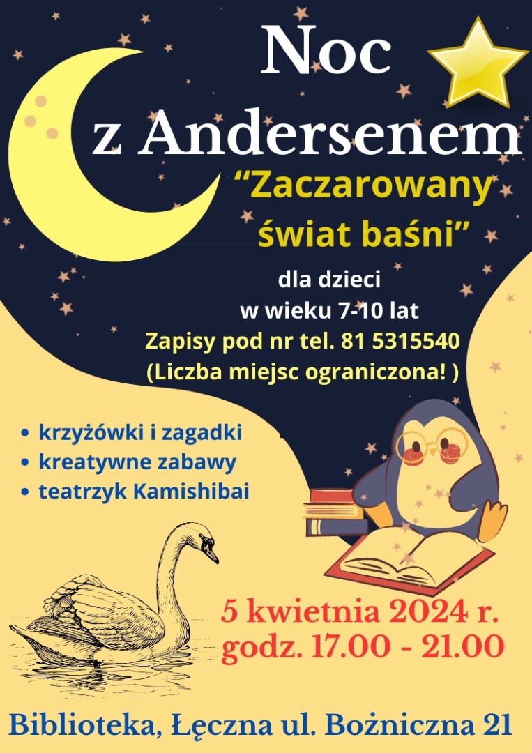 Zapisy i wszelkie dodatkowe informacje na temat Nocy z Andersenem udziela Barbara Wójcik pod nr tel. 81 531 55 40