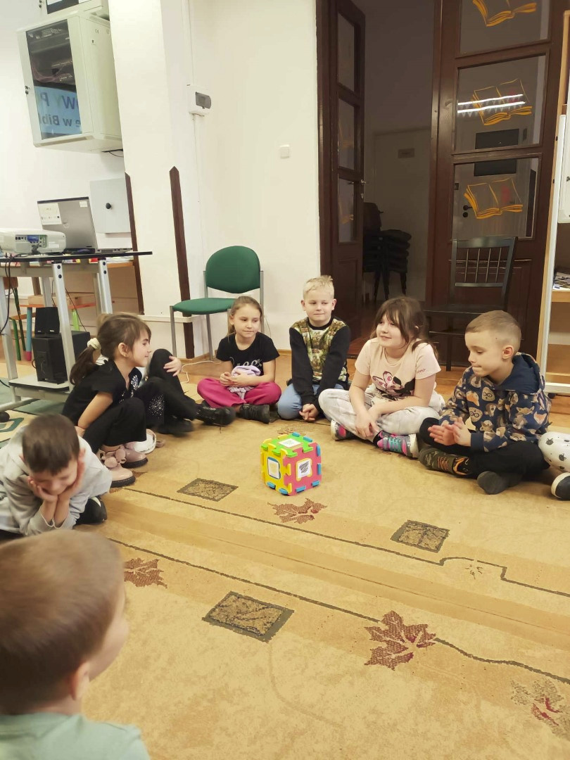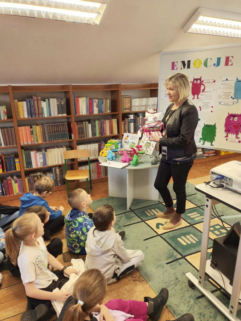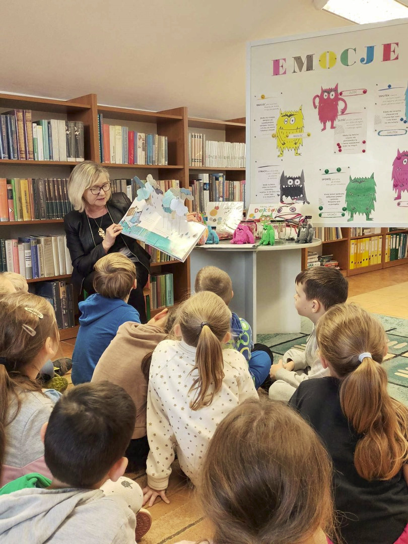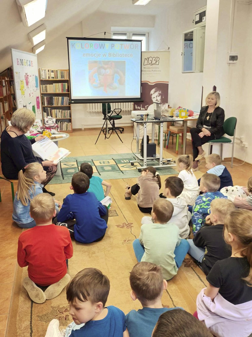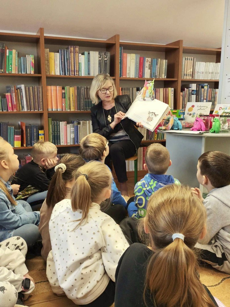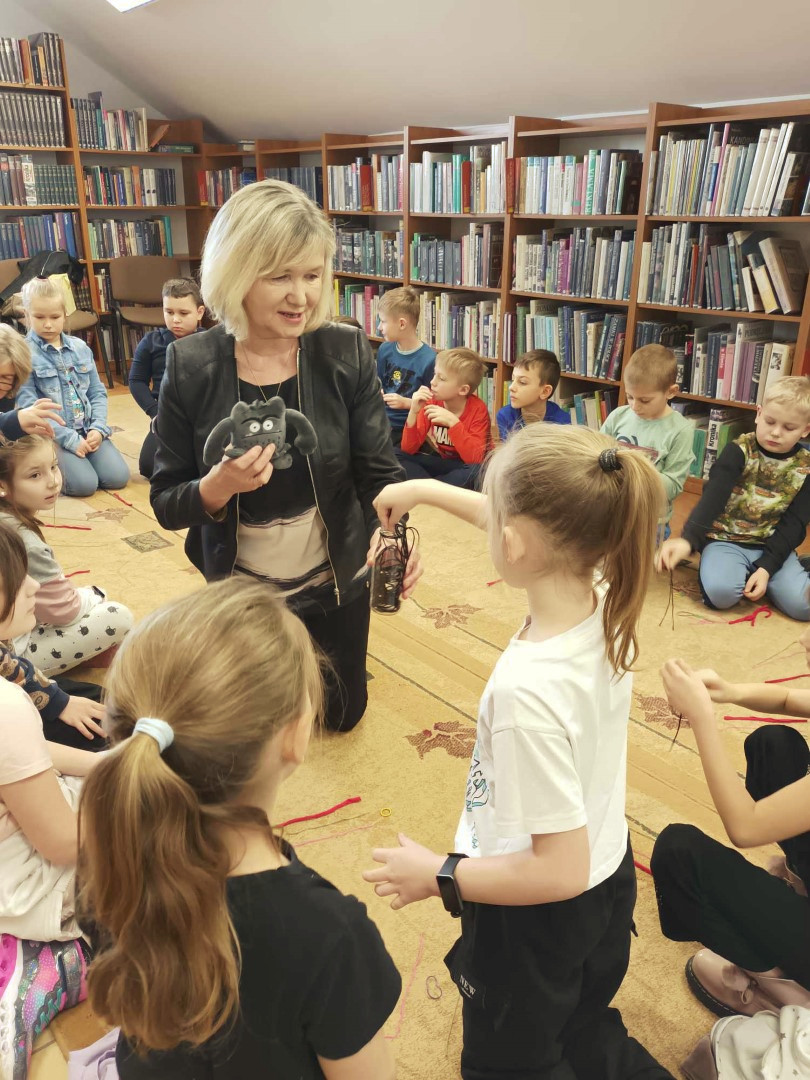 Podczas wizyty dzieci wysłuchały książki autorstwa Wiesława Drabika pt. "Dzień Kota" oraz bajki Kamishibai pt. "Kotka Psotka". Dziękujemy za zaproszenie i do zobaczenia ponownie.