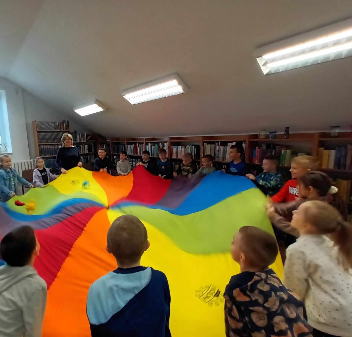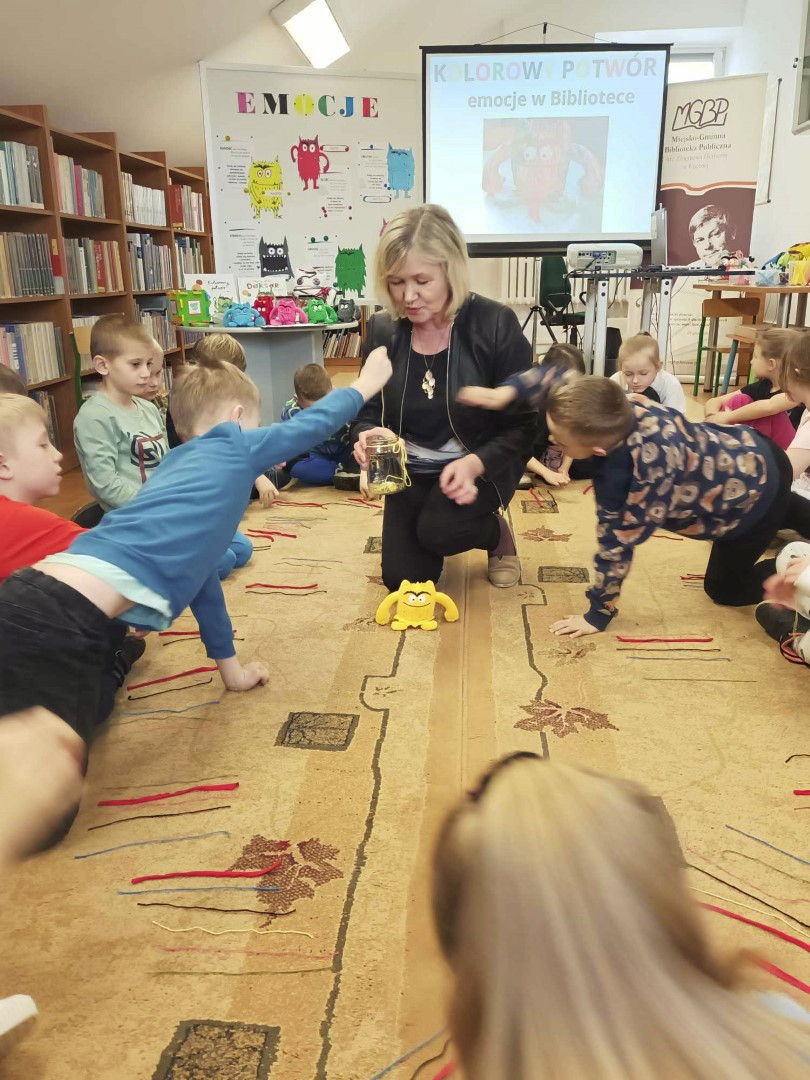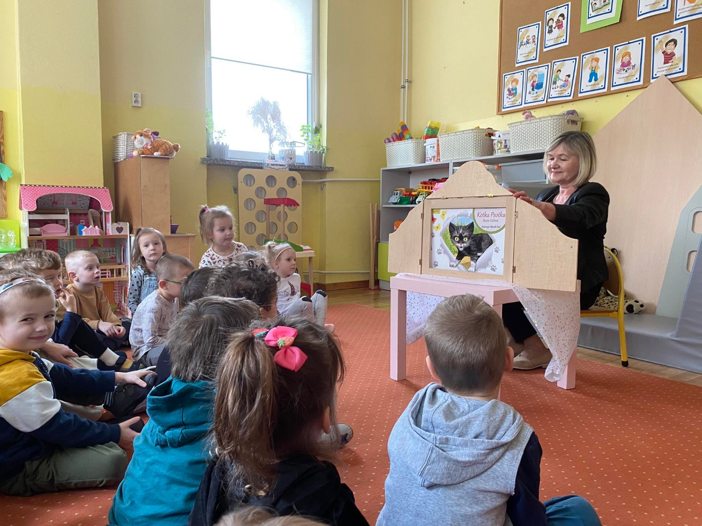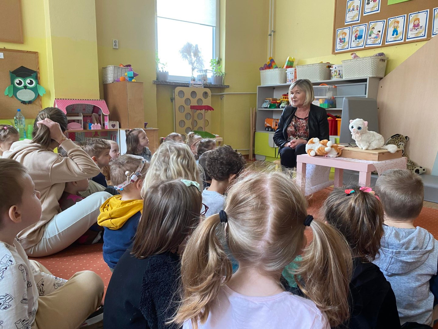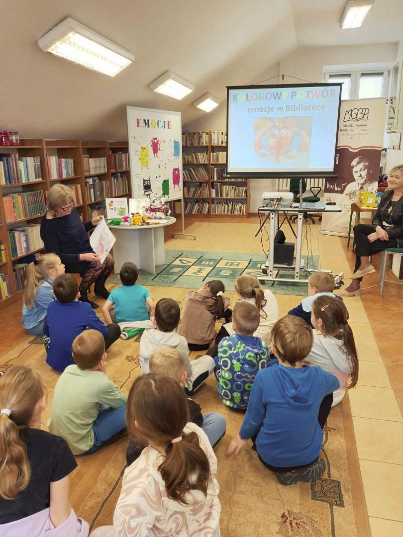 Podczas wizyty dzieci wysłuchały książki autorstwa Wiesława Drabika pt. "Dzień Kota" oraz bajki Kamishibai pt. "Kotka Psotka". Dziękujemy za zaproszenie i do zobaczenia ponownie.