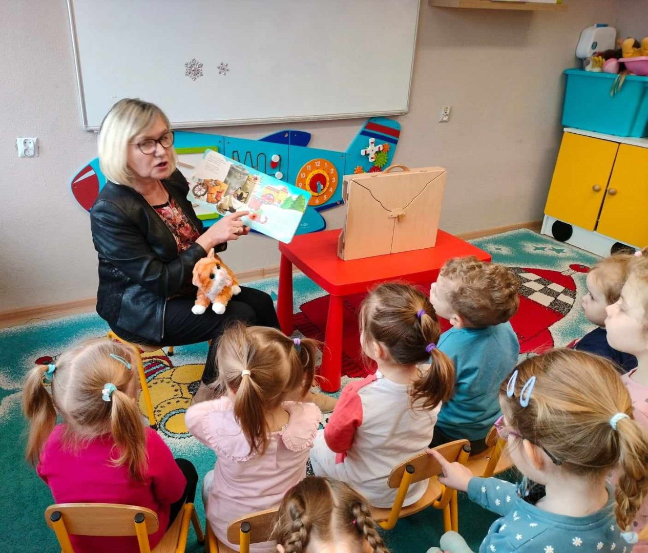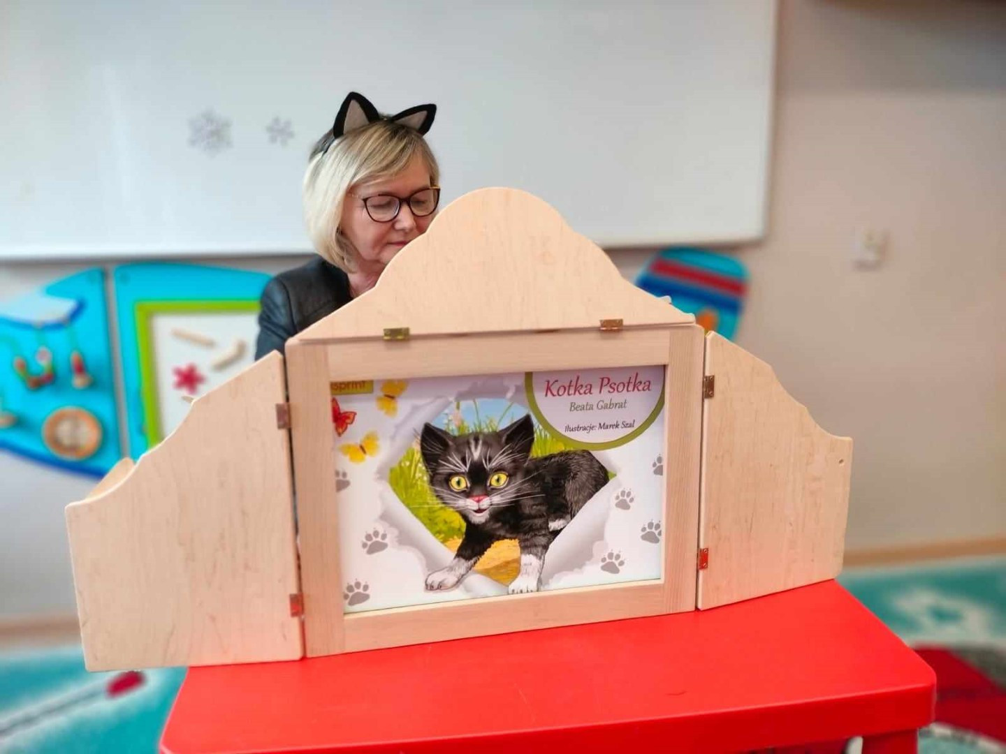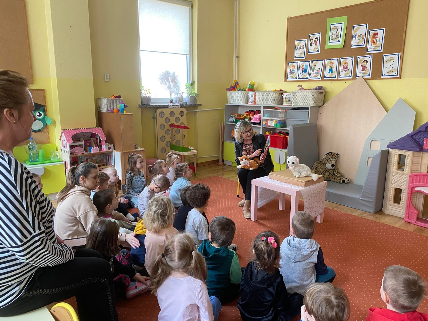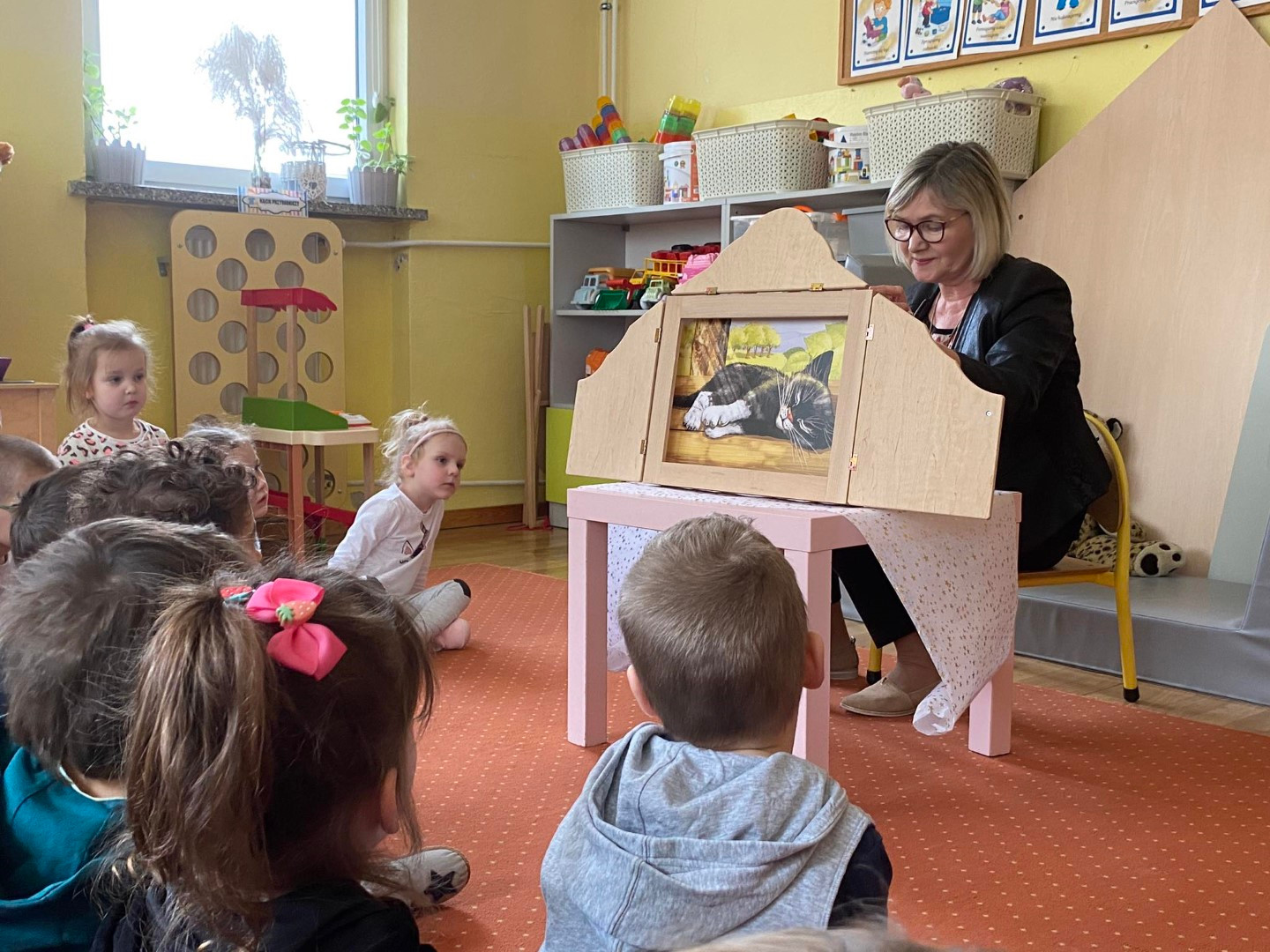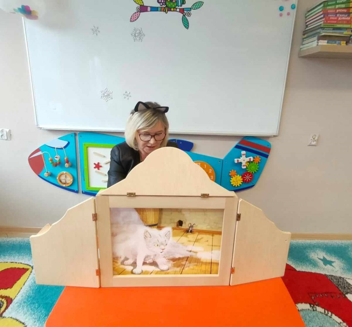 Podczas wizyty dzieci wysłuchały książki autorstwa Wiesława Drabika pt. "Dzień Kota" oraz bajki Kamishibai pt. "Kotka Psotka". Dziękujemy za zaproszenie i do zobaczenia ponownie.