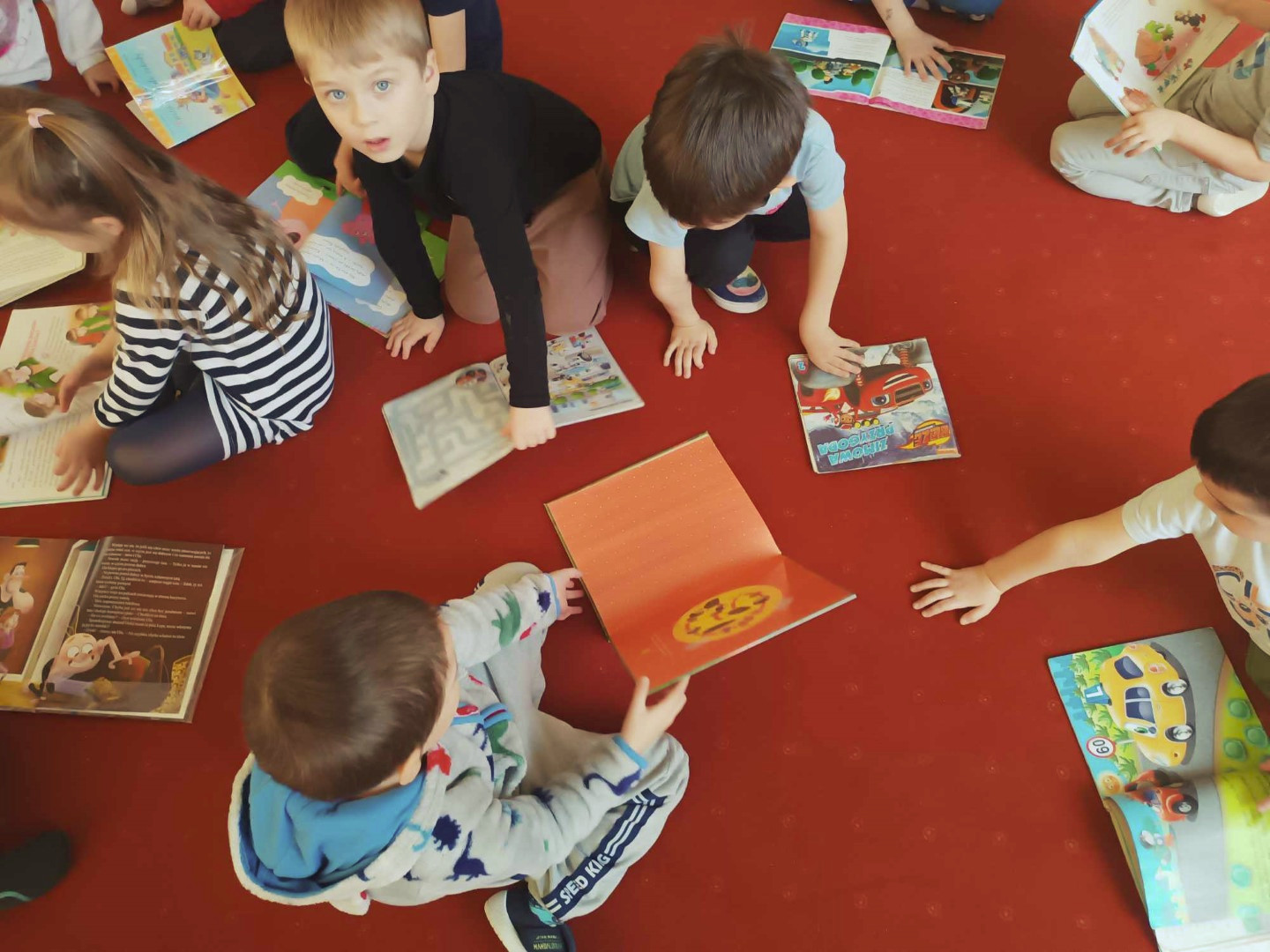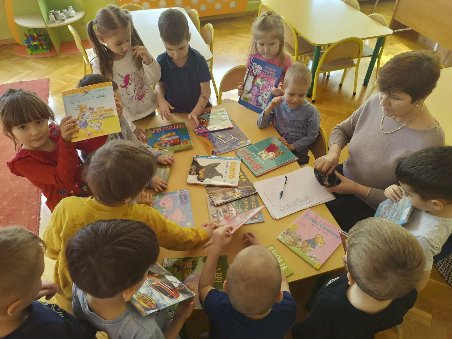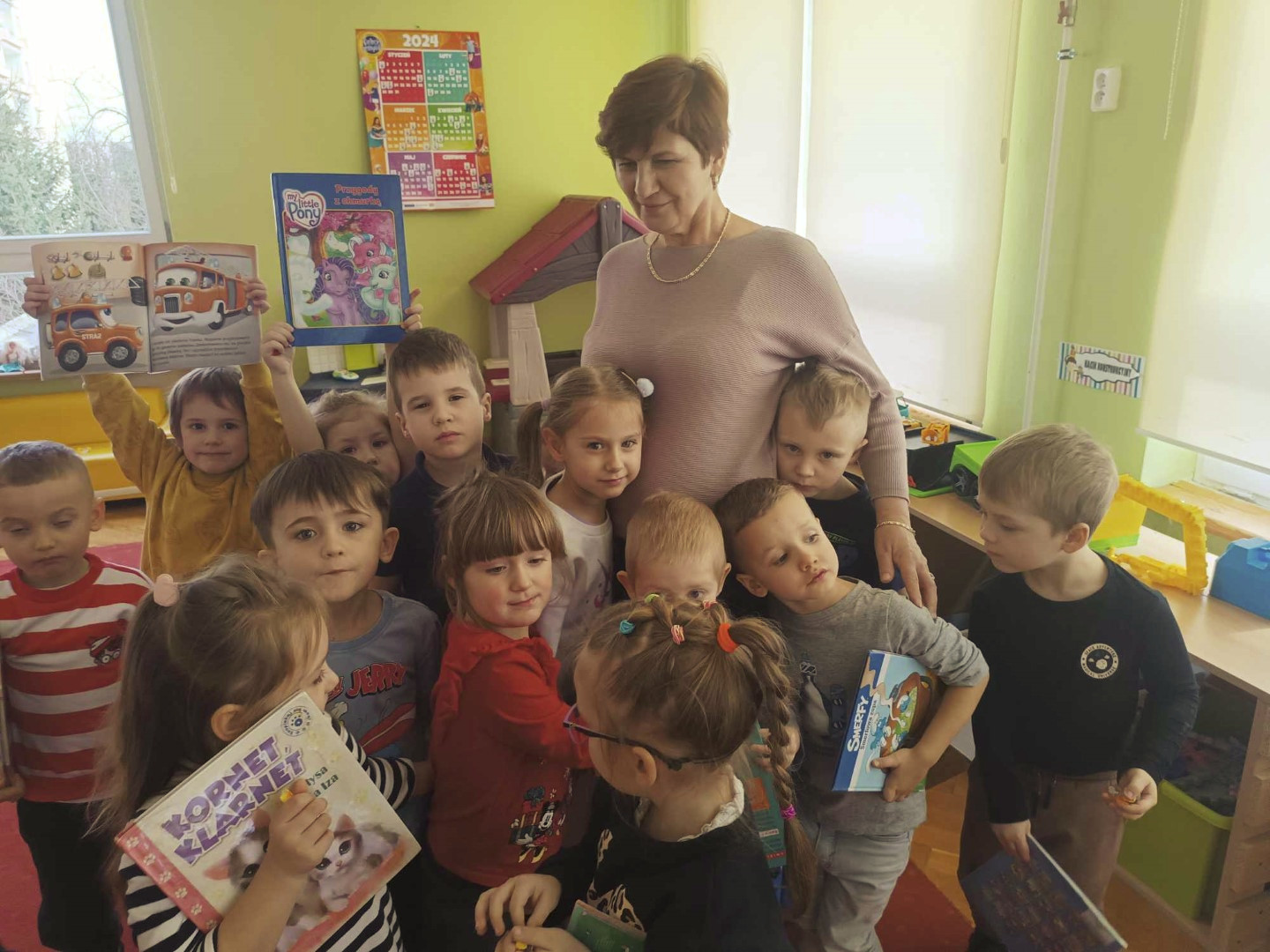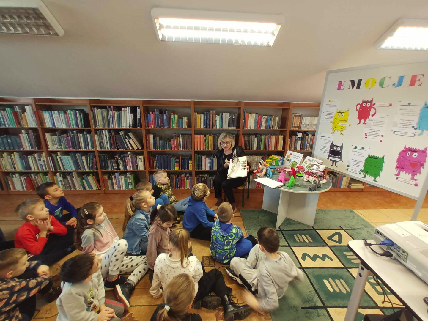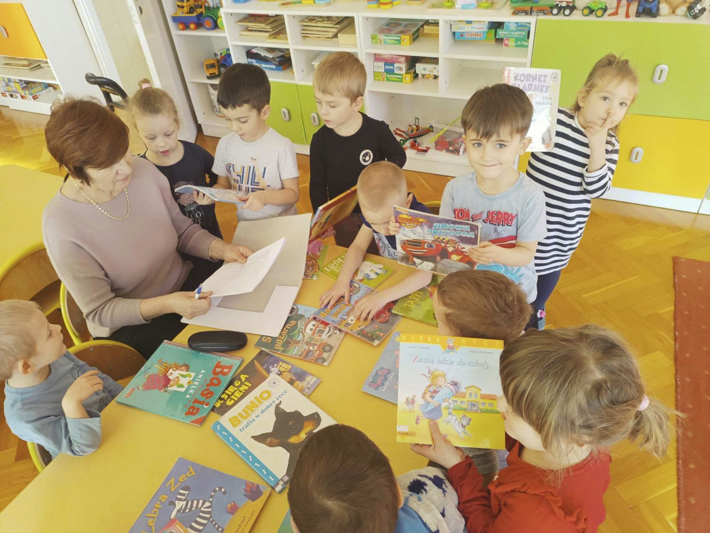 Podczas wizyty dzieci wysłuchały książki autorstwa Wiesława Drabika pt. "Dzień Kota" oraz bajki Kamishibai pt. "Kotka Psotka". Dziękujemy za zaproszenie i do zobaczenia ponownie.