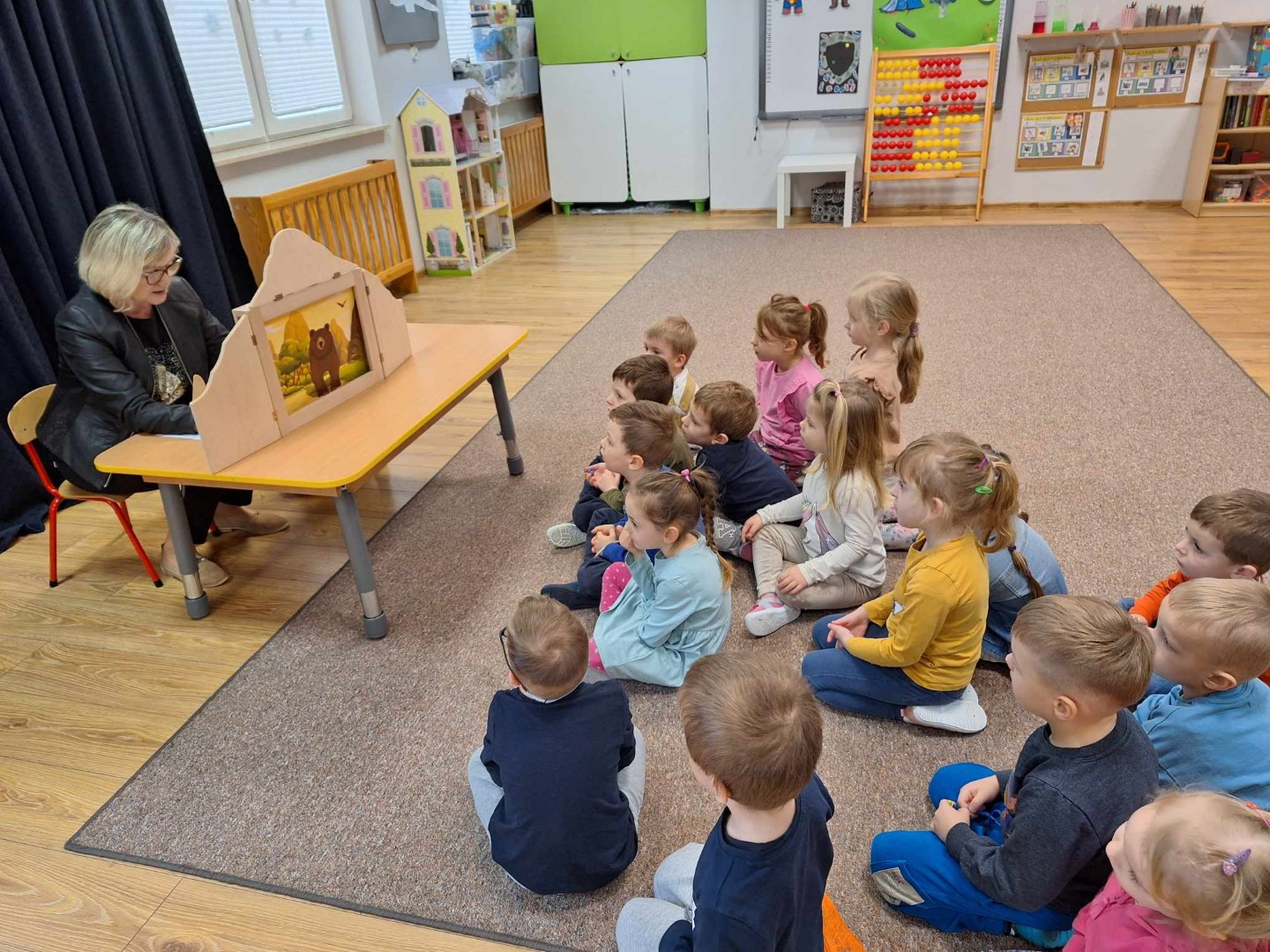 Na początku spotkania dzieci wysłuchały książeczki Katarzyny Piętka pt. "Niedźwiedź”, która wprowadziła ich w tematykę dzisiejszego święta. Przedszkolaki z ogromnym zainteresowaniem słuchały, oglądały ilustracje zawarte w opowiadaniu oraz chętnie brały udział w zabawie pomagając misiowi zasnąć lub zdobyć pożywienie. Następnie Pani Basia, za pomocą teatrzyku Kamishibai, zaprezentowała „Misiowe wiadomości – niedźwiedź brunatny” autorstwa Beaty Gabrat. Casperki dowiedziały się gdzie mieszkają niedźwiedzie, co lubią jeść i jakie mają zwyczaje.
