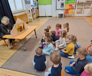 Co to znaczy KAMISHIBAI? KAMISHIBAI to Papierowy Teatr ukryty w magicznej skrzynce, ponieważ (po japońsku) KAMI to papier a SHIBAI to teatr. Pani Basia za pomocą teatrzyku Kamishibai zaprezentowała bajkę pt. ,,Złotowłosa i i trzy misie”. Było to wyjątkowe połączenie książki ilustrowanej z teatrem. Dzieci z ogromnym zainteresowaniem śledziły losy bohaterów, następnie odpowiadały na pytania bibliotekarki dotyczące wysłuchanej bajki. Na zakończenie spotkania bibliotekarka zaprosiła dzieci do udziału w akcji Mała książka - wielki człowiek i wręczyła kolorowe zakładki z krasnalem.