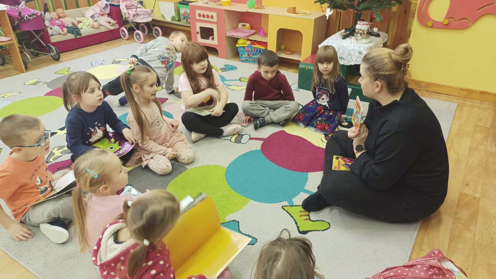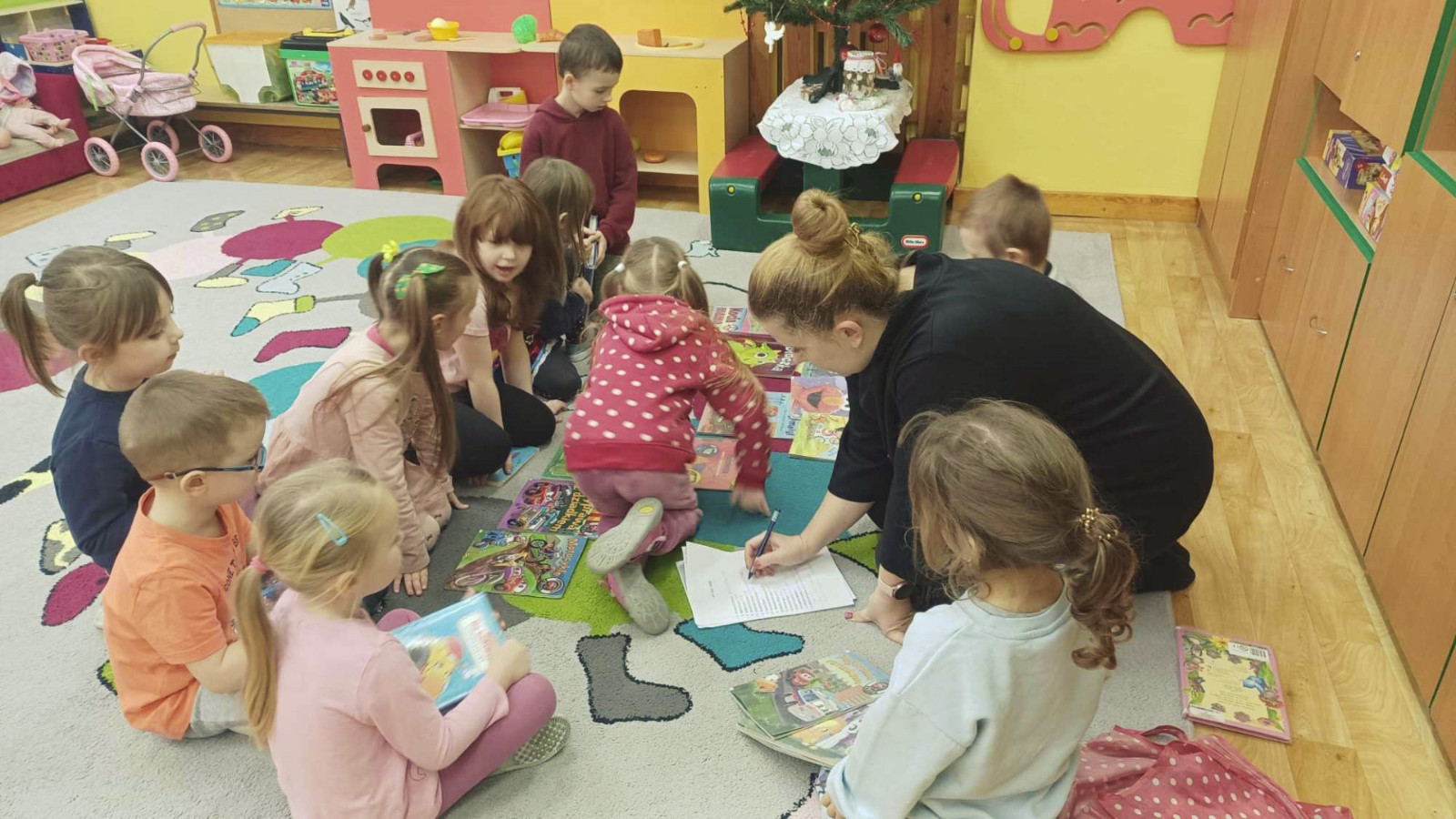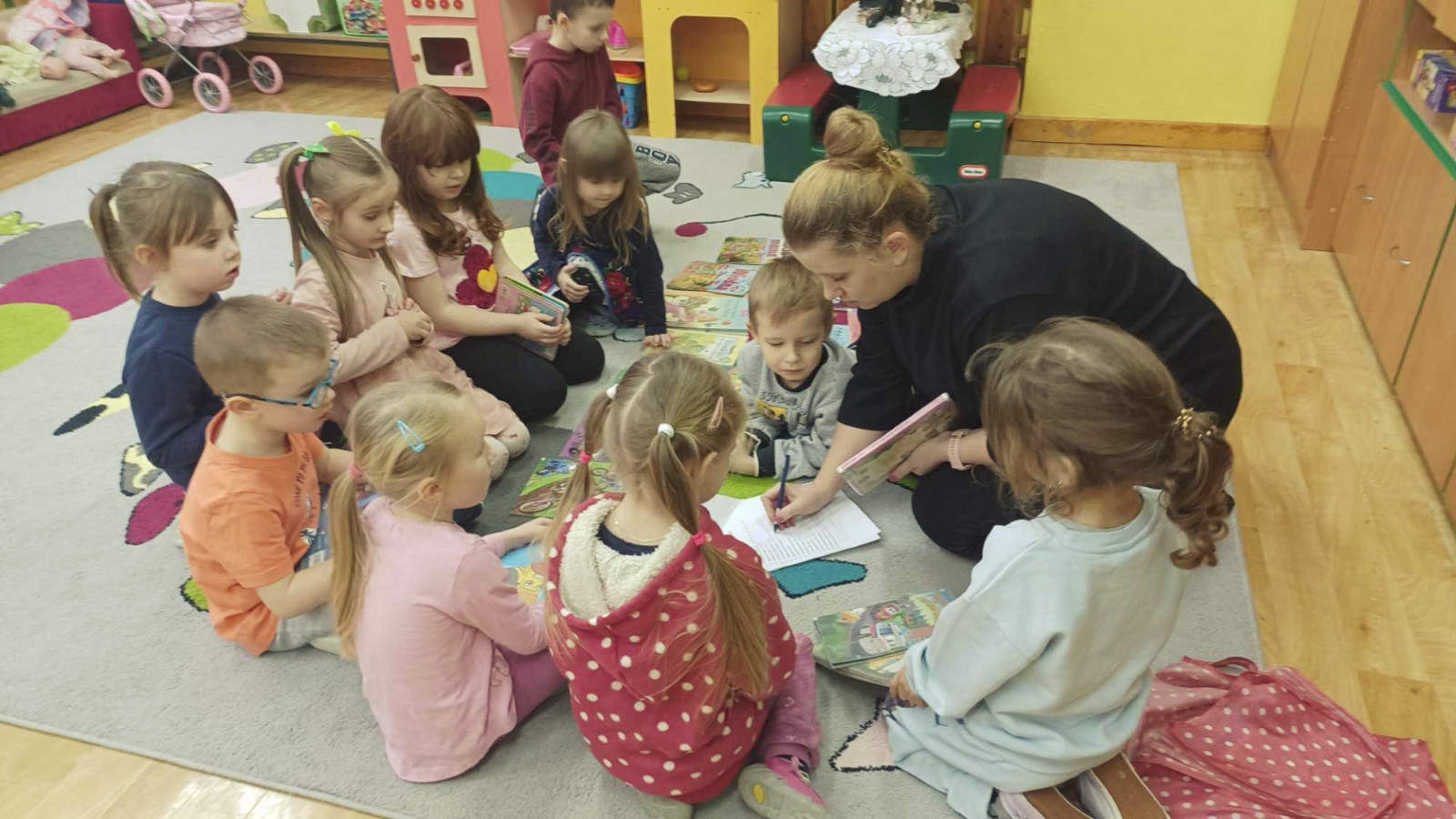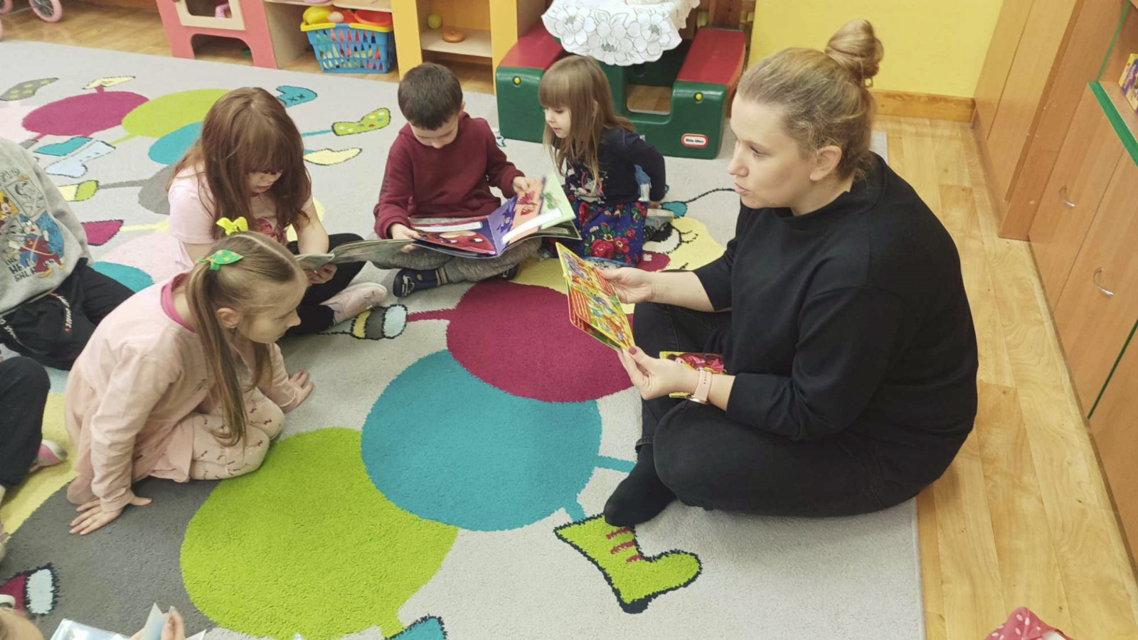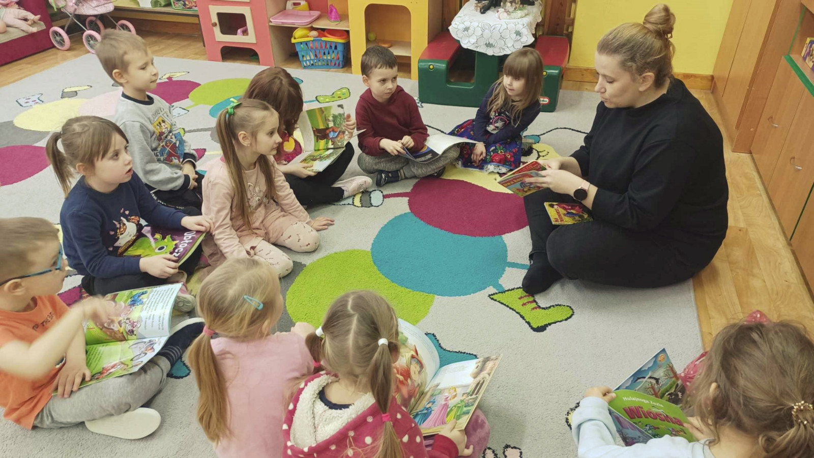 Gdy za oknem padał śnieg i mróz szczypał w uszy Bibliotekarka Ola z Fili nr 1 odwiedziła dzieci z grupy „Misie” w Przedszkolu Publicznym nr 2. Przedszkolaki wysłuchały utworu Aleksandra Fredry pt. „Dwa koguty” oraz wypożyczyły książeczki z ulubionymi bohaterami.