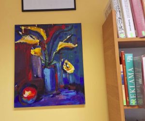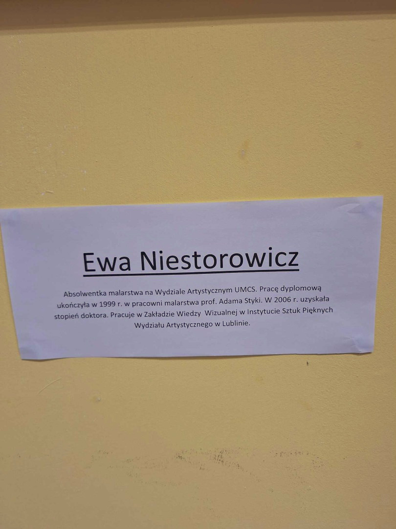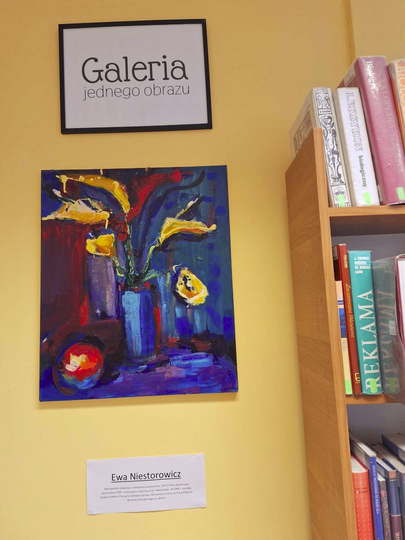 Rok 2024 zaczynamy od prezentacji obrazu Ewy Niestorowicz. – artystki z ziemi lubelskiej, która trzykrotnie brała udział w plenerach malarskich jakie organizowane były w Łęcznej. Wyeksponowany obraz pt. „Lilie” powstał w 2014 roku podczas trwania X Międzynarodowego Pleneru Artystycznego jaki odbył się w naszym mieście. Niech ta pełna ekspresji praca z bogatą kolorystyką będzie powodem, dla którego warto odwiedzić naszą bibliotekę, by podczas wypożyczania książek wzbogacić się o doznania artystyczne. A trzeba zaznaczyć, że warto. Dr Ewa Niestorowicz to artystka wielce uznana już na samym początku swojej drogi artystycznej. Pracę dyplomową uzyskała z wyróżnieniem rektora a rozprawa doktorska została wyróżniona pierwszą nagrodą na ogólnopolskim konkursie na najlepszą pracę doktorską „Otwarte Drzwi 20207”. W całym dorobku artystycznym posiada 20 wystaw indywidualnych oraz ok. 50 zbiorowych. Jest laureatką wielu nagród i wyróżnień w Polsce i za granicą. Więc jeszcze raz serdecznie zapraszamy do delektowania się sztuką przez duże „S”, z którą można się spotkać w Filii nr 1.