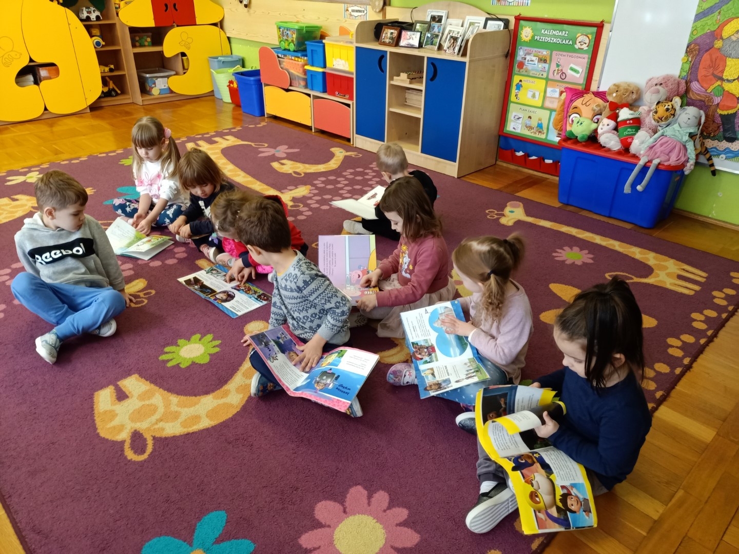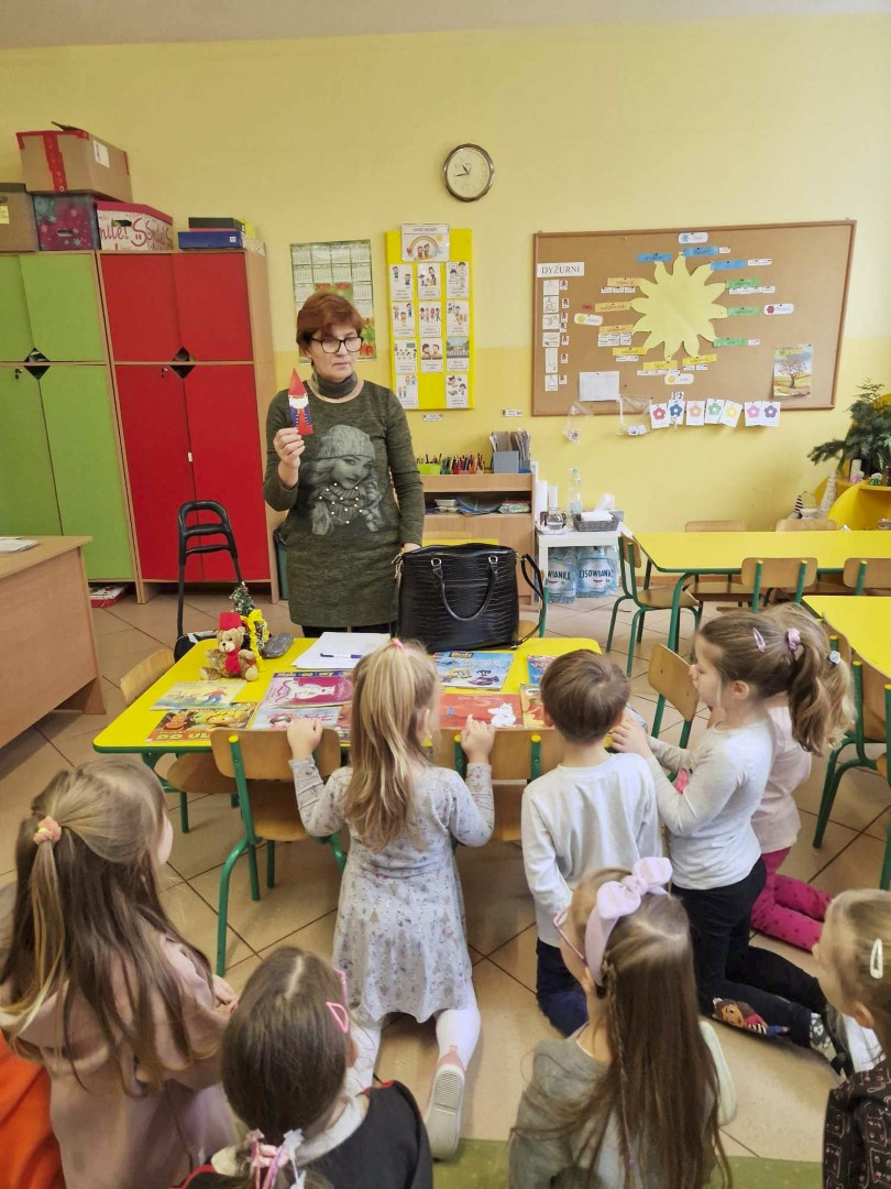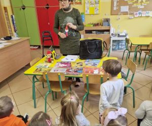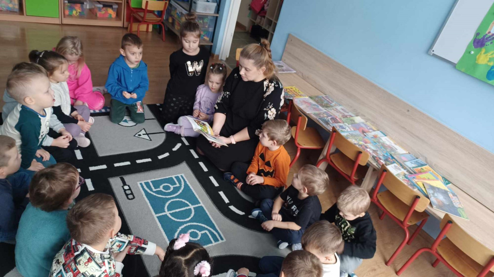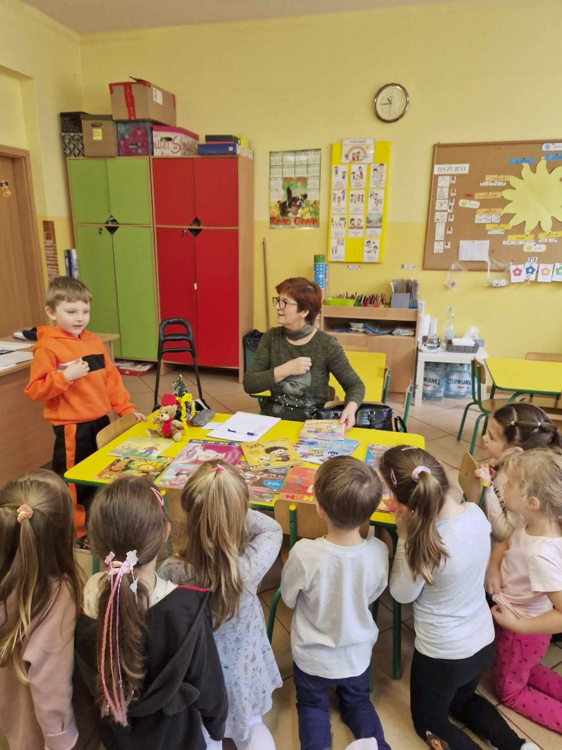 Pani bibliotekarka z Filii nr 1 w dniach 30.11-01.12.2023r odwiedziła Przedszkole Mali Odkrywcy by przeczytać książkę pt. „Franklin i pokaz magii”. Grupa 4-latków oraz 5/6-latków z zaciekawieniem wysłuchały opowieści oraz opowiedziały jakie magiczne sztuczki potrafią. Zgodnie ustaliliśmy że każdy z nas potrafi sprawić że znikają słodycze.