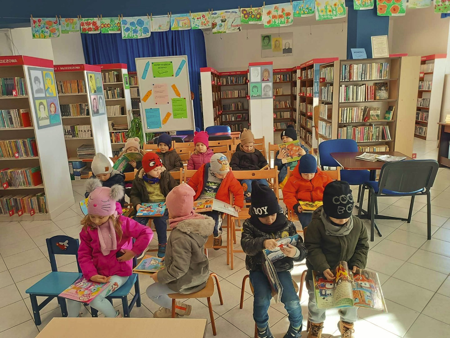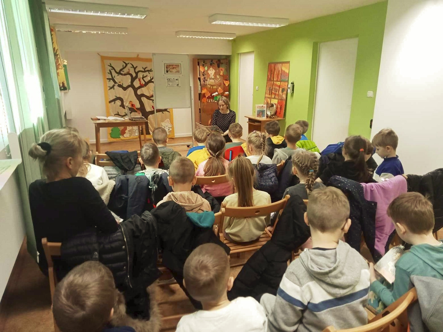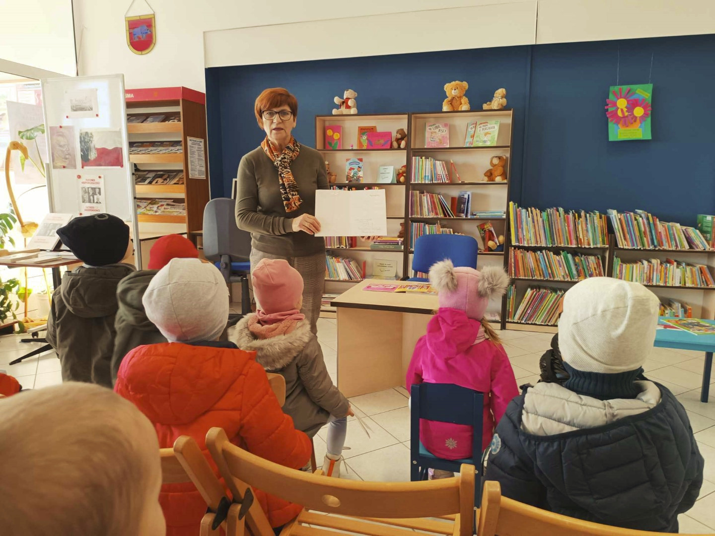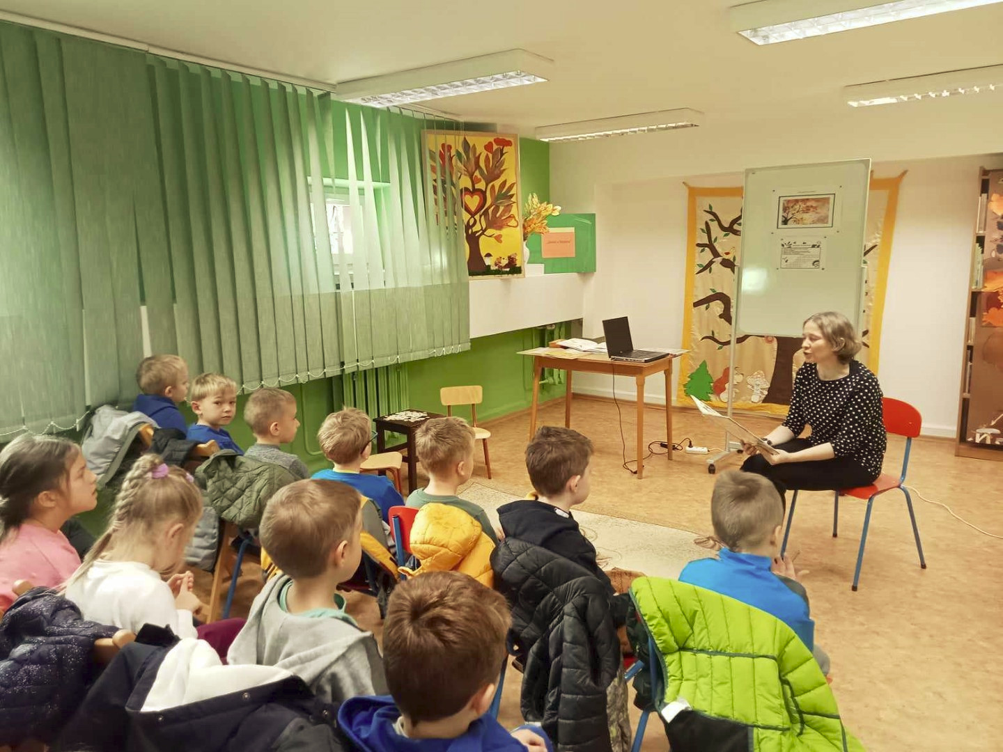 W dniu 8.11.2023 r bibliotekarka Ola z Filii nr 1 odwiedziła kilka grup przedszkolnych by przeczytać dzieciom opowieść pt. „Złodziej liści” autorstwa Alice Hemming i Nicoli Slater „Pszczółki”, „Biedronki”, „Stokrotki” oraz „Bławatki” chętnie zamieniły się w detektywów i razem z główną bohaterką Wiewiórką szukaliśmy kto jesienią kradnie liście z drzew. Przedszkolaki poznały również kilka ciekawostek o jesieni np.: