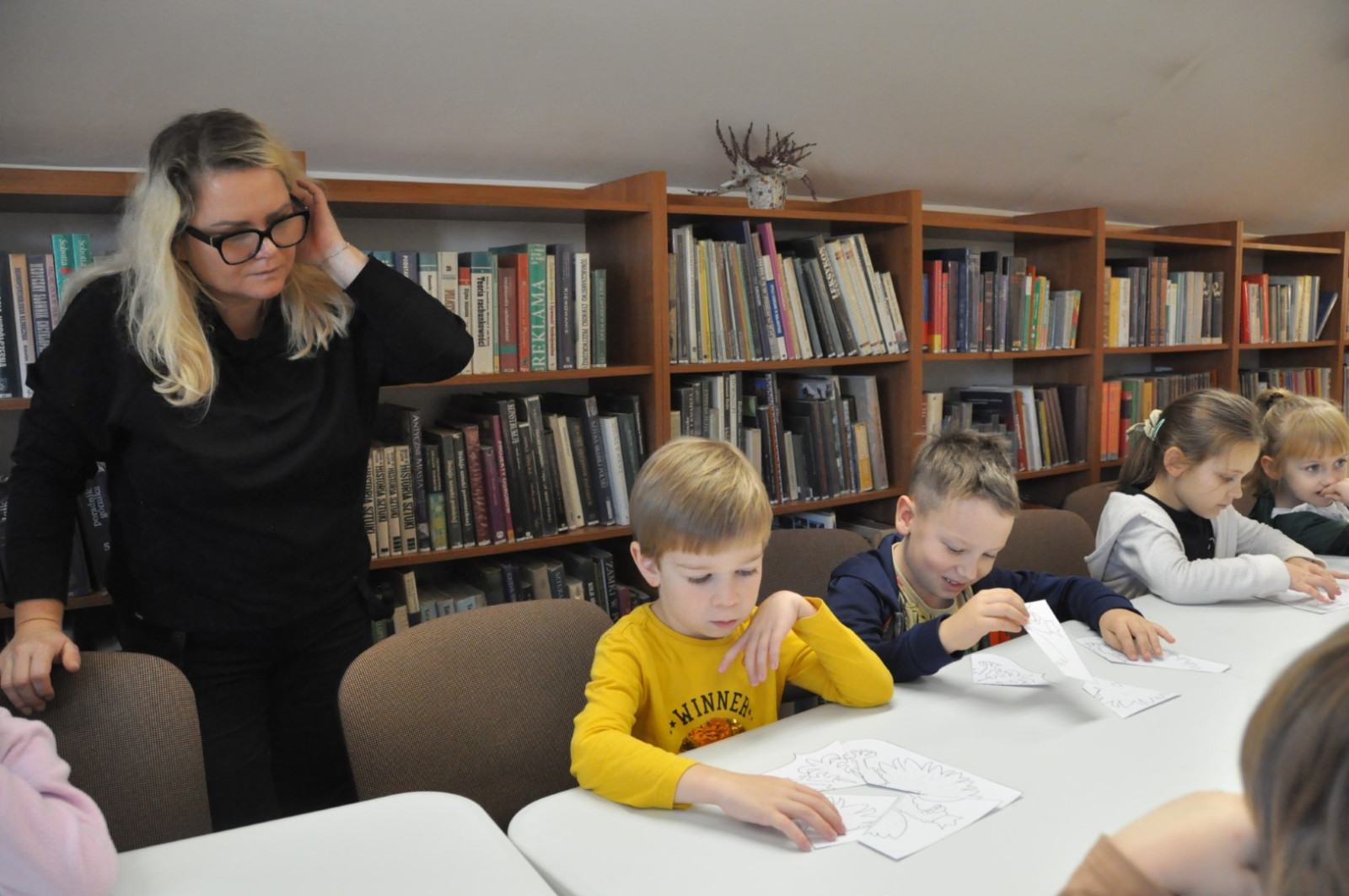 7 listopada 2023 r. Filię nr 3 odwiedziły dzieci z klasy 0 „d” ze Szkoły Podstawowej nr 4 w Łęcznej. Uczniowie wzięli udział w lekcji bibliotecznej i zwiedzili wystawę prac pt.: „Odkrywamy młode talenty. Mali goście zapoznali się także z pracą biblioteki i kącikiem dziecięcym. Podczas spotkania dzieci poznawały książki o jesieni, wysłuchały jesiennych wierszy i opowiadań. Wzięły aktywnie udział w muzycznych zgadywankach i układały wyrazy z jesiennymi hasłami. Wielką radość sprawiło dzieciom rozwiązywanie krzyżówki i zagadek. Podczas zabawy klasa rywalizowała w dwóch grupach „Jeżyki” i „Wiewiórki”, obydwie wykazały się dużą wiedzą i aktywnością. Pani Ewa opowiedziała też uczestnikom o ważnych świętach, które obchodzimy jesienią. Dziękujemy za odwiedziny i do zobaczenie w bibliotece.