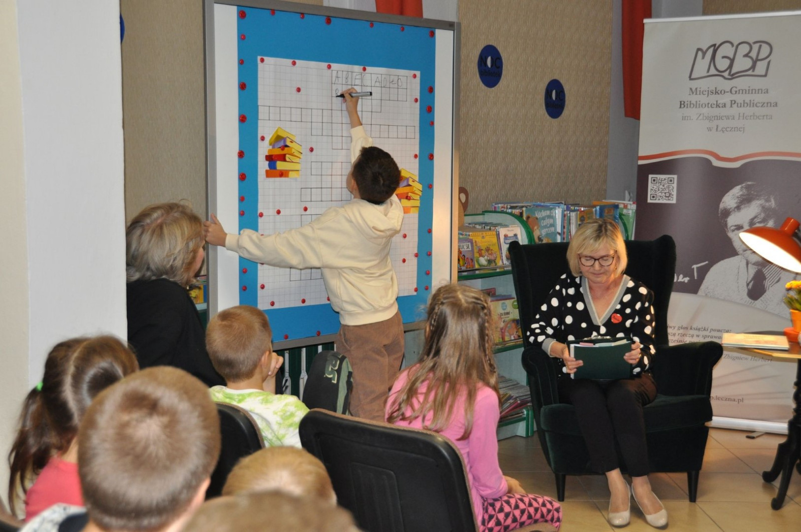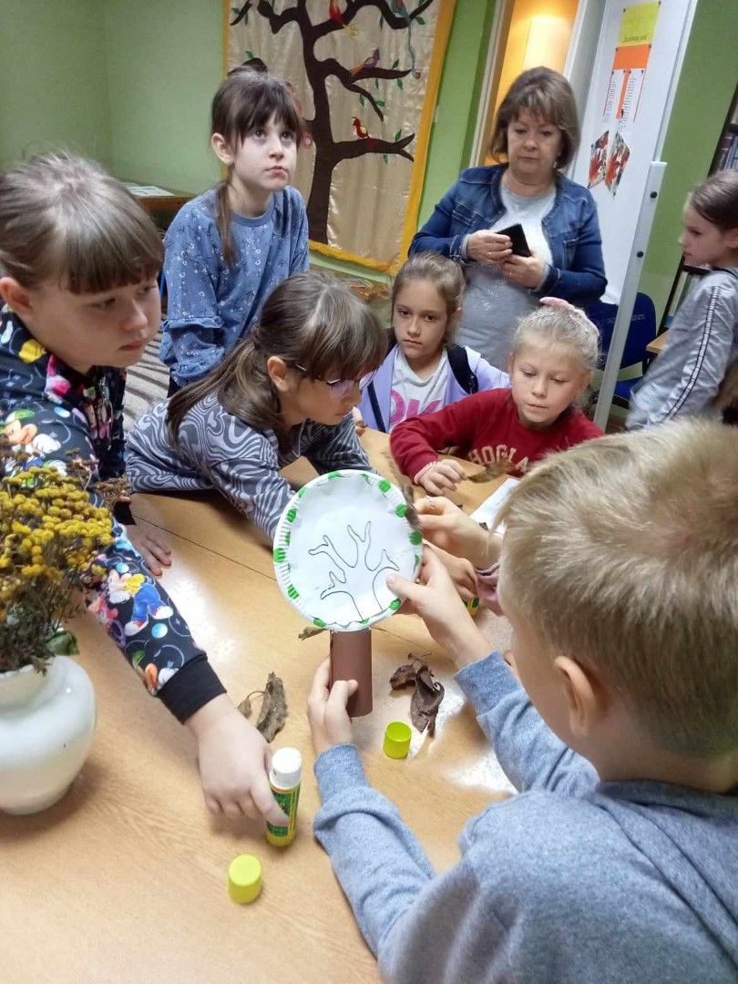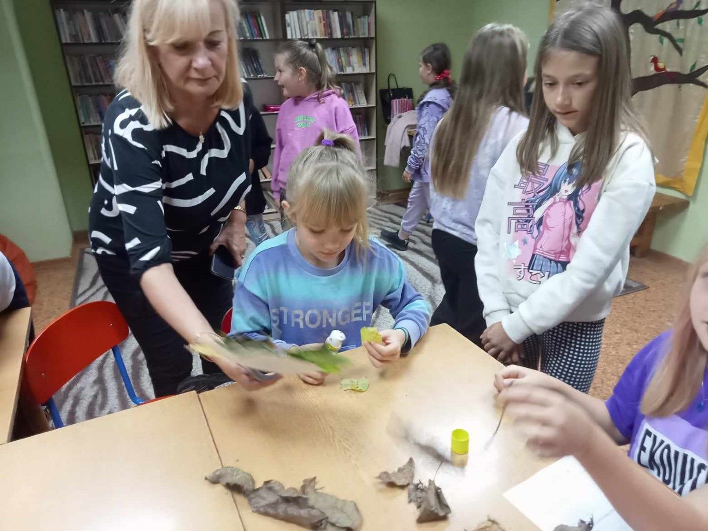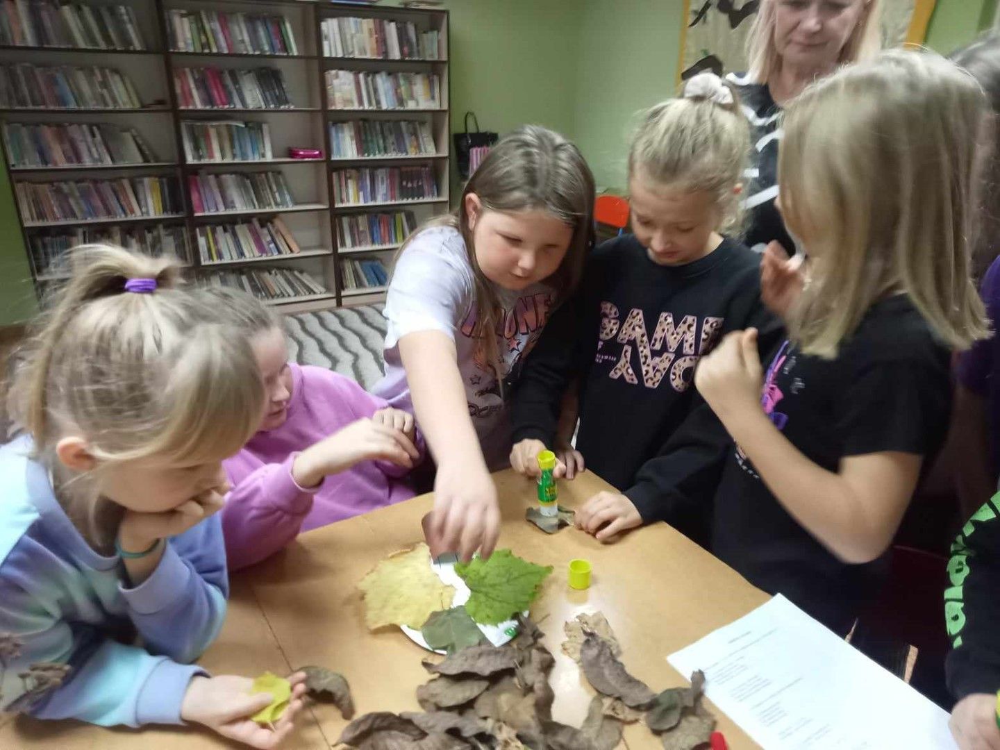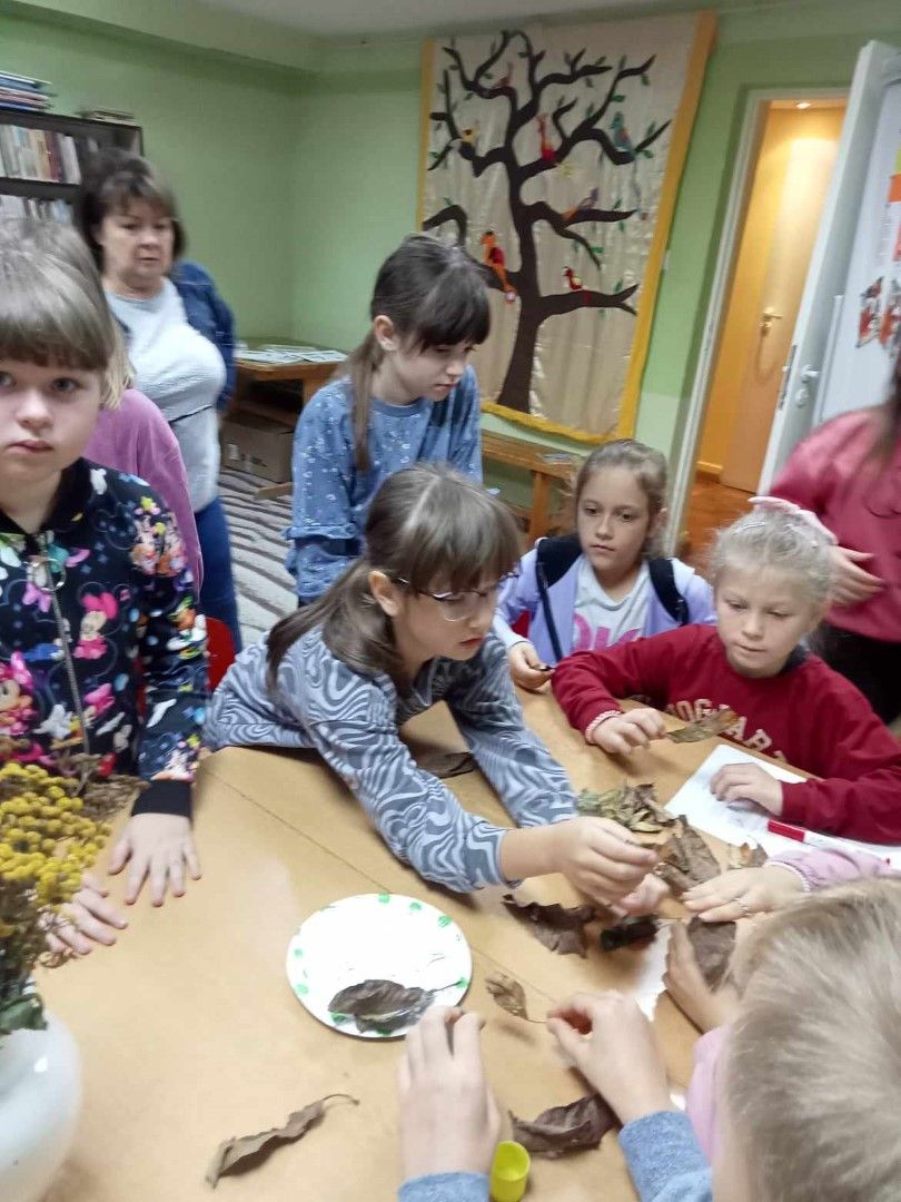 Następnie chętni uczestnicy rozwiązywali krzyżówki i zagadki poświęcone jesieni. „Grupy: Jeżyki i Liski – III c oraz Jeżyki i Wiewiórki - III e” dzielnie rywalizowały ze sobą w zgadywaniu jesiennych zagadek. W dalszej części uczestnicy poznali utwór muzyczny Antonio Vivaldiego pt.: „Jesień”. Chętni uczniowie wykazali się talentem twórczym i układali „jesienne hasła”- w grze „Remik Słowny” lub w grupie wykonywali „jesienne drzewko” z liści i papierowych talerzyków. Na zakończenie chętni mogli wypożyczyć książki.