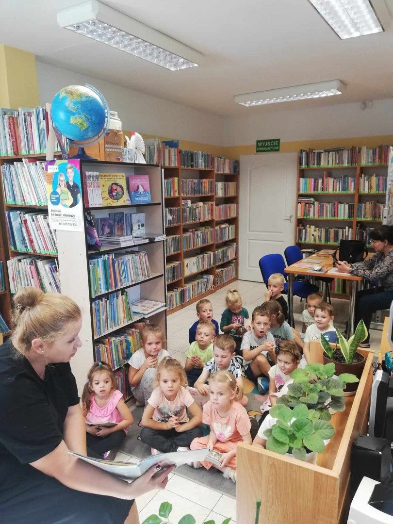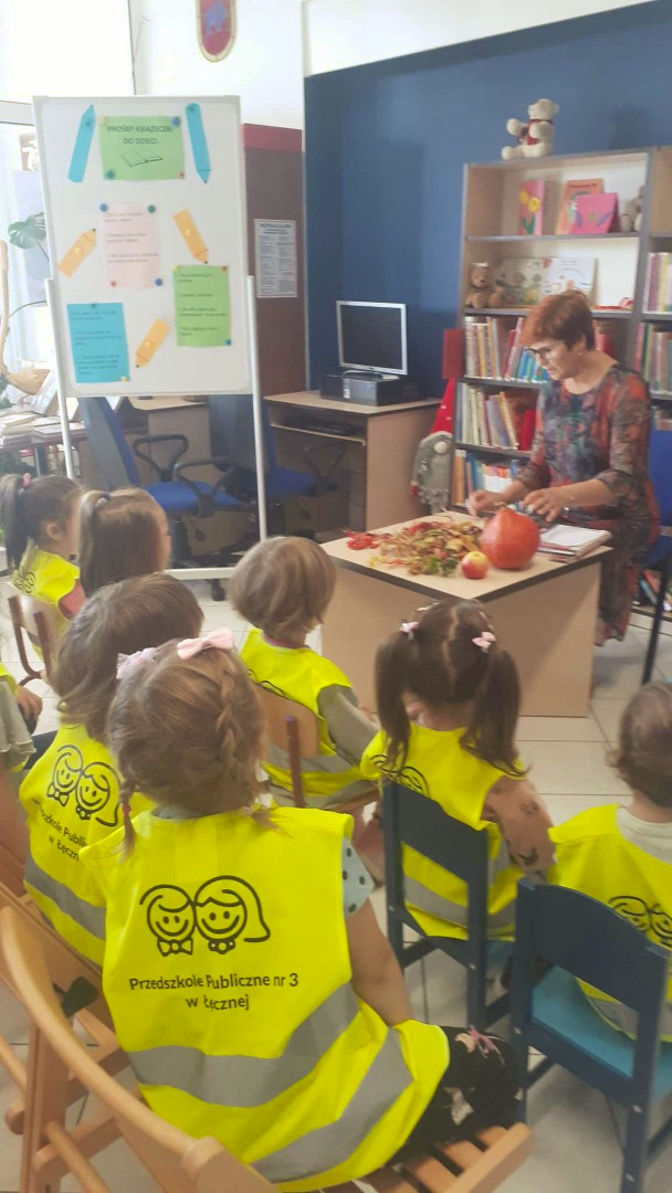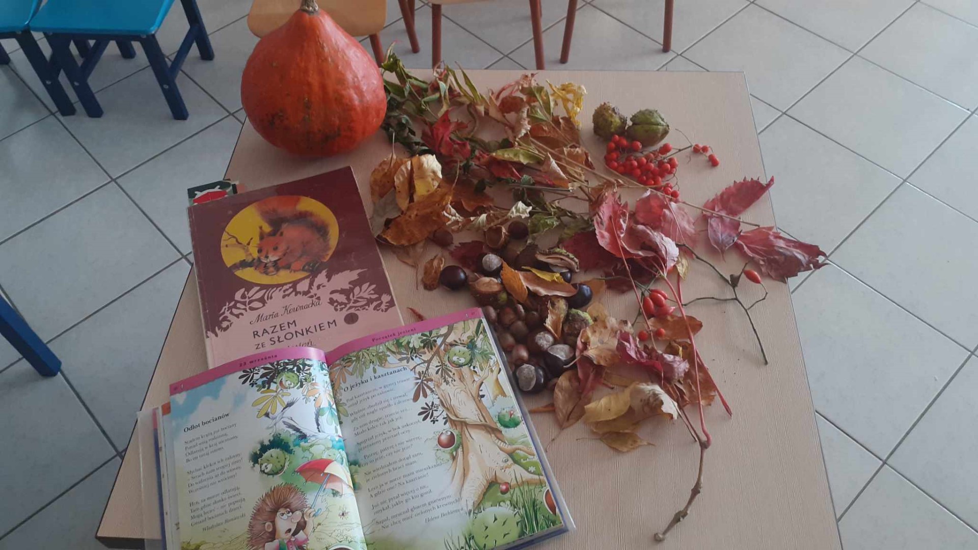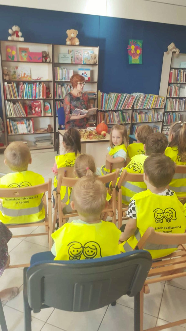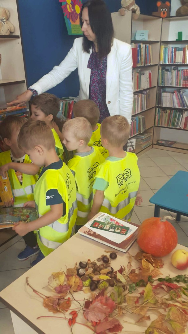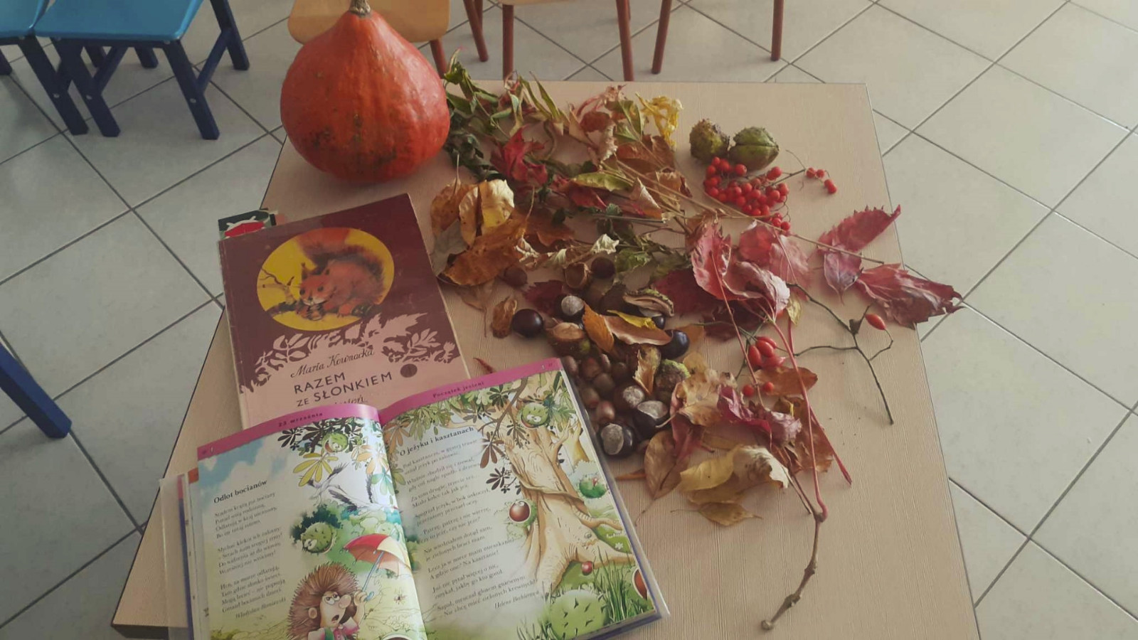Słoneczna i pogodna jesień, kiedy liście drzew stają się żółte i czerwone to złota polska jesień. O tej porze roku bibliotekarka rozmawiała z przedszkolakami.