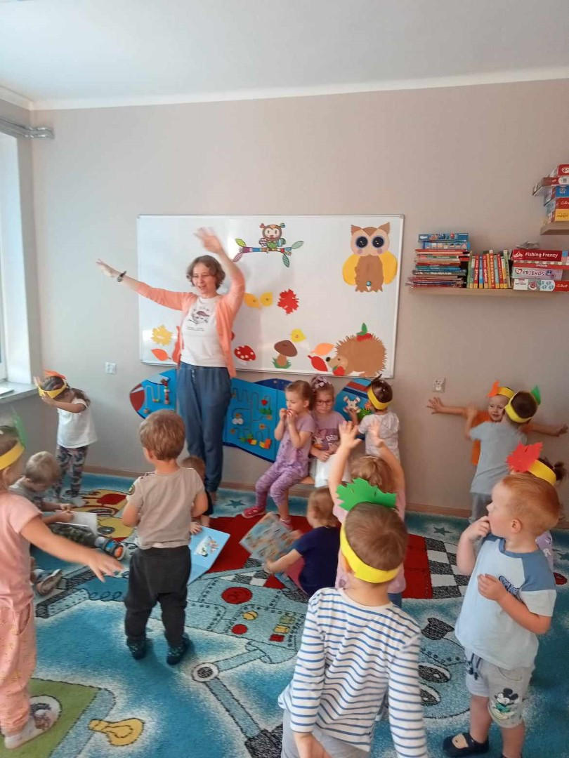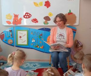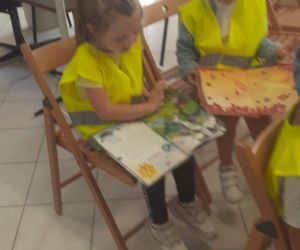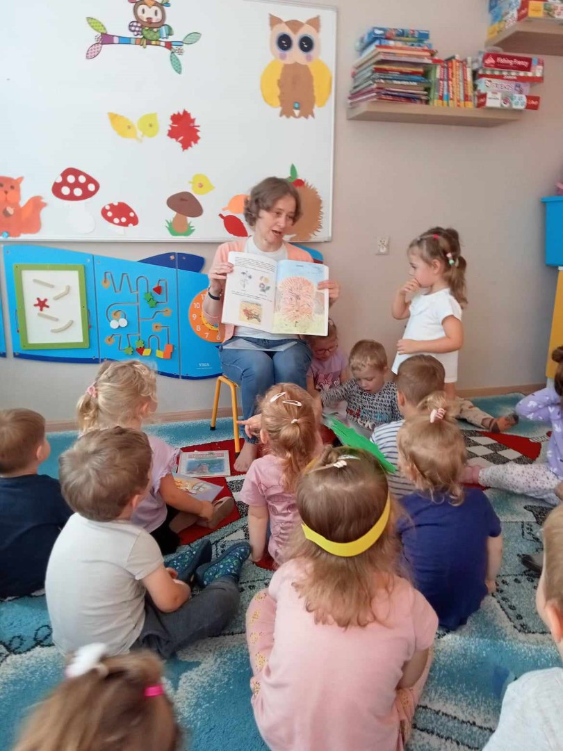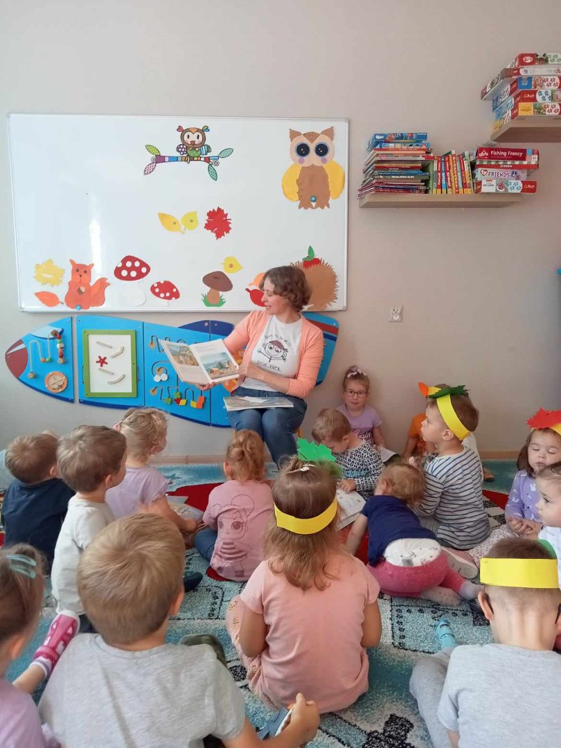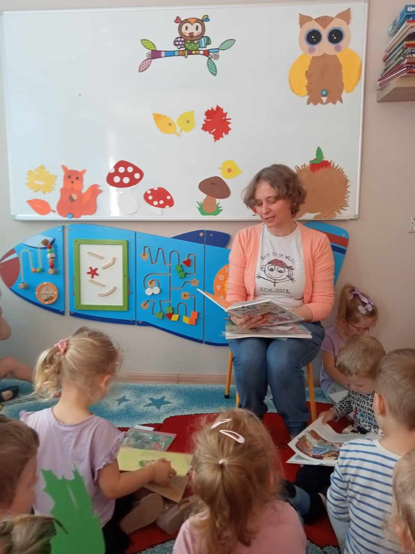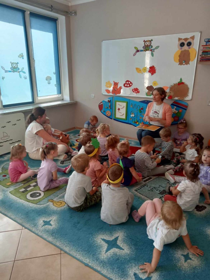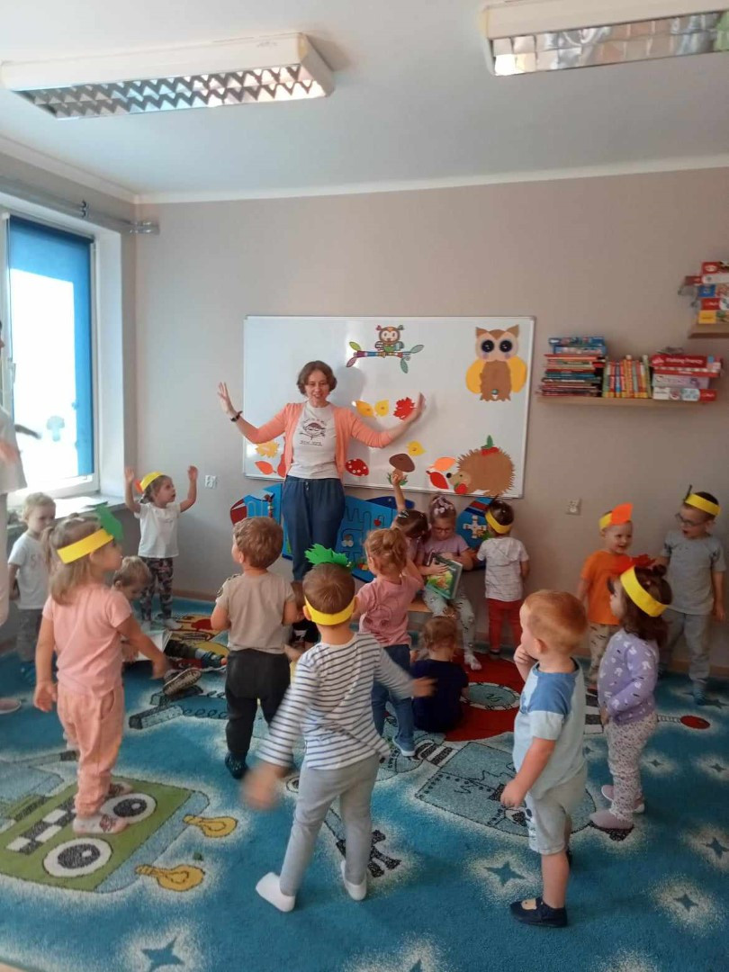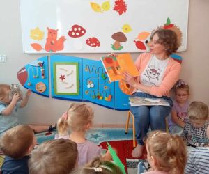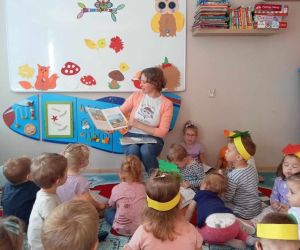W piękny jesienny poranek 27 września 2023 r. pani Ewa z Filii nr 3 odwiedziła dzieci ze Żłobka „Mali Odkrywcy”. Na zaproszenie pani Agnieszki z grupy Sówki i wychowawców grup Kangurki i Biedronki pani Ewa czytała dzieciom wiersze i fragmenty książek o jesieni. Mali słuchacze poznali piękny wiersz Józefa Czechowicza pt.: „Jesień” i wysłuchali fragmentów książek „Kubuś Puchatek i cztery pory roku” W. Disneya oraz „Zwierzęta lasu” W. Drabika. Dzieci wzięły udział w zgadywance o jesiennych zwierzętach. Pani Ewa nauczyła też uczestników piosenki o jesieni. Następnie wszyscy wspólnie pokazywali jak „wieje wiatr i spadają jesienne liście”. Dzieci mogły obejrzeć i wypożyczyć książki o jesieni.