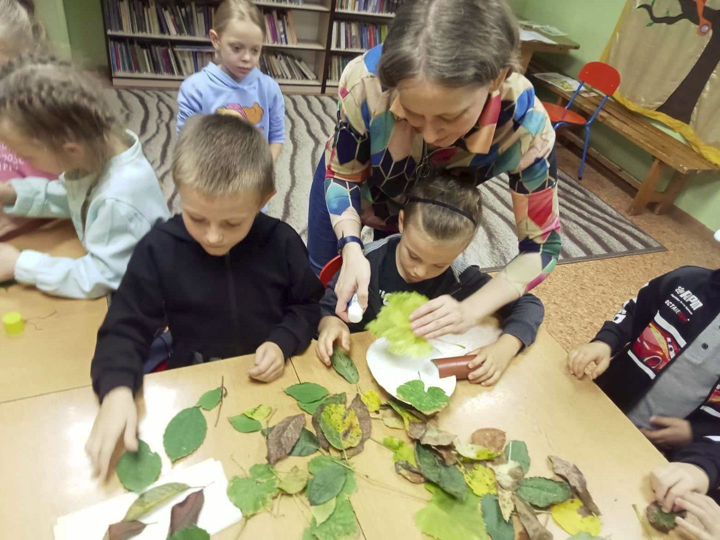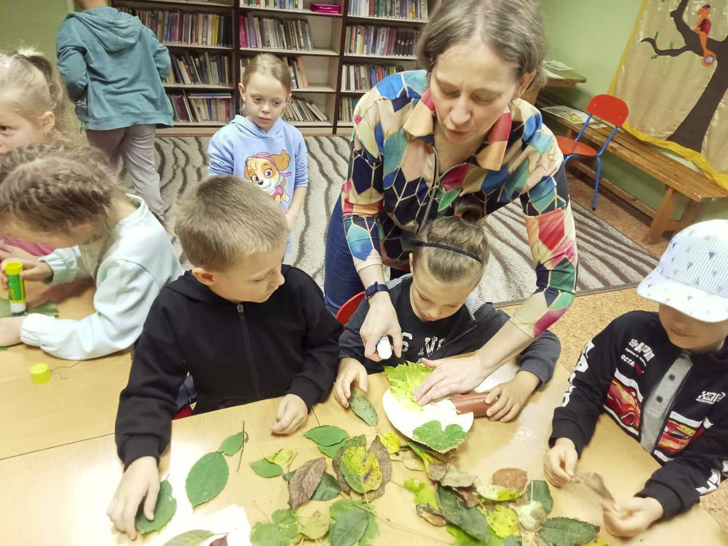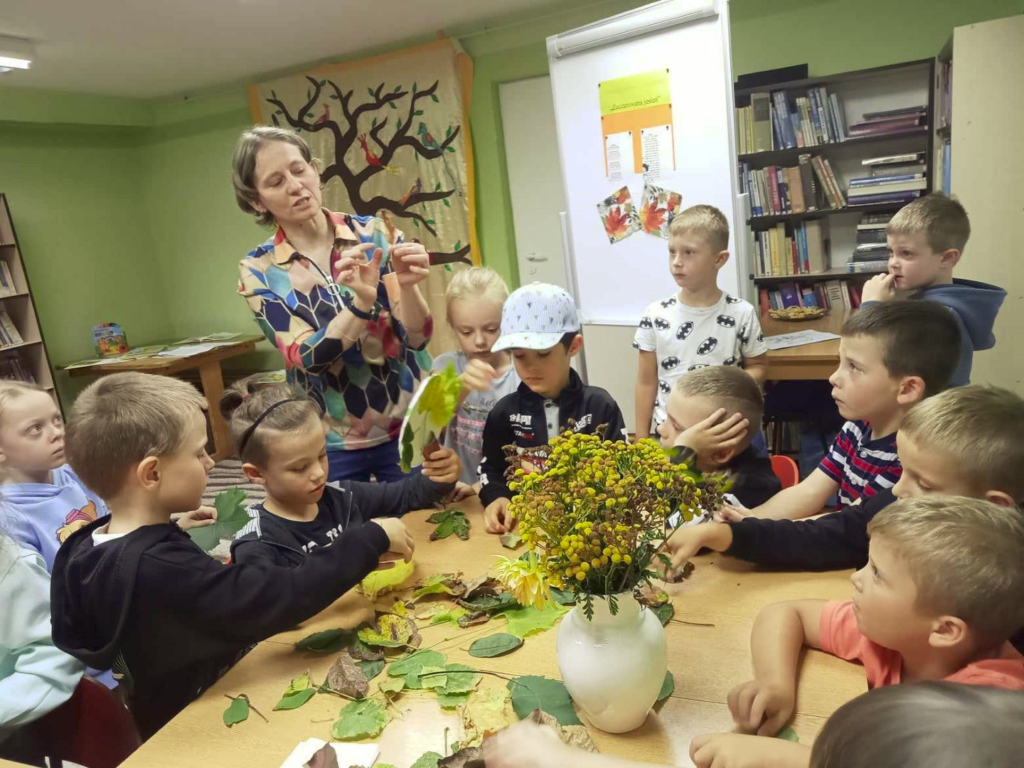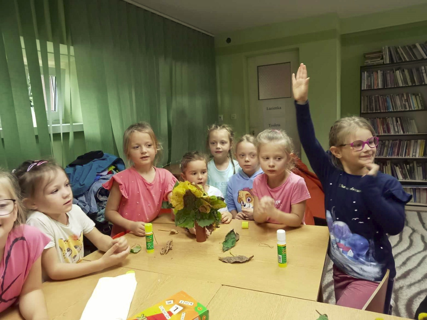 19 września 2023 r. w Filii nr 3 gościliśmy uczniów z klasy 0 „E” ze Szkoły Podstawowej nr 4 w Łęcznej. Dzieci wzięły udział w warsztatach literacko-plastycznych „Zaczarowana jesień”. Nasi goście wysłuchali wierszy o jesieni oraz poznali bajkę P. Księżyka pt: „Jeżyk Cyprian i pierwszy dzień jesieni”, z których usłyszeli o pięknie jesiennej przyrody i przygodach małego jeżyka. Dzieci rozpoznawały też jesienne kwiaty, owoce, warzywa i liście drzew. Pani Ewa pokazała dzieciom ciekawe książki o jesieni i nauczyła piosenki: „Jesień jak zaczarowana”, (słowa A. Bomba, muzyka M. Konarski). Następnie mali goście pod kierunkiem prowadzącej wykonali „Jesienne drzewka” z liści i materiałów ekologicznych .Wzięli też twórczy udział w grze „Remik słowny”, podczas której budowali słowa z literek. Wszyscy spisali się na medal i wykonali swoje zadania celująco. „Jesienne drzewka” dziewczynek i chłopców z klasy 0 „E” wyszły niemalże jak prawdziwe. Uczniowie wykazali się też biegłą znajomością literek i samodzielnie ułożyli słowa „Jesień” i inne jesienne słówka. Dziękujemy serdecznie za udział i zapraszamy do czytania książek o jesieni i nie tylko.