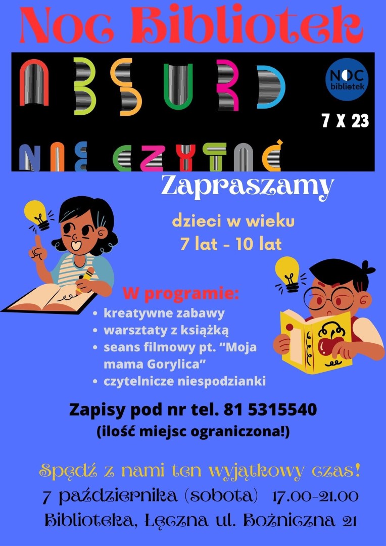 W dniu 7 października 2023 r. odbędzie się IX edycja Nocy Bibliotek pod hasłem „Absurd nie czytać”. Biblioteka przy ul. Bożnicznej 21 zaprasza dzieci w wieku 7-10 lat do wzięcia udziału w tym wyjątkowym święcie bibliotek i czytelników. Polecamy kreatywne zabawy, zagadki, warsztaty z książką oraz seans filmowy i czytelnicze niespodzianki. ZAPRASZAMY!!! Zapisy i wszelkie dodatkowe informacje na temat Nocy Bibliotek udziela Barbara Wójcik pod nr tel. 81 531 55 40 Ilość miejsc ograniczona!!!
