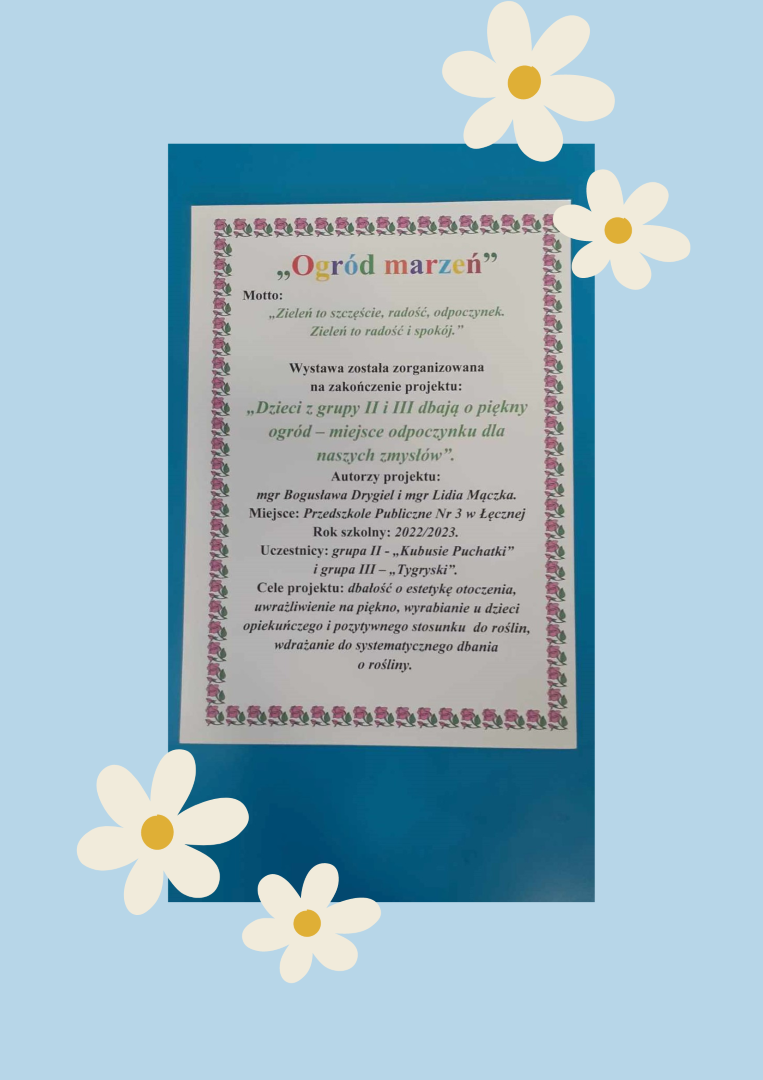 Wystawa została zorganizowana na zakończenie projektu „Dzieci z grupy II i III dbają o piękny ogród - miejsce odpoczynku dla naszych zmysłów.”