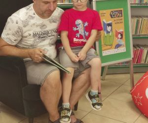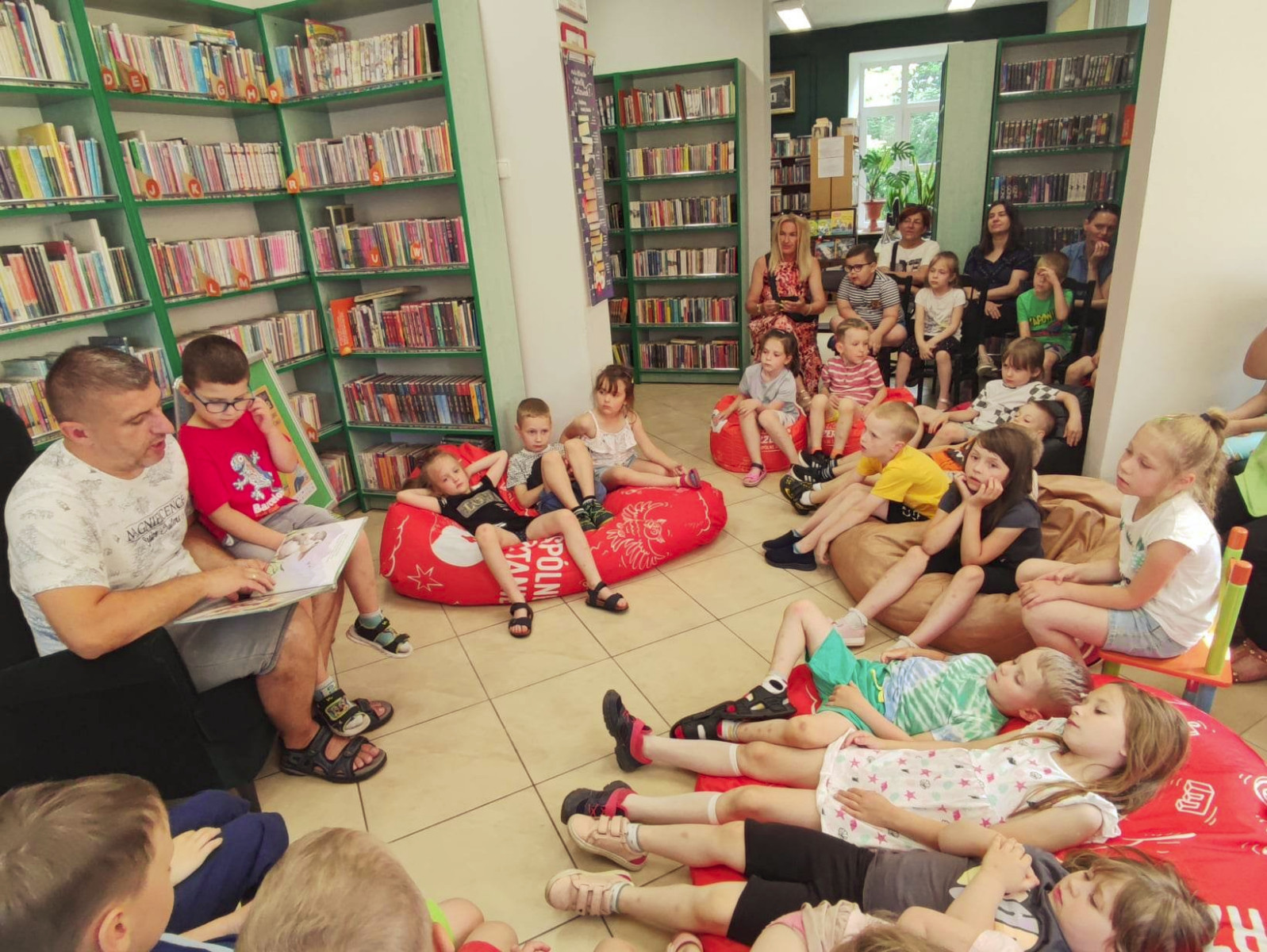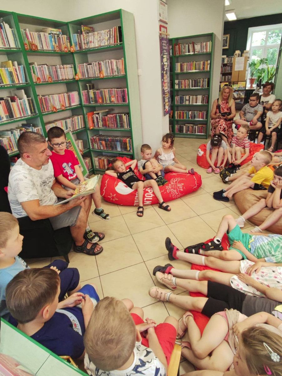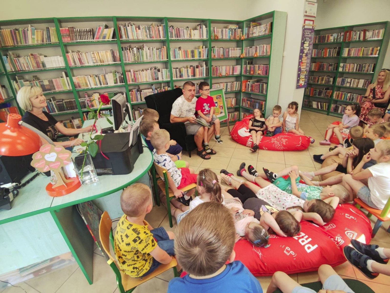 W upalne czwartkowe przedpołudnie 22 czerwca 2023 r. spotkaliśmy się w Bibliotece przy ul. Bożnicznej 21, z dziećmi z grup: „Muchomorki” oraz „Słoneczka” z Przedszkola Publicznego nr 1 w Łęcznej na głośnym czytaniu. Do udziału w akcji #TataTeżCzyta zaprosiliśmy Pana Tomasza Kwiatkowskiego, tatę Ignasia z grupy „Muchomorki”. Pan Tomasz, który bardzo często przychodzi ze swoim synem do biblioteki , z wielką przyjemnością przeczytał dzieciom książkę pt. „Dzień z tatą” autorstwa K. Richardsa. Przedszkolaki z ogromnym zainteresowaniem słuchały uroczej opowieści o zabawnym zajączku i jego tacie, a następnie odpowiadały na pytania bibliotekarki. Wybór książki do czytania nie był przypadkowy, bowiem jutro obchodzimy Dzień Taty. Podczas spotkania był czas na słuchanie piosenek o tacie oraz wspólne rozmowy. Na zakończenie dzieci otrzymały zakładki z logo akcji oraz słodką niespodziankę. Miłym akcentem spotkania było wspólne wyjście z „Muchomorkami” na pyszne lody.