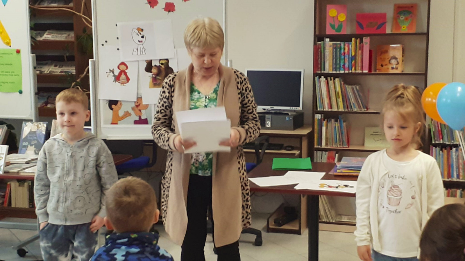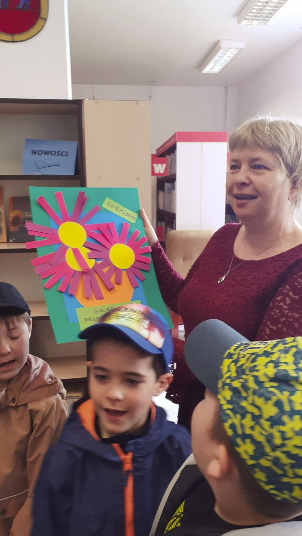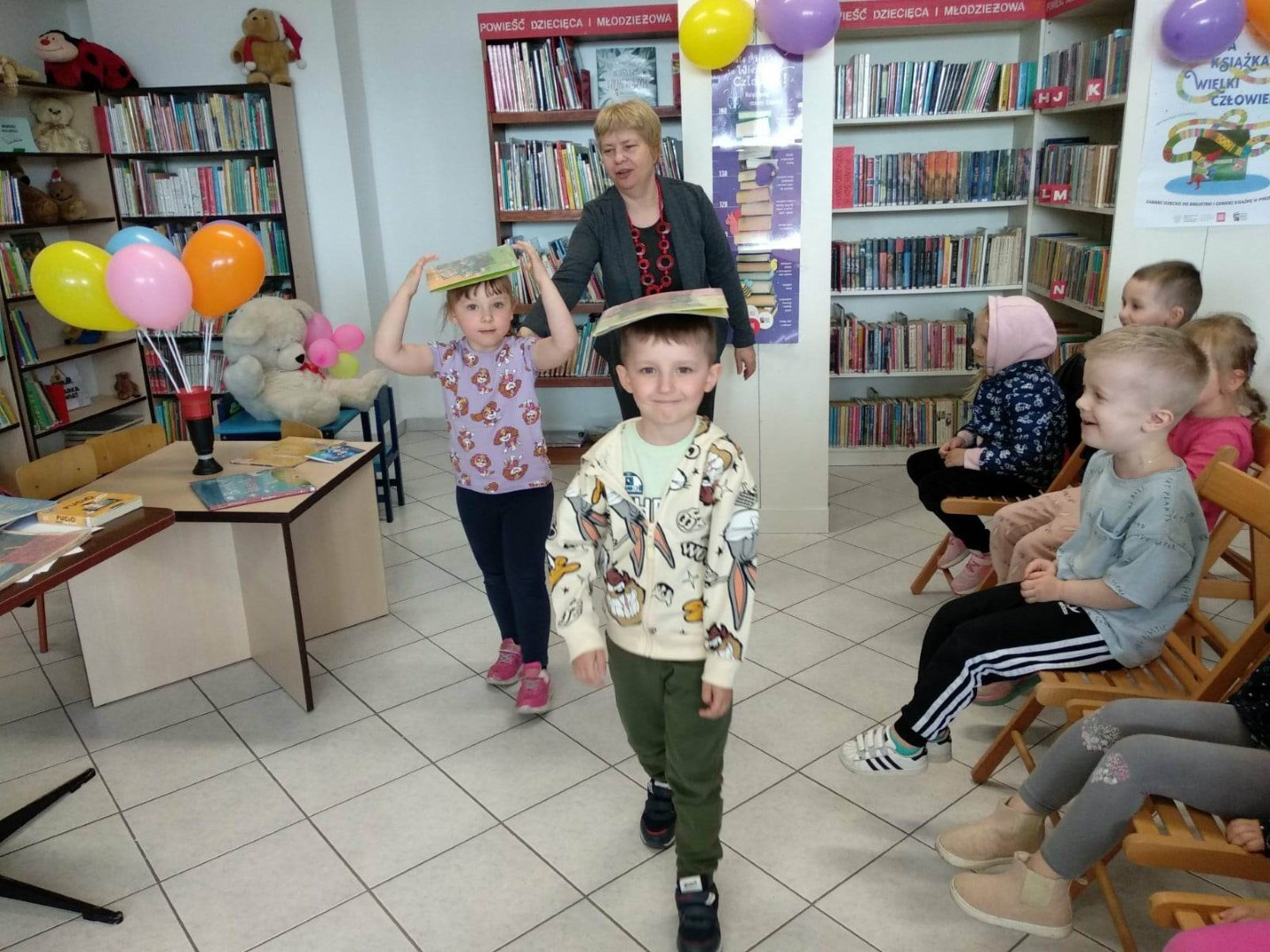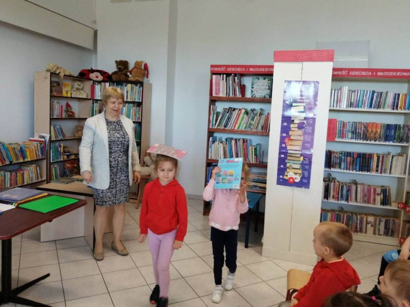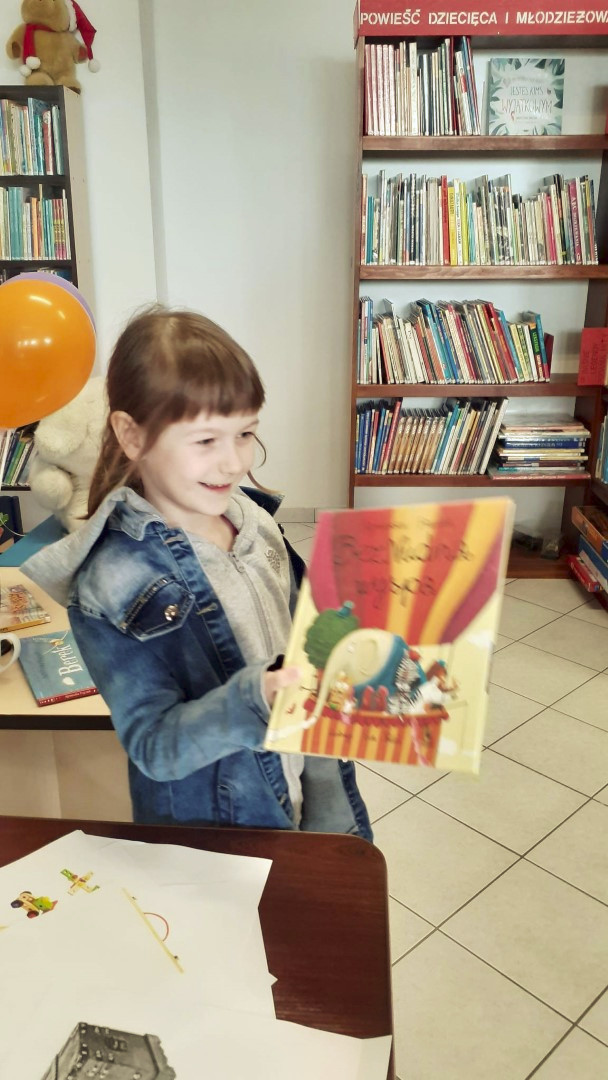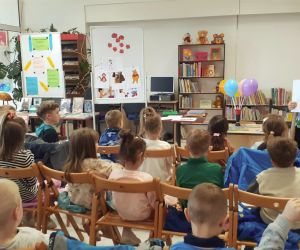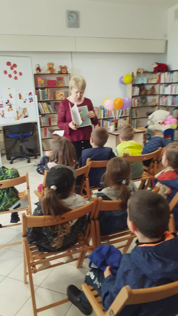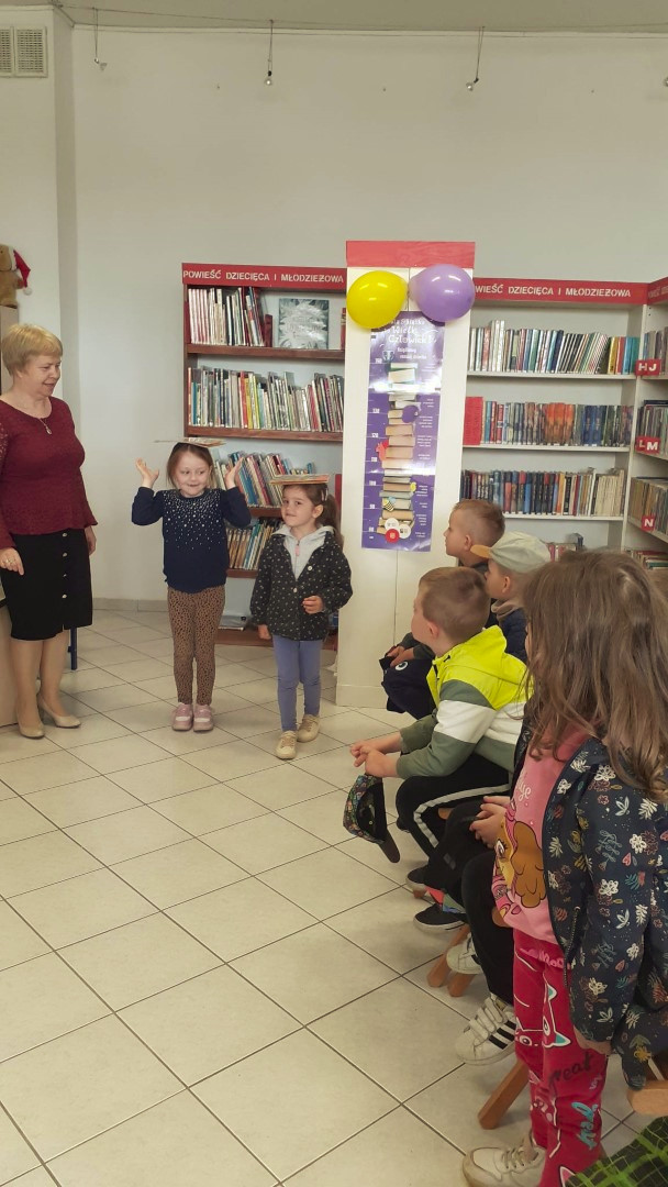 Prowadząca spotkanie przygotowała dla dzieci zgadywanki, opowiedziała bajkę, i przeczytała wiersz autorstwa Anny Kamieńskiej pt. „Książka”. W dalszej części przedszkolaki miały za zadanie odgadnąć m.in. postaci z bajek na podstawie fotografii i zgaduj-zgaduli. Dobrze poradziły sobie z odgadywaniem tytułów książek i bohaterów. W trakcie spotkania nie zabrakło również zabaw ruchowych „Ukryta książka” (wersja zabawy „Ciepło-zimno”) i konkurencji „Z książką na głowie”, w których dzieci wykazały dużo entuzjazmu i zapału.