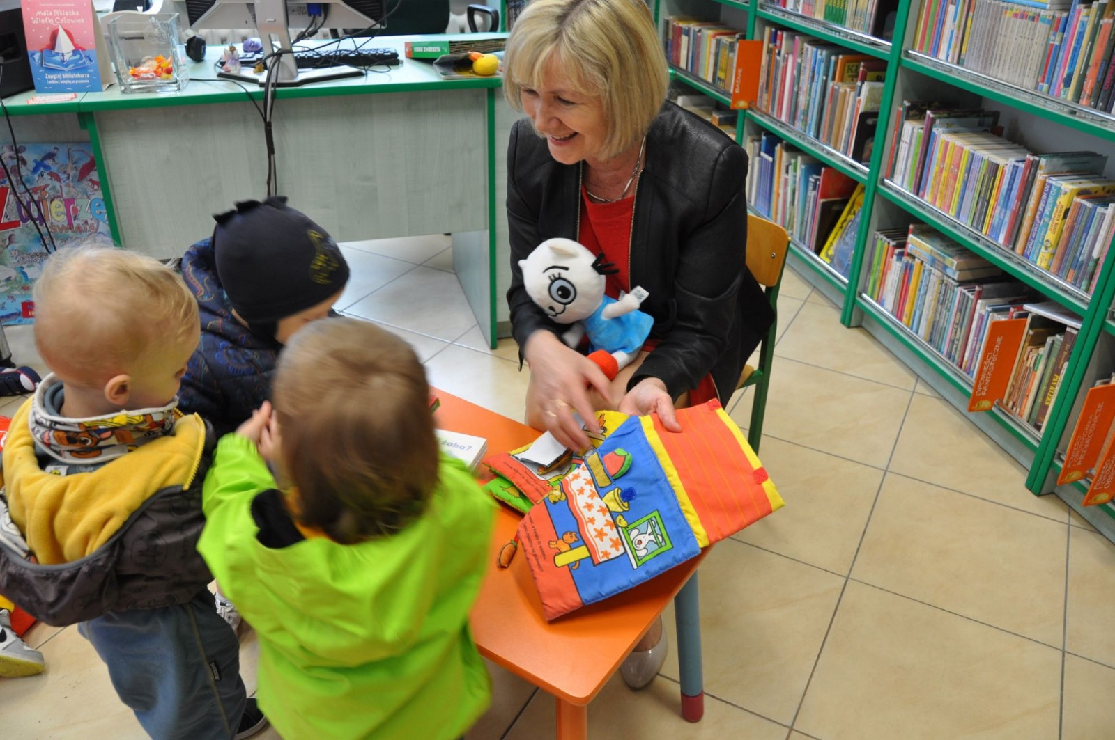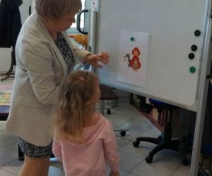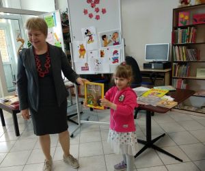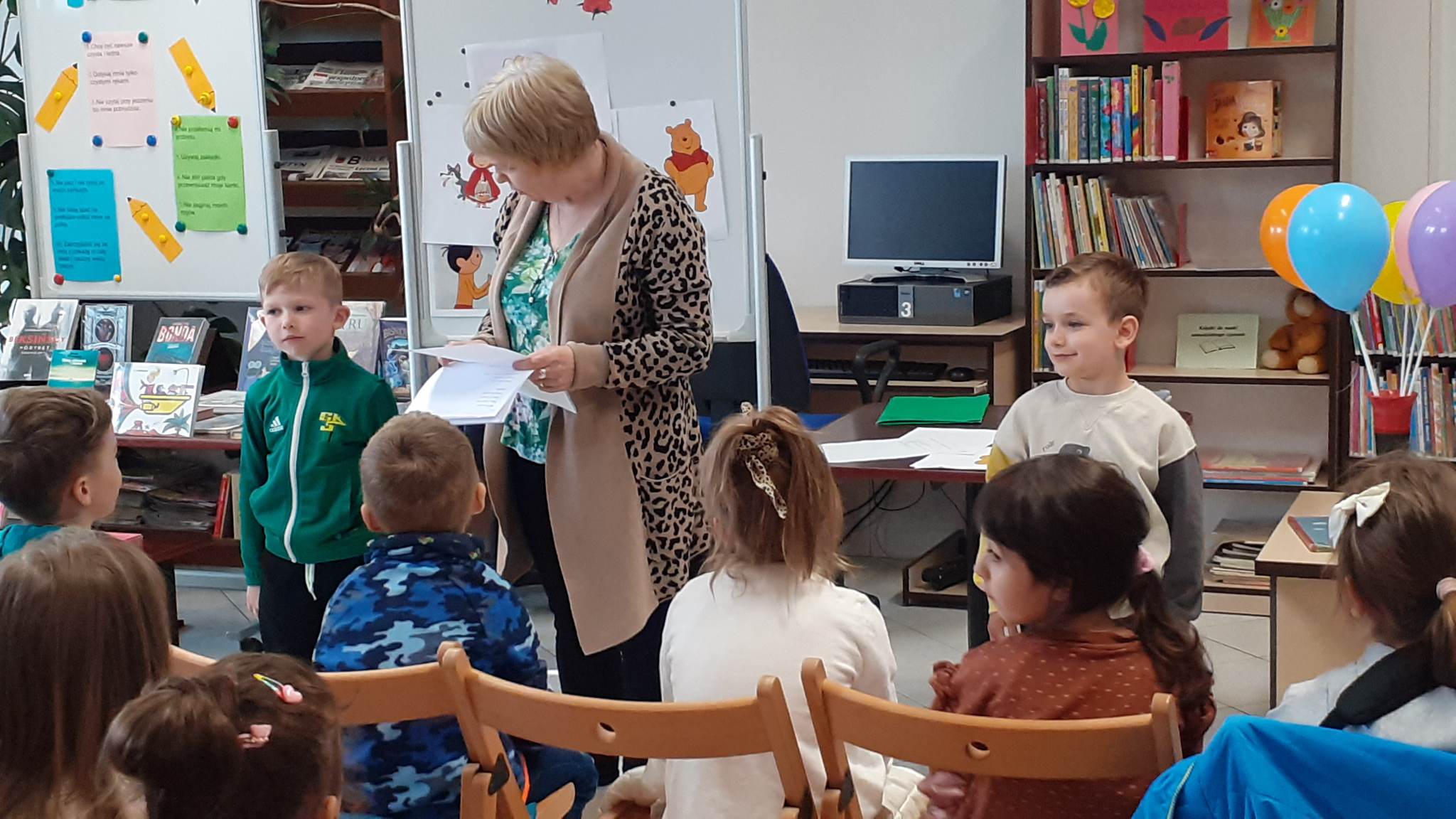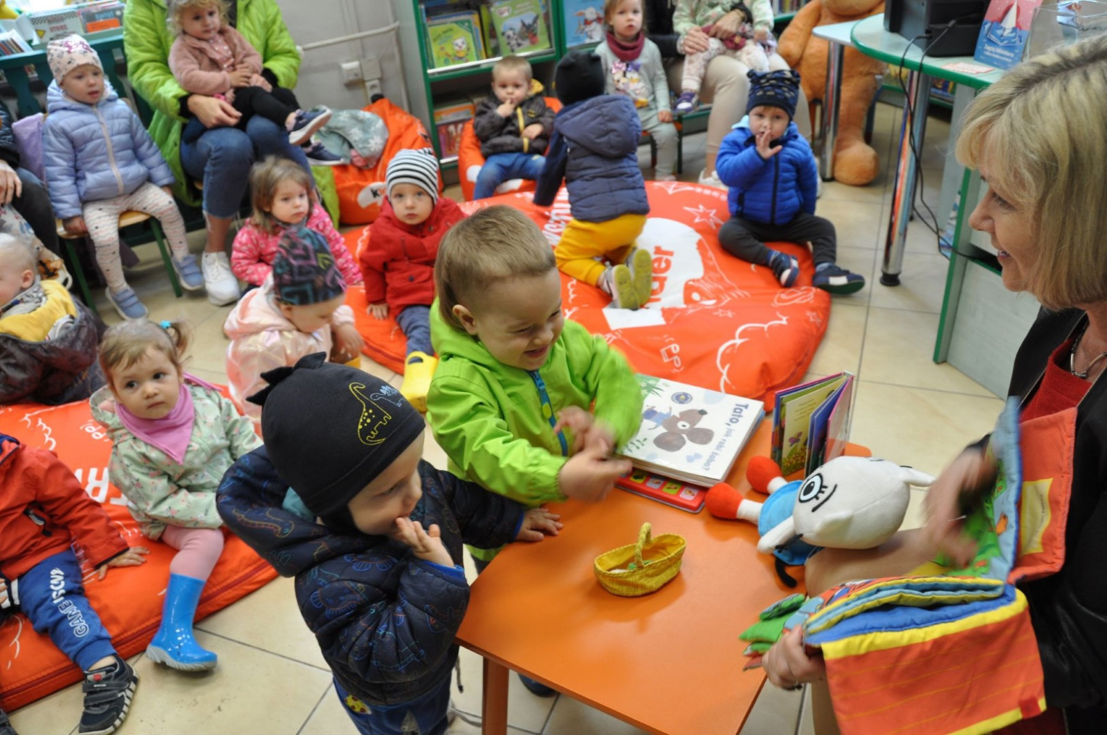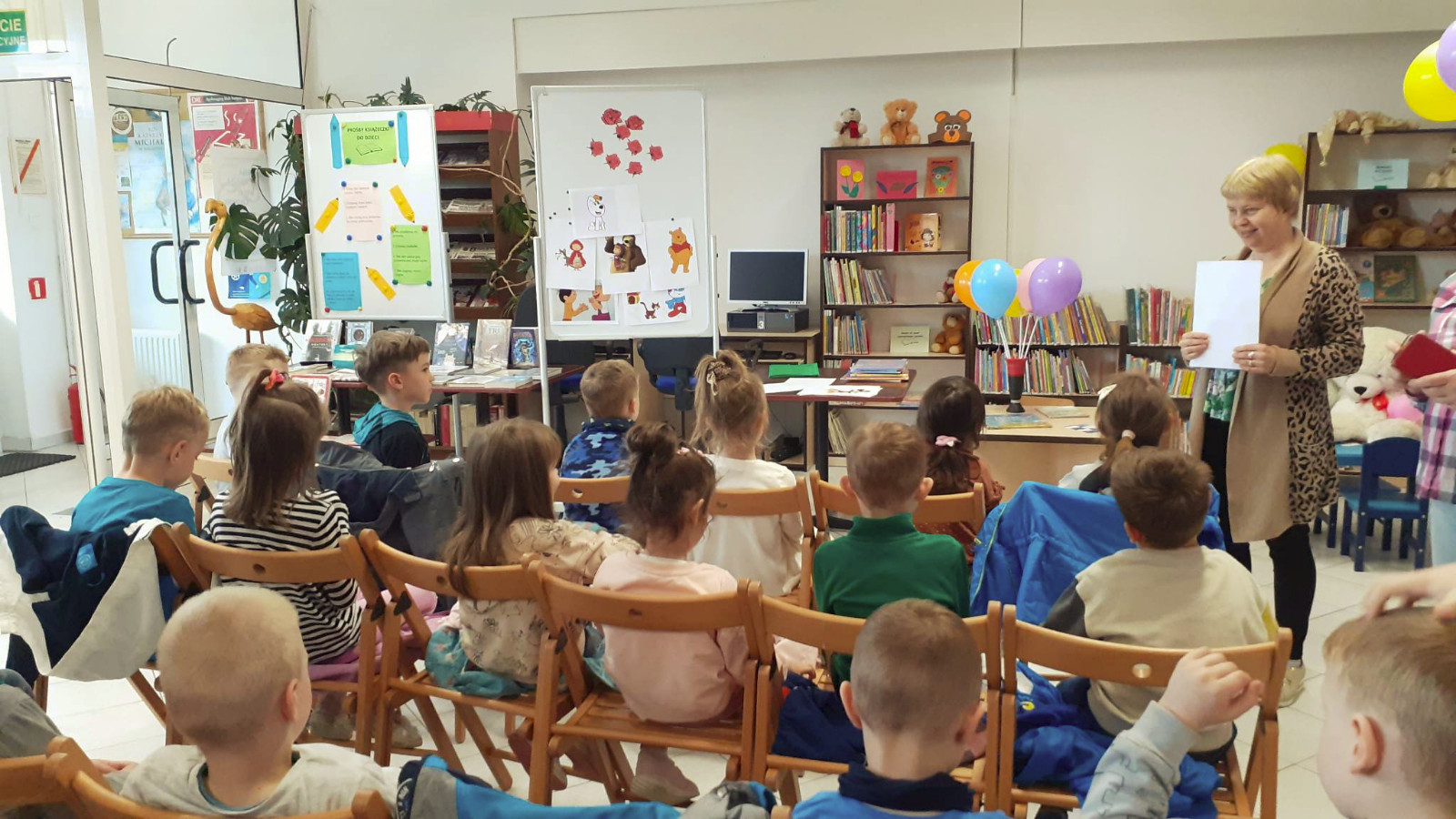 Prowadząca spotkanie przygotowała dla dzieci zgadywanki, opowiedziała bajkę, i przeczytała wiersz autorstwa Anny Kamieńskiej pt. „Książka”. W dalszej części przedszkolaki miały za zadanie odgadnąć m.in. postaci z bajek na podstawie fotografii i zgaduj-zgaduli. Dobrze poradziły sobie z odgadywaniem tytułów książek i bohaterów. W trakcie spotkania nie zabrakło również zabaw ruchowych „Ukryta książka” (wersja zabawy „Ciepło-zimno”) i konkurencji „Z książką na głowie”, w których dzieci wykazały dużo entuzjazmu i zapału.