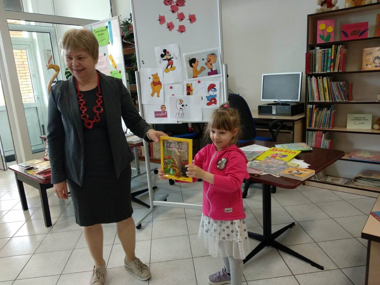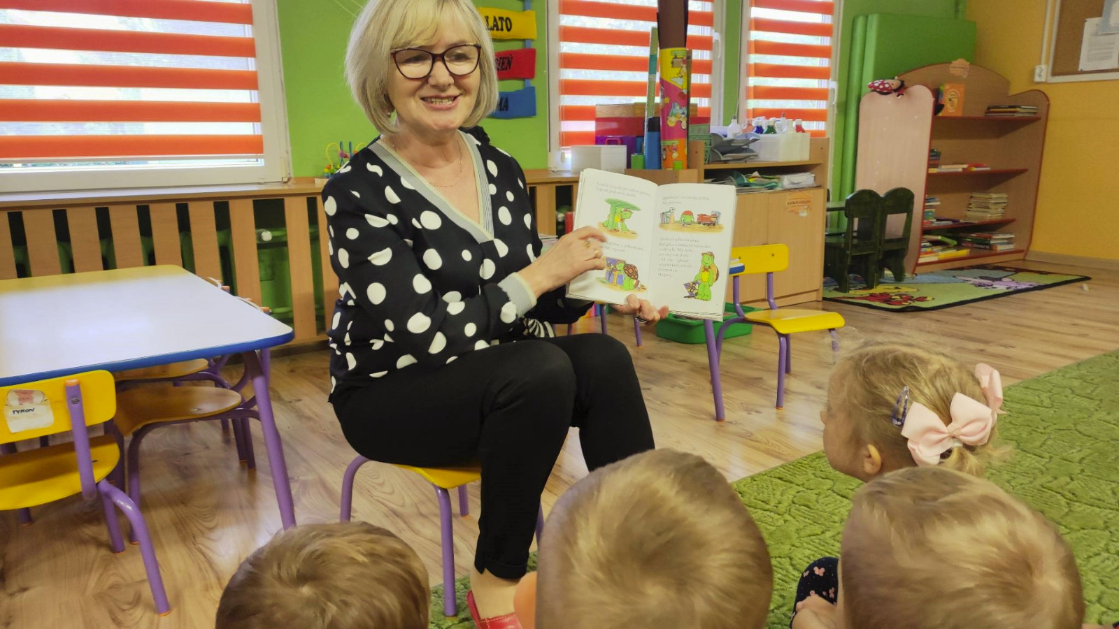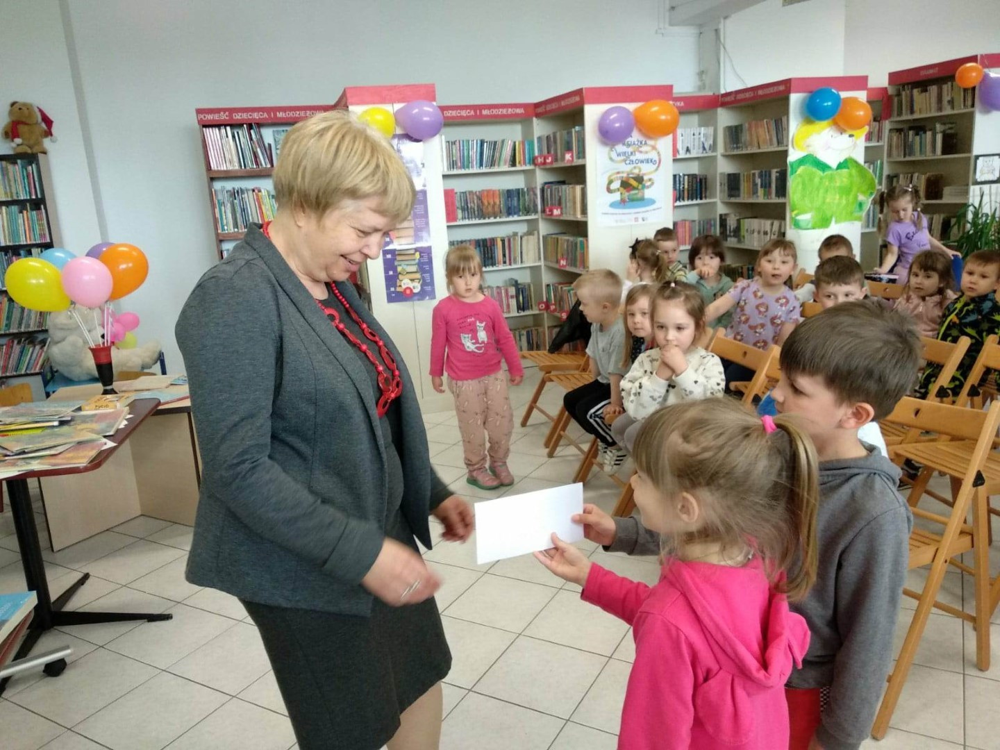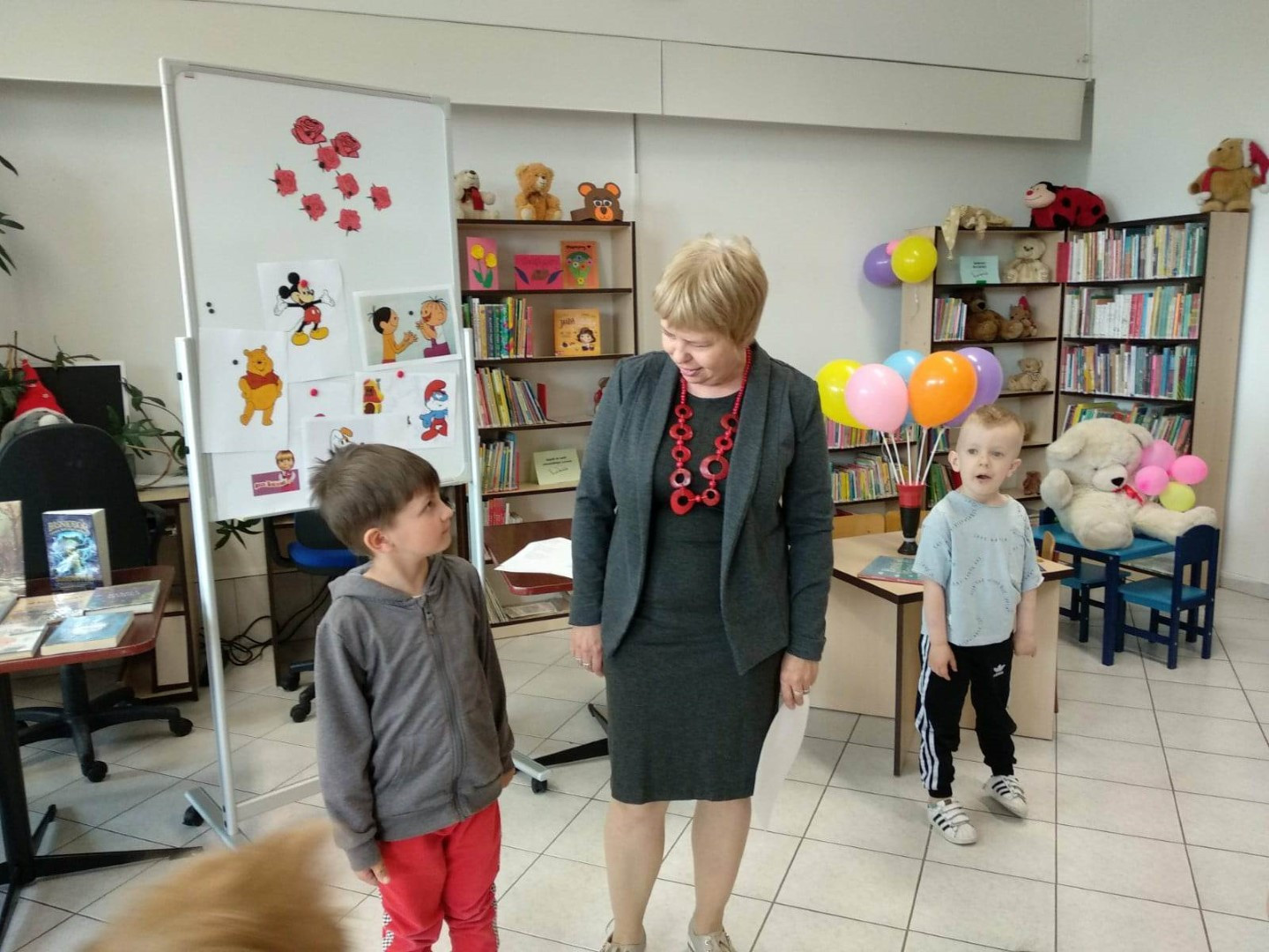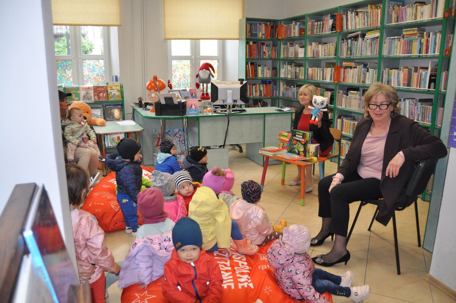 Prowadząca spotkanie przygotowała dla dzieci zgadywanki, opowiedziała bajkę, i przeczytała wiersz autorstwa Anny Kamieńskiej pt. „Książka”. W dalszej części przedszkolaki miały za zadanie odgadnąć m.in. postaci z bajek na podstawie fotografii i zgaduj-zgaduli. Dobrze poradziły sobie z odgadywaniem tytułów książek i bohaterów. W trakcie spotkania nie zabrakło również zabaw ruchowych „Ukryta książka” (wersja zabawy „Ciepło-zimno”) i konkurencji „Z książką na głowie”, w których dzieci wykazały dużo entuzjazmu i zapału.