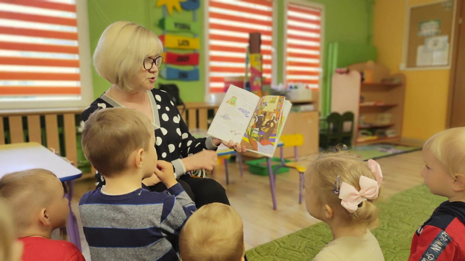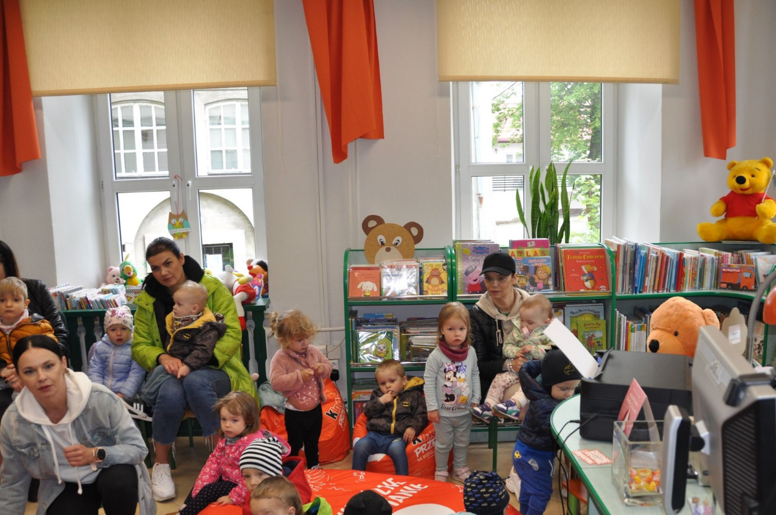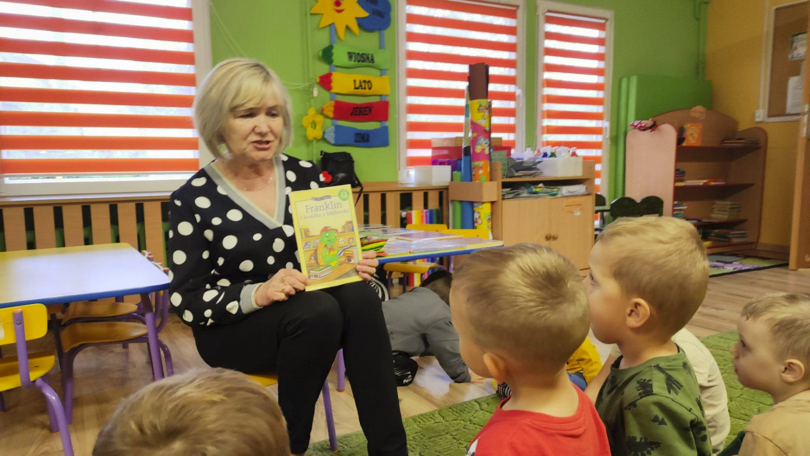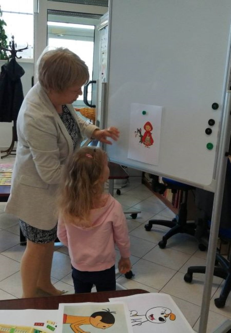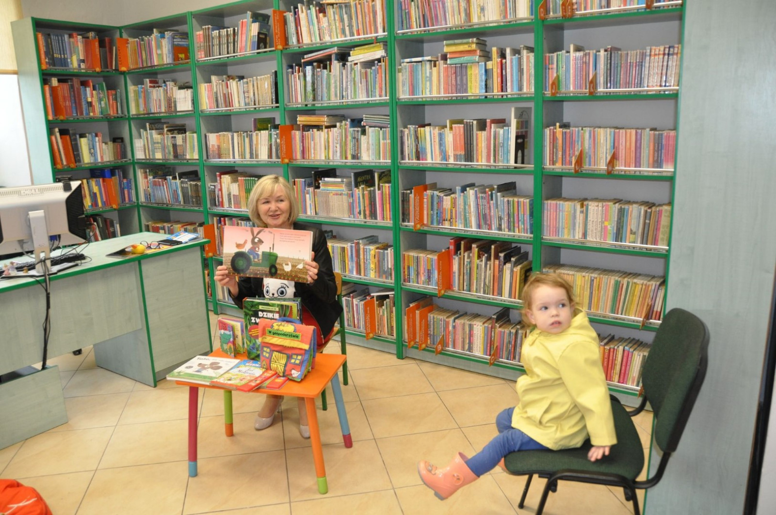 Prowadząca spotkanie przygotowała dla dzieci zgadywanki, opowiedziała bajkę, i przeczytała wiersz autorstwa Anny Kamieńskiej pt. „Książka”. W dalszej części przedszkolaki miały za zadanie odgadnąć m.in. postaci z bajek na podstawie fotografii i zgaduj-zgaduli. Dobrze poradziły sobie z odgadywaniem tytułów książek i bohaterów. W trakcie spotkania nie zabrakło również zabaw ruchowych „Ukryta książka” (wersja zabawy „Ciepło-zimno”) i konkurencji „Z książką na głowie”, w których dzieci wykazały dużo entuzjazmu i zapału.