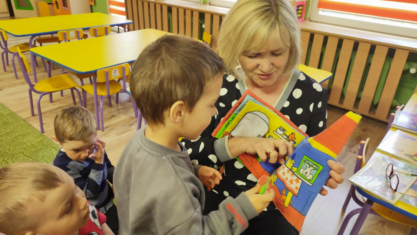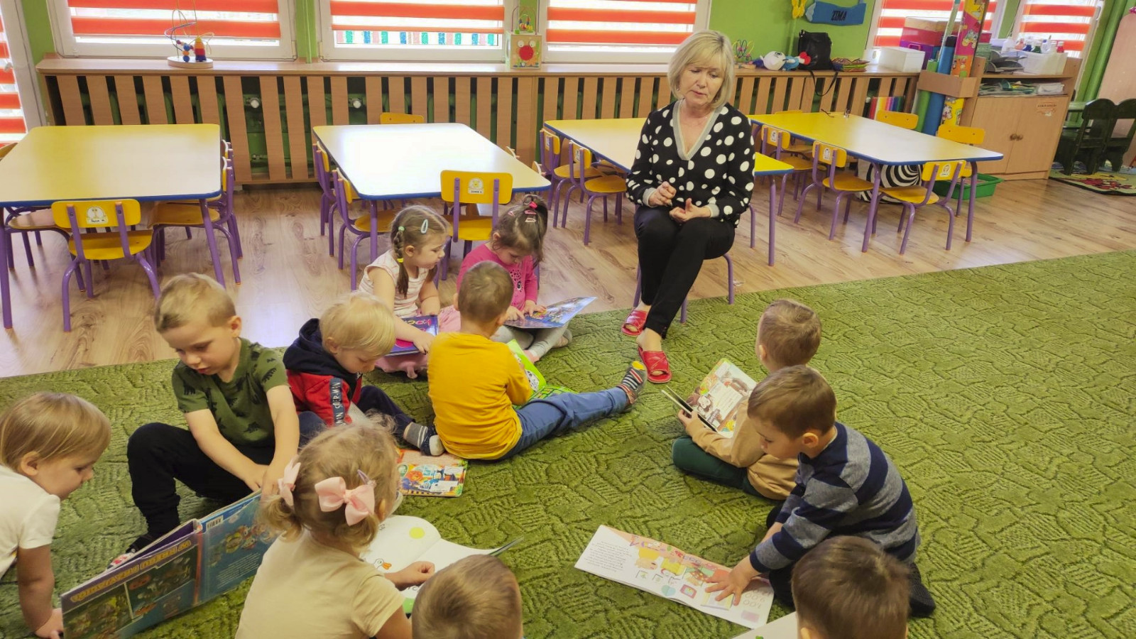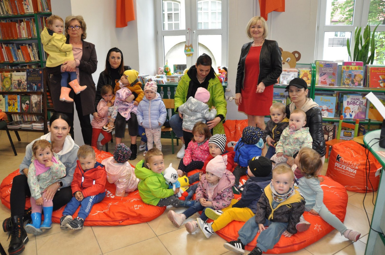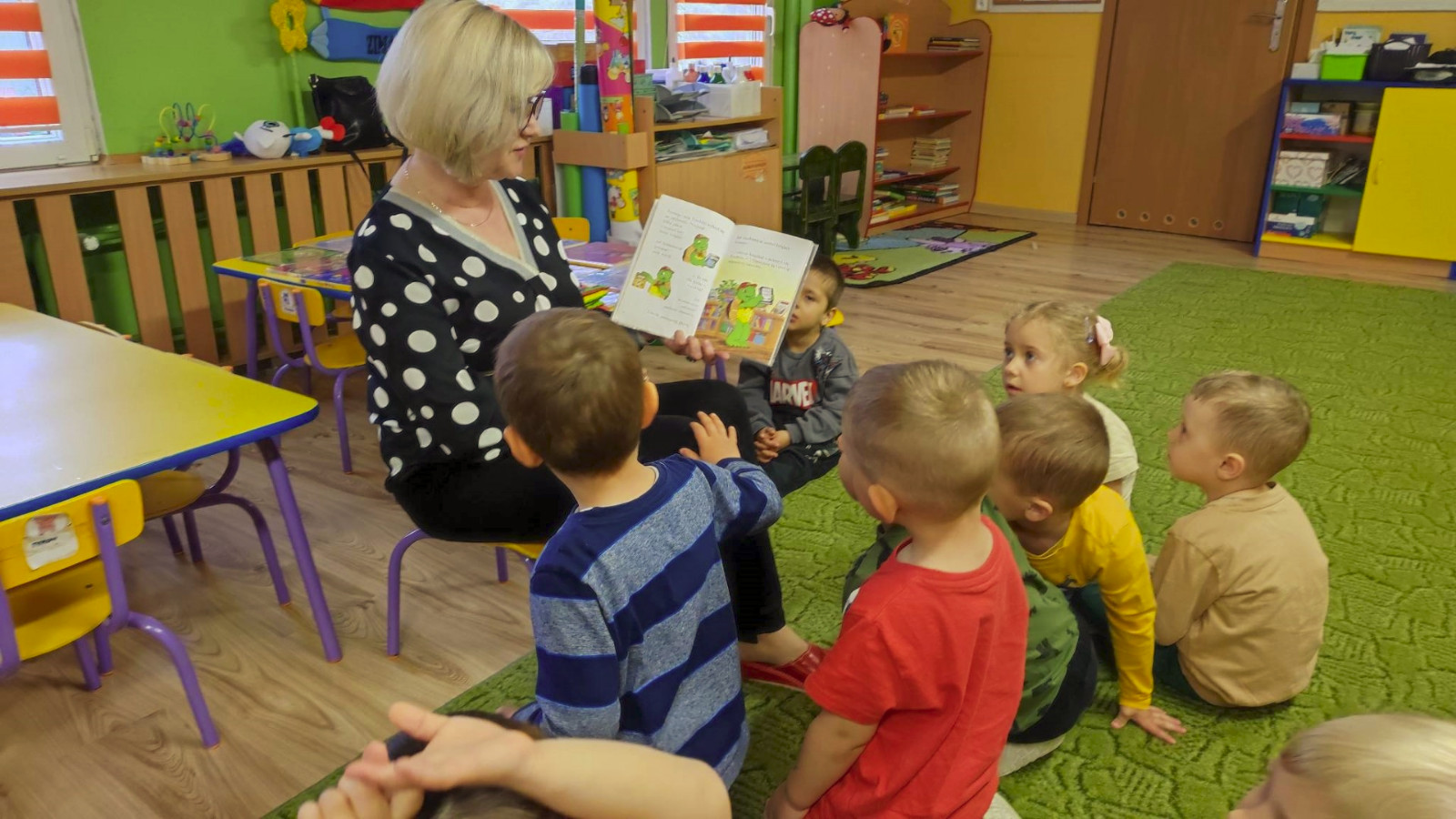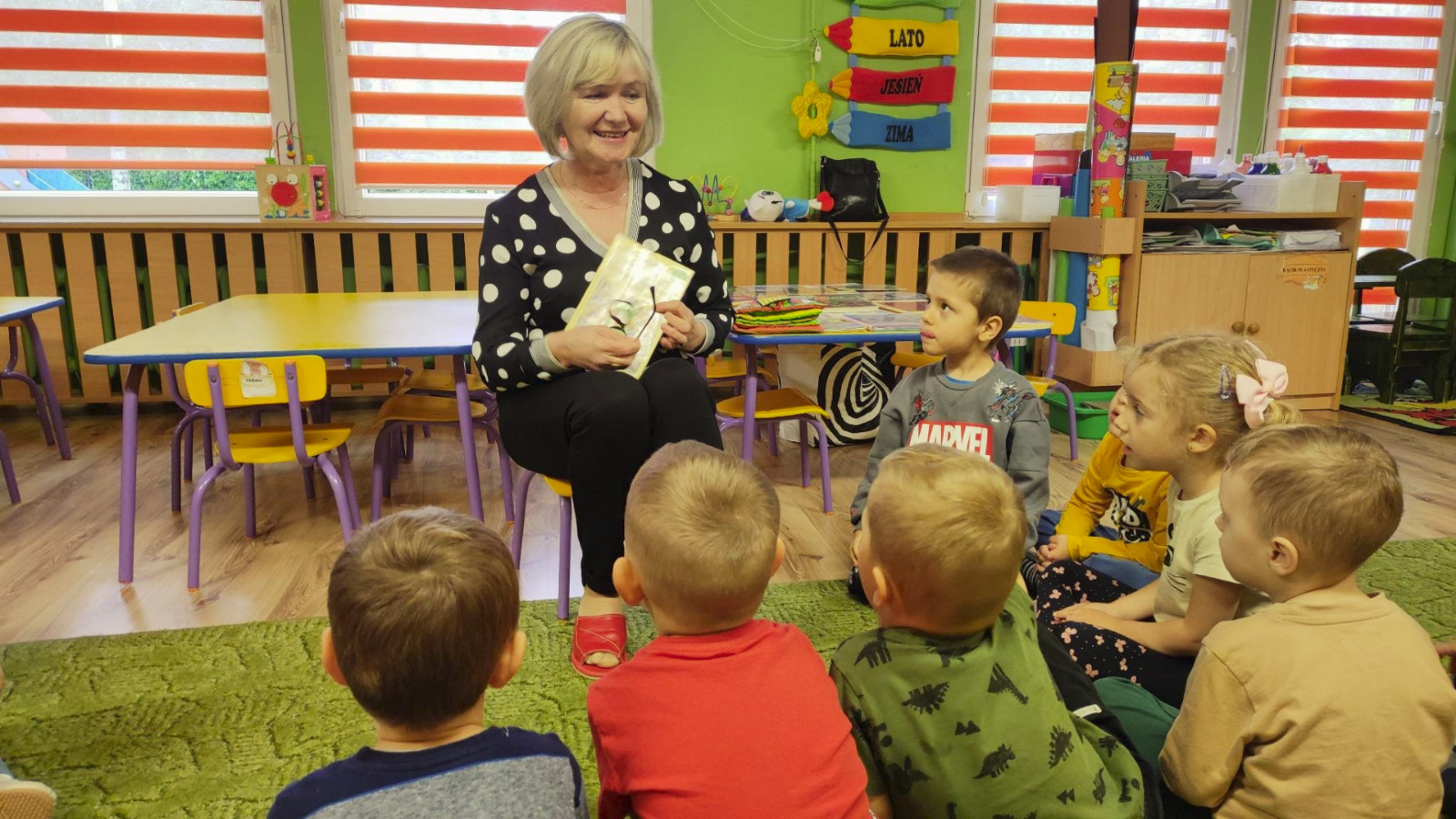 Prowadząca spotkanie przygotowała dla dzieci zgadywanki, opowiedziała bajkę, i przeczytała wiersz autorstwa Anny Kamieńskiej pt. „Książka”. W dalszej części przedszkolaki miały za zadanie odgadnąć m.in. postaci z bajek na podstawie fotografii i zgaduj-zgaduli. Dobrze poradziły sobie z odgadywaniem tytułów książek i bohaterów. W trakcie spotkania nie zabrakło również zabaw ruchowych „Ukryta książka” (wersja zabawy „Ciepło-zimno”) i konkurencji „Z książką na głowie”, w których dzieci wykazały dużo entuzjazmu i zapału.