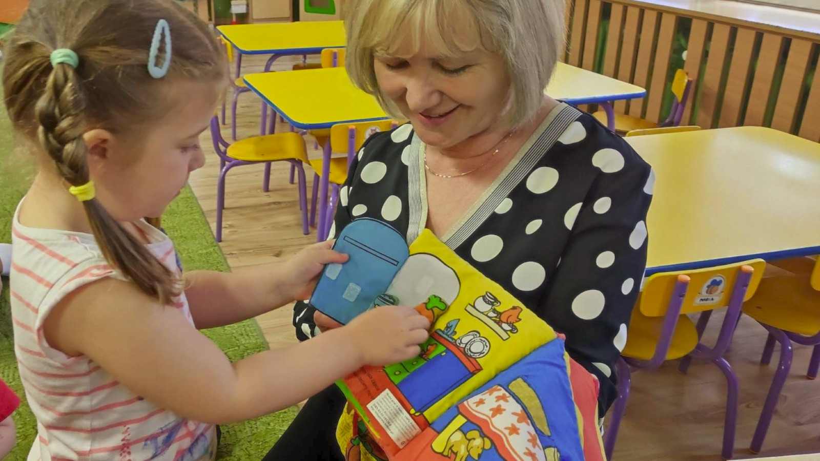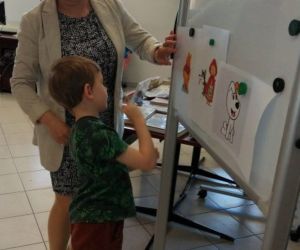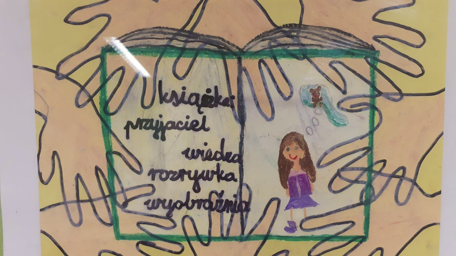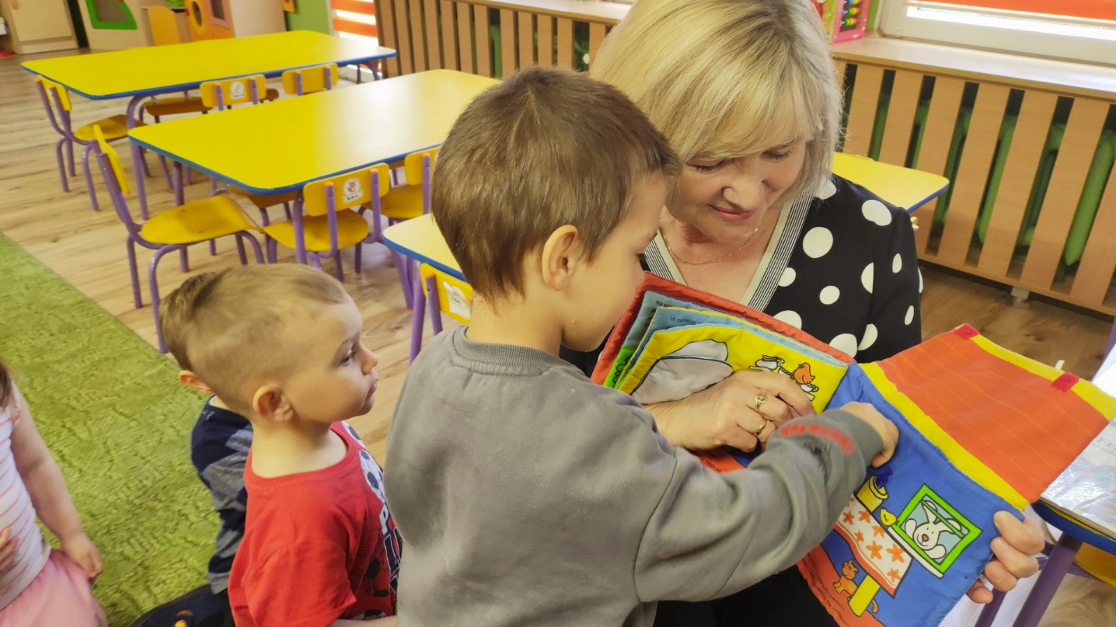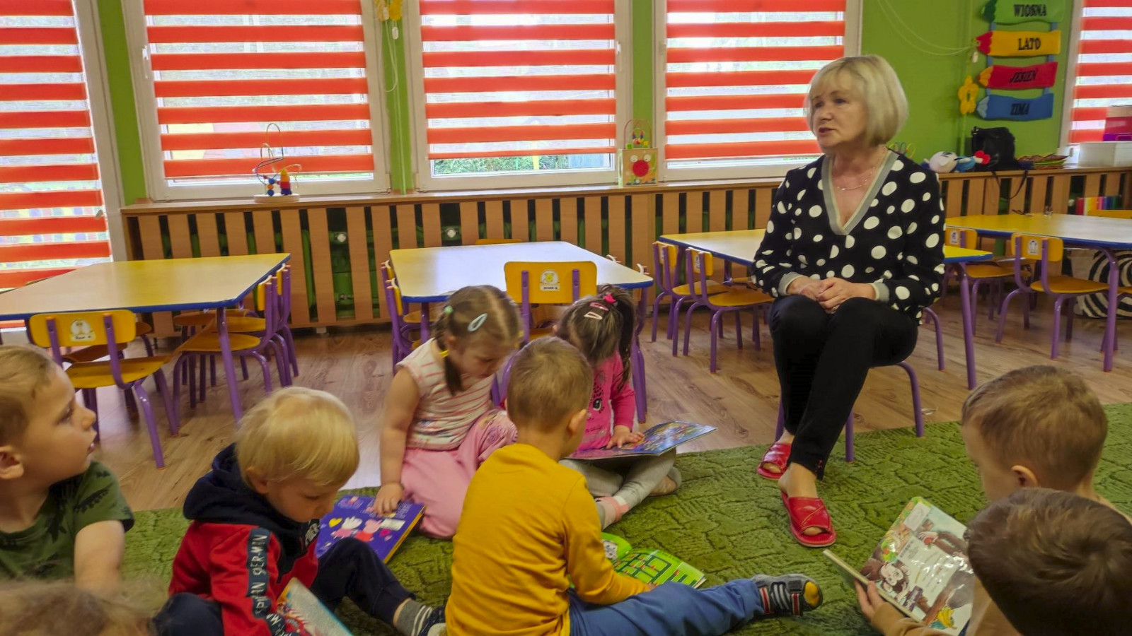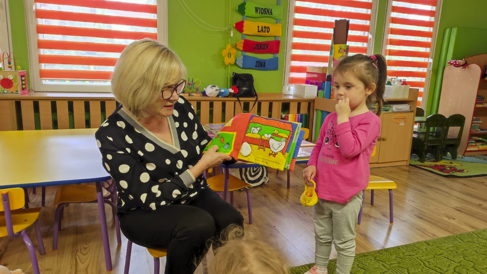 Prowadząca spotkanie przygotowała dla dzieci zgadywanki, opowiedziała bajkę, i przeczytała wiersz autorstwa Anny Kamieńskiej pt. „Książka”. W dalszej części przedszkolaki miały za zadanie odgadnąć m.in. postaci z bajek na podstawie fotografii i zgaduj-zgaduli. Dobrze poradziły sobie z odgadywaniem tytułów książek i bohaterów. W trakcie spotkania nie zabrakło również zabaw ruchowych „Ukryta książka” (wersja zabawy „Ciepło-zimno”) i konkurencji „Z książką na głowie”, w których dzieci wykazały dużo entuzjazmu i zapału.