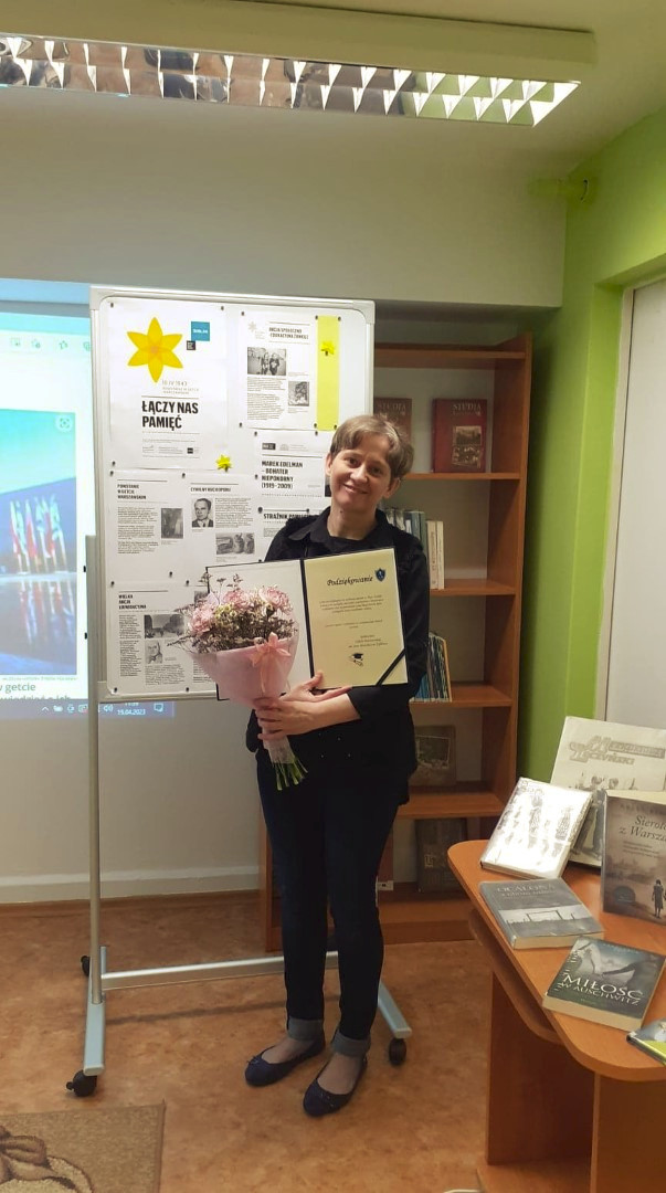 19 kwietnia 2023 r. obchodzimy 80. rocznicę wybuchu Powstania w getcie warszawskim. Z tej okazji Filia nr 3 we współpracy z inicjatorem ogólnopolskiej Akcji społeczno - edukacyjnej „Żonkile” - Muzeum POLIN w Warszawie zorganizowała zajęcia edukacyjne poświęcone 80.rocznicy wybuchu Powstania w getcie warszawskim. W spotkaniu wzięli udział uczniowie klas VII-VIII ze Szkoły Podstawowej im. Jana Brzechwy w Zofiówce wraz z nauczycielami: panem Waldemarem Jabłońcem i panią Marzeną Kowalczyk, przedstawiciel Rady Miejskiej w Łęcznej: Przewodnicząca Komisji Rolnictwa i Ochrony Środowiska pani Halina Mazurkiewicz, Dyrektor Miejsko-Gminnej Biblioteki Publicznej im. Z. Herberta w Łęcznej pani Monika Mazurkiewicz. Prowadząca spotkanie zaprezentowała uczestnikom ideę ogólnopolskiej akcji społeczno-edukacyjnej „Żonkile”, którą obchodzimy 19 kwietnia w całej Polsce. Zgromadzeni goście poznali przyczyny i okoliczności Powstania w getcie warszawskim widzianą oczami świadka historii Marka Edelmana, ostatniego przywódcy Żydowskiej Organizacji Bojowej, który przeżył likwidację getta - przedstawioną w reportażu Hanny Krall. Dzięki współpracy z Muzeum POLIN w Warszawie wszyscy uczestnicy mogli obejrzeć premierę filmu „Zdążyć przed Panem Bogiem” opartej na kanwie słynnego reportażu oraz ciekawe prezentacje związane z losami ludności żydowskiej. Bibliotekarka przybliżyła tragiczne losy ludności żydowskiej podczas okupacji niemieckiej na ziemiach polskich nawiązując także do getta łęczyńskiego. W ciekawym filmie widzowie obejrzeli niezwykłą historię człowieka, który w getcie warszawskim z Umschlagplazt „odprowadzał” tysiące swoich rodaków do wagonów, jadących do obozu zagłady do Treblinki. Po zakończeniu II wojny światowej Marek Edelman został lekarzem, cenionym kardiologiem, ratował życie wielu pacjentów. Uważał, że zawsze należy walczyć do końca o każde życie. W 1968 r. podczas „nagonki komunistycznej”, mimo rozdzielenia z rodziną pozostał w Polsce, „aby opiekować się grobami towarzyszy broni i poległych w powstaniu”. Przez lata pielęgnował pamięć o wydarzeniach z 1943 roku. Do końca życia w rocznicę powstania przychodził pod Pomnik Bohaterów Getta. Wraz z nim przychodziło coraz więcej ludzi z żółtymi kwiatami by oddać hołd poległym. Żółty żonkil stał się symbolem zbiorowej pamięci. Marek Edelman zmarł w 2009 roku. Przez swoją niezwykła postawę przeniósł wraz innymi ocalałymi pamięć o „Powstaniu w getcie warszawskim”. Od 2013 roku Muzeum POLIN w Warszawie organizuje ogólnopolską akcję społeczno-edukacyjną „Żonkile”, która co roku powiększa liczbę uczestników. W tym roku w pięciu największych miastach Polski wolontariusze będą rozdawać 450 000 papierowych żonkili czyli tyle, ile liczyła liczba mieszkańców getta warszawskiego. Akcja „Żonkile” już po raz szósty jest organizowana w naszej bibliotece. W tym roku także Biblioteka Głowna i wszystkie Filie rozdają naszym czytelnikom papierowe żonkile.