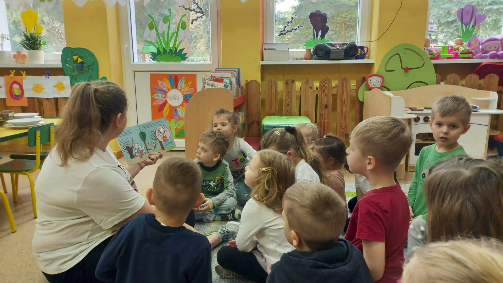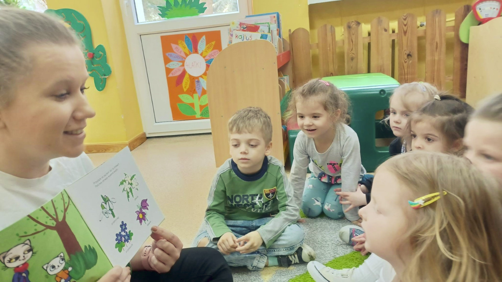 Dzieci wysłuchały książeczki Anity Głowińskiej z serii Kicia Kocia pt. „Wiosna”, którą przeczytała bibliotekarka z Filii nr 1.