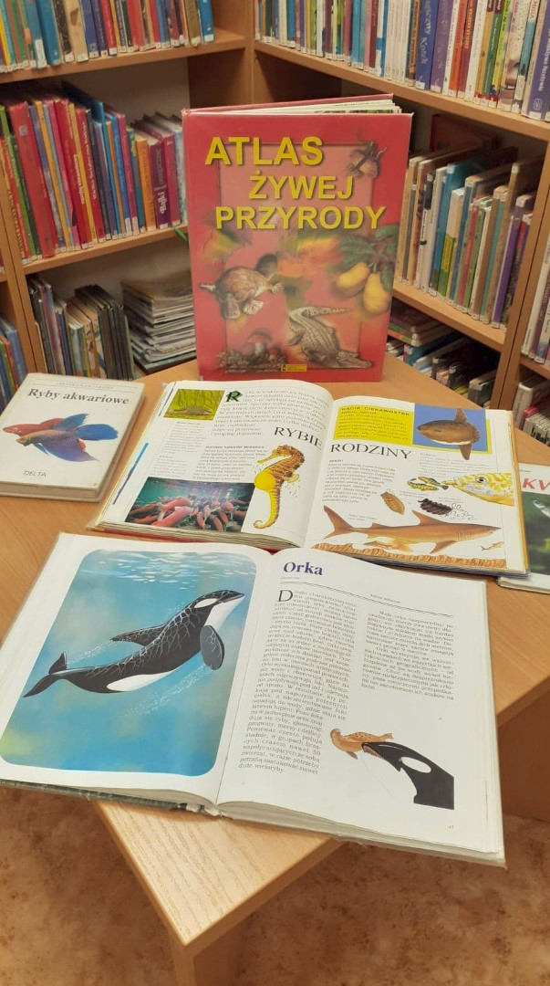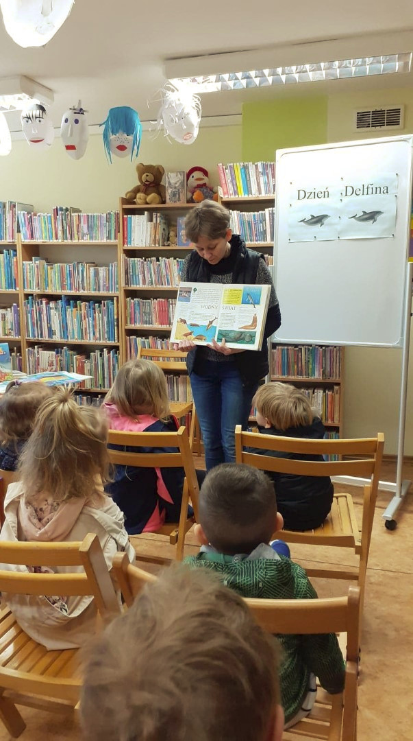 Podczas głośnego czytania nasi czytelnicy wysłuchali ciekawostek o delfinach oraz wierszy: „Delfiny” Marty Próchniewicz i „Ryba” Michała Jankowiaka. Następnie dzieci obejrzały różnorodne ciekawe książeczki ze zdjęciami i rysunkami delfinów oraz ryb morskich.