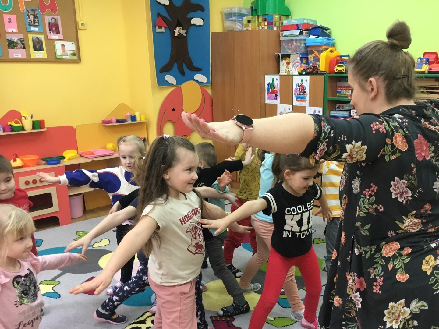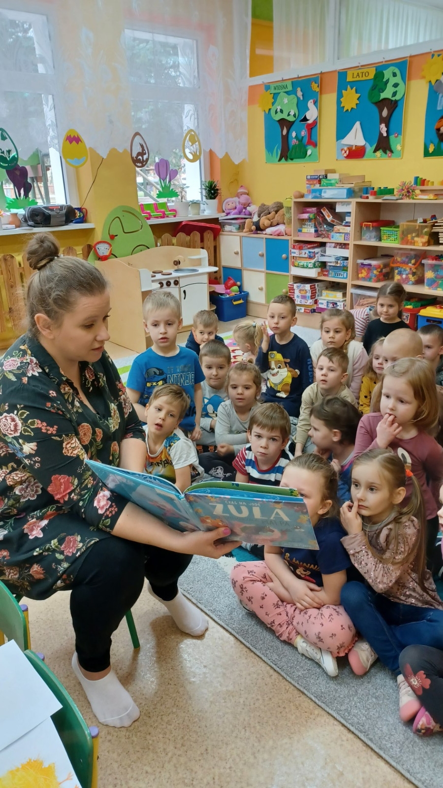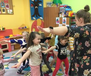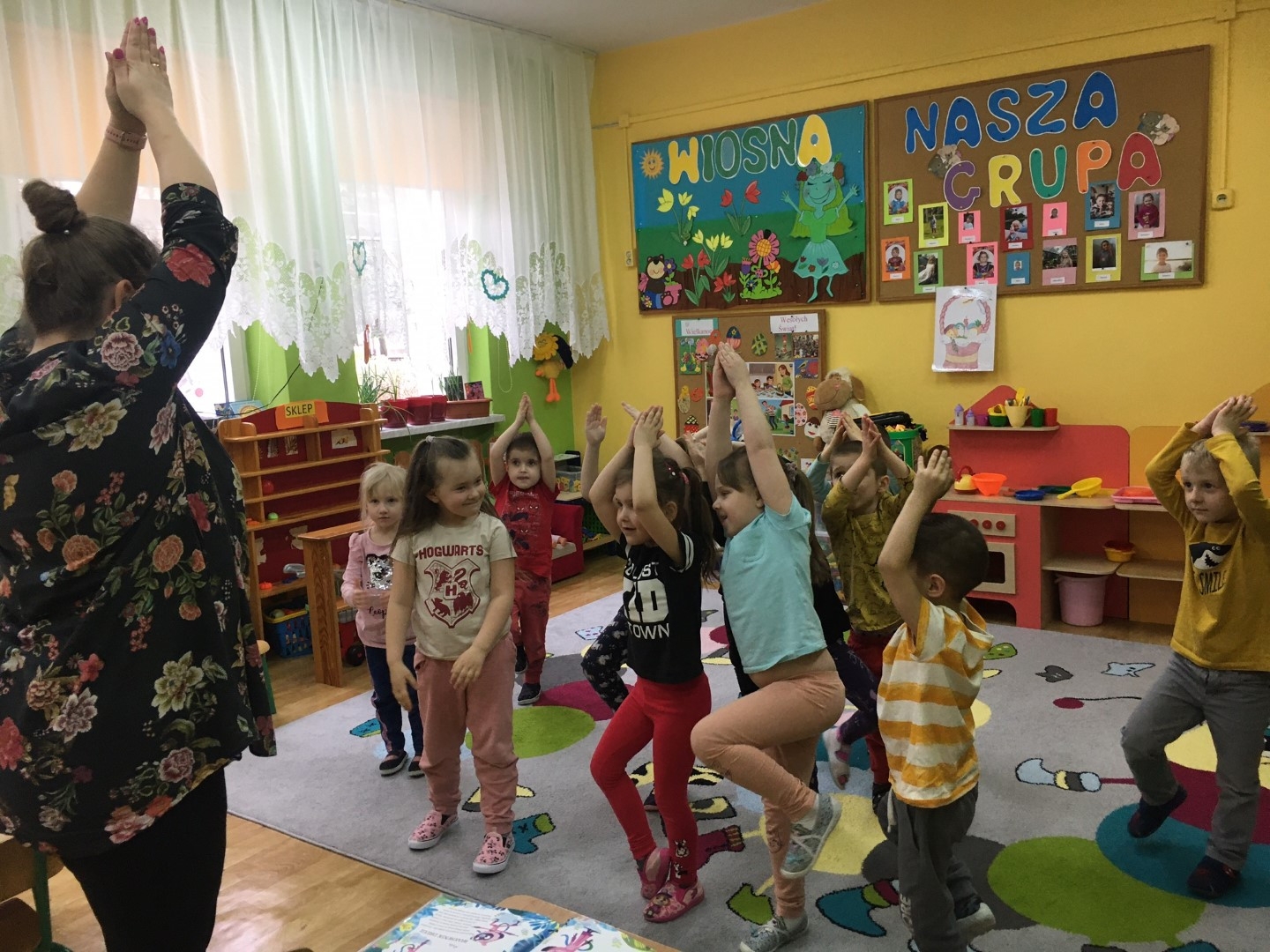 Po wysłuchaniu opowiadania razem wykonaliśmy kilka ćwiczeń. Była np. pozycja góry i drzewa. Dzieci były bardzo zadowolone z takiej formy zajęć.