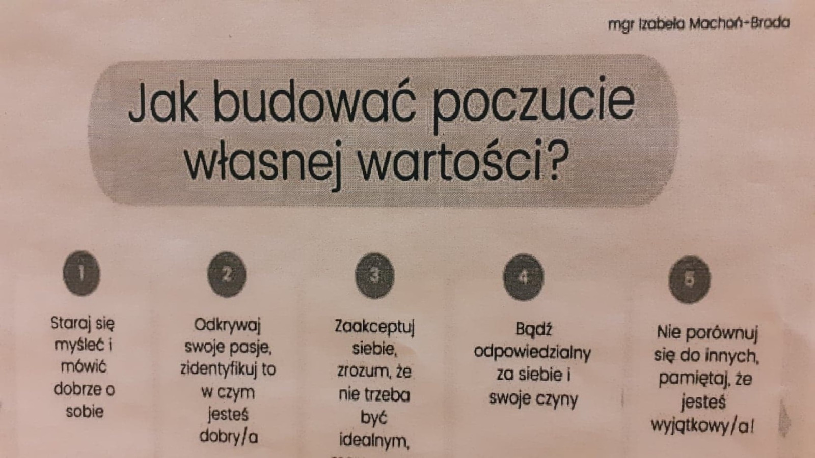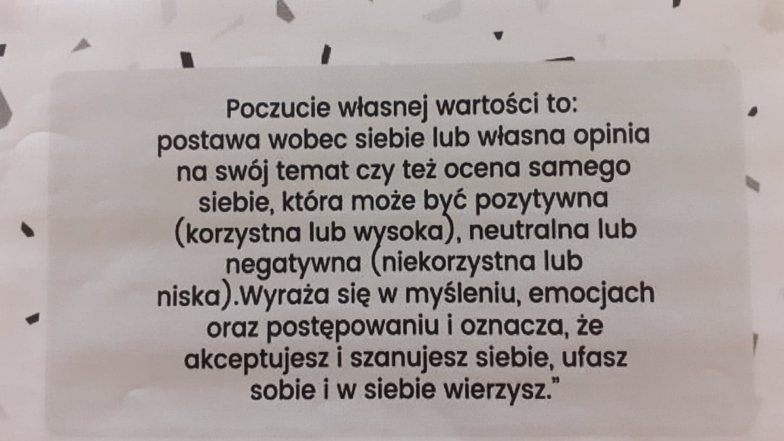 Podczas spotkania nasi goście usłyszeli bajkę dla dorosłych pt..: „W poszukiwaniu siebie” Agnieszki Kozak oraz fragment przypowieści ze wschodu z rozdziału „ Swoją siłę możesz czerpać z wolności” z książki pt.: „Kochaj siebie ! Idealnie doskonałe” Anny Dereszowskiej. Bibliotekarka opowiadała także słuchaczom o pięciu krokach: jak wzmocnić swoją samoocenę, myśleć i mówić o sobie dobrze, odkrywać swoje pasje, akceptować siebie, być odpowiedzialnym za siebie i budować swój pozytywny obraz. Jednym ze sposobów na akceptację samego siebie jest oddanie się swoim pasjom i zainteresowaniom dlatego podczas zabawy psychologicznej „Mój przyjaciel JA” każdy mógł napisać o swoich pomysłach i działaniach „ Co zrobię dzisiaj aby być szczęśliwym”? W trakcie dyskusji zostało ujawnionych wiele talentów i zalet uczestników oraz pomysłów na bycie szczęśliwym. Istotnym elementem zajęć było poszukiwanie motywacji do działania, odkrywanie swoich mocnych stron oraz stworzenie klimatu samoakceptacji.
