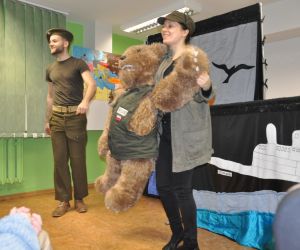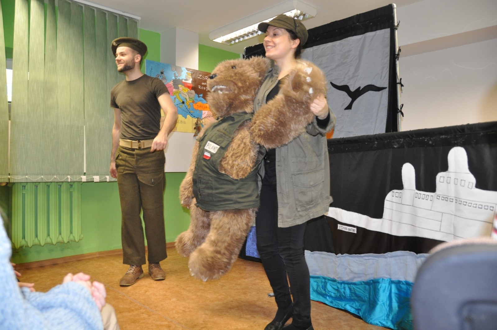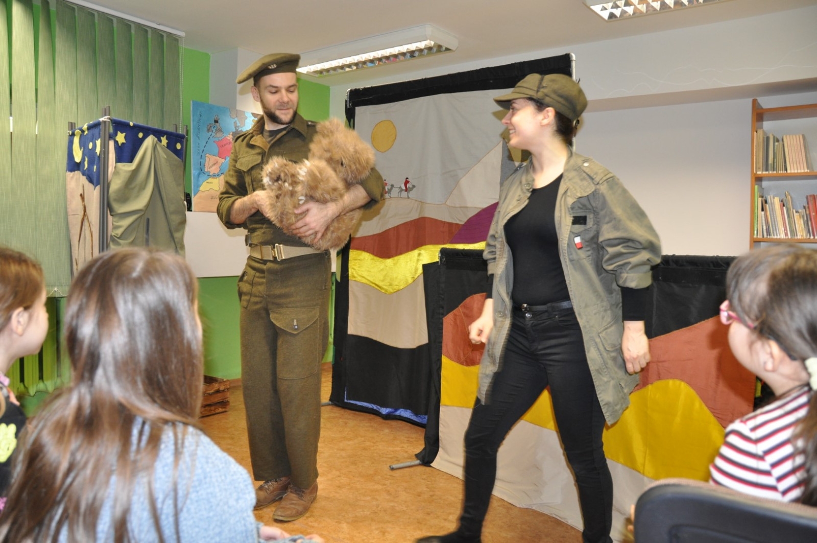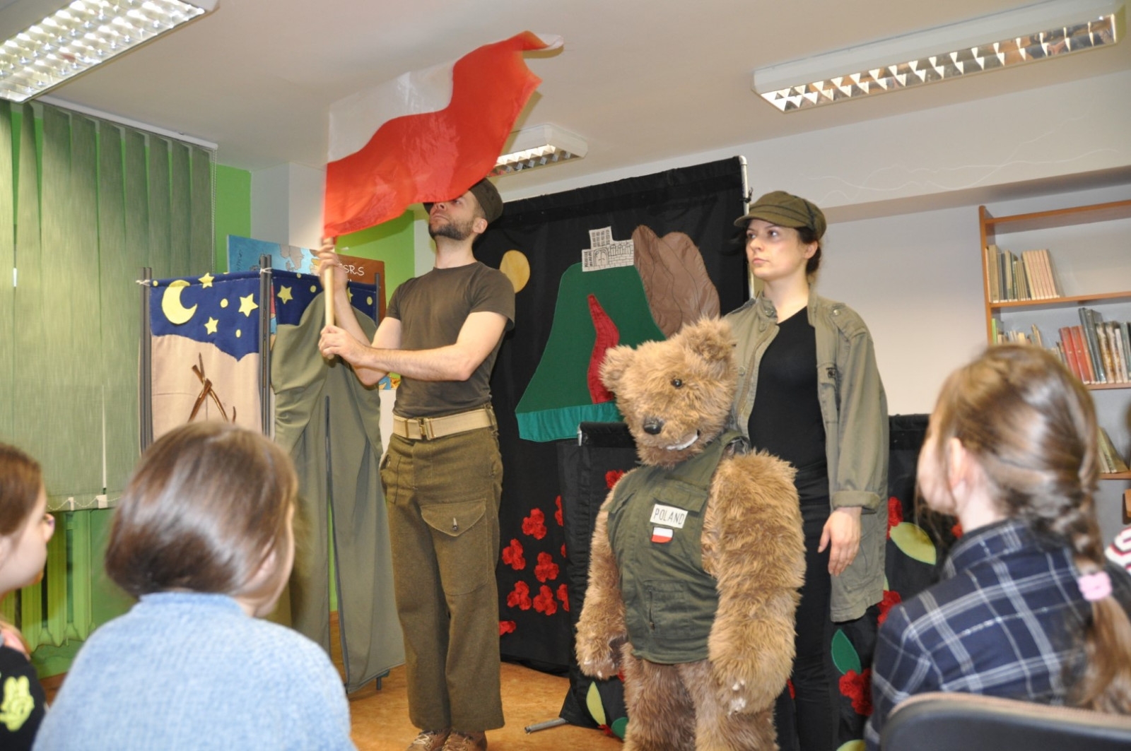 24 marca 2023 r. w Filii nr 3 dzięki współpracy z Oddziałem Instytutu Pamięci Narodowej w Lublinie odbyło się przedstawienie teatralne pt.:„ Historia Misia Wojtka”. Pani Anna Ałaj i Pan Jarosław Rodzeń, aktorzy biorący udział w wydarzeniu: zaprezentowali dzieciom niezwykły spektakl poświęcony historii niedźwiedzia Wojtka, który przeszedł szlak bojowy z II Korpusem Armii gen. Andersa z Iranu przez Monte Cassino aż do Edynburga w Szkocji. Przedstawienie obejrzeli zaproszeni uczniowie z klas I e i II b ze Szkoły Podstawowej nr 4 w Łęcznej z wychowawcami: Ewą Żelechowską i Wiolettą Tchórzewską, Pani Monika Mazurkiewicz Dyrektor Miejsko – Gminnej Biblioteki Publicznej im. Z. Herberta w Łęcznej, Pani Monika Bogusz Dyrektor Powiatowej Biblioteki w Łęcznej oraz pracownicy biblioteki. Prawdziwa historia niedźwiedzia Wojtka wydarzyła się podczas II wojny światowej. Czworonożny przyjaciel żołnierzy z Armii Andersa, brał udział w bitwie o Monte Cassino, pomagał nosić ciężkie skrzynie z amunicją i został uwieczniony w oficjalnym emblemacie 22. Kompanii Zaopatrywania Artylerii 2. Korpusu Polskiego. Był autentycznym towarzyszem broni, zasłużonym i podziwianym przez wszystkich polskim niedźwiedziem – żołnierzem. Po zakończeniu szlaku bojowego Armii gen. Andersa niedźwiedź Wojtek do końca swoich dni przebywał w ZOO w Edynburgu, gdzie zawsze żywo reagował na język polski. Aktorzy w niezwykły sposób przekazali historię niedźwiedzia Wojtka splecioną z losami żołnierzy Armii gen. Andersa. Interesujące i zrozumiałe dialogi. Piękne teksty piosenek, ciekawe rekwizyty i patriotyczne tło przedstawienia sprawiły, że wszyscy słuchacze z radością przenieśli się w niezwykły świat wędrówki „Misia Wojtka”. Dzieci spontanicznie i żywiołowo brały udział w spektaklu i wspólnie z aktorami śpiewały piosenki o „szeregowym Wojtku”. Wszyscy uczestnicy byli zachwyceni profesjonalnym przygotowaniem przedstawienia i ciekawą grą aktorów. Składamy serdeczne podziękowania dla Oddziału Instytutu Pamięci Narodowej w Lublinie za możliwość udziału w przedstawieniu, pani Annie Ałaj i panu Jarosławowi Rodzeniowi za mistrzowskie przedstawienie „Historii Misia Wojtka” a naszym gościom za przybycie i wspólne obejrzenie spektaklu. Do zobaczenia w bibliotece.
